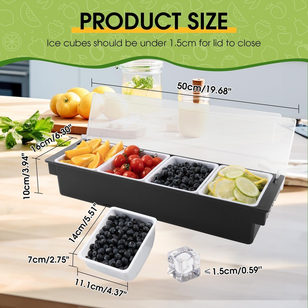 Chilled Condiment Server with Lid - 5 Removable Compartments, Condiment Serving Tray with Ice Tray & Free Mat, Clear Fruit Organizer with Ice Chamber, Perfect for BBQs, Mimosa Bars & Parties ORGANIZE CONDIMENTS & GARNISHES - Our portable Condiment Container has multi trays that have enough space to hold party food items, such as olives, pickles, fruit slices, nuts, sauces and salad dips. KEEPS FOOD FRESH - Need to keep your food nice and cool? Underneath the trays, there is space for you to place ice cubes, which will keep your fruits and veggies nicely chilled and ready to serve. EASY TO CLEAN - To thoroughly clean this condiment caddy, just remove all the trays and place them on the top rack of your dishwasher. Wipe down the rest of the caddy with a clean cloth. PORTABLE & EASY TO TRANSPORT - Made of sturdy yet lightweight plastic and fitted with ergonomic finger grips on each side, our condiment dispenser can be carried around effortlessly by hand. FOR ANY OCCASION: These tray organizers are perfect for restaurant buffets and bars, picnics, barbecues, and indoor/outdoor catering parties. Even use as a coffee bar organizer, taco bar party supplies, juice bar station!