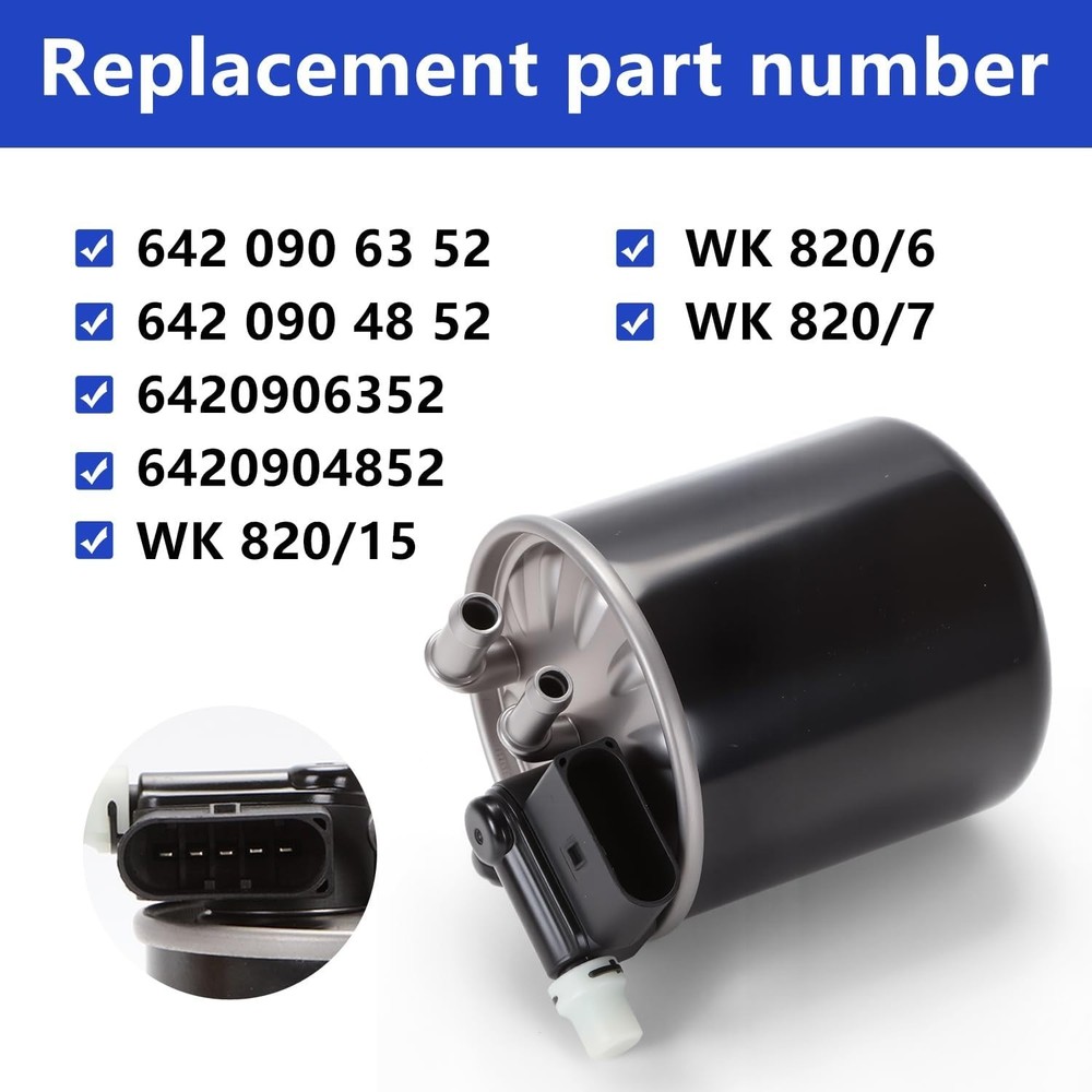 Replace Parts WK 820/15,WK 820/6,WK 820/7,642 090 63 52 (6420906352),642 090 48 52 (6420904852),A 642 090 63 52,A 642 090 48 52 Vehicle Fitment Replacement For Benz Sprinter 2500 3500 3.0L V6 Diesel 2010-2021, E350 Diesel 2010-2013, GL350 Diesel 2010-2014, ML350 Diesel 2010-2014, R350 Diesel 2010-2012 Optimized Design The carefully designed structure optimizes the fuel flow and minimizes the pressure loss. During high-efficiency filtration, it can maintain a stable fuel flow and ensure stable engine power output. High- Efficiency Filtration The filter uses advanced and high-efficiency filtration media, and the filtration efficiency of impurities such as dust, rust, and dirt exceeds 99%, effectively preventing them from entering the fuel injection system and protecting key components such as injectors and oil pumps. Payment We accept payment via Paypal,Google Pay,VISA,Master Card,American Express,Discover,eBay Mastercard payment . Shipping All items will be shipped to buyer's eBay address. Please make sure your address in eBay matches the address you would like us to ship to before payment. Easy Return If you are unhappy with your purchase for any reason, US buyers can return it to us in an un-used condition in the original packaging within 30 days of purchase and we'll give you a refund or exchange. The refund/Exchange will not include postage/eBay costs. Please note you MUST contact us to obtain a Return Authorization Number before returning any part. Any parcel without the Return Authorization Number will be rejected. If your item is faulty or was incorrect, you must contact our sales representative before returning the parcel and we will endeavour to solve the problem effectively. Video or picture is required to show the item condition before we issue the Return Authorization Number. Important notice: 1. Any returned item(s) without Return authorization number will be rejected. 2. Please return your item(s) in original packaging and ensure that all packages are securely wrapped. 3. We will not accept responsibility for loss or damage of goods during transit, please ensure that the insurance cover option is taken where possible. Feedback We aim to maintain high standards of service and strive to achieve 100% customer satisfaction! Your feedback is very important to us, and we sincerely hope that you can contact us immediately before providing us with neutral or negative feedback, so that we can solve your problem satisfactorily.