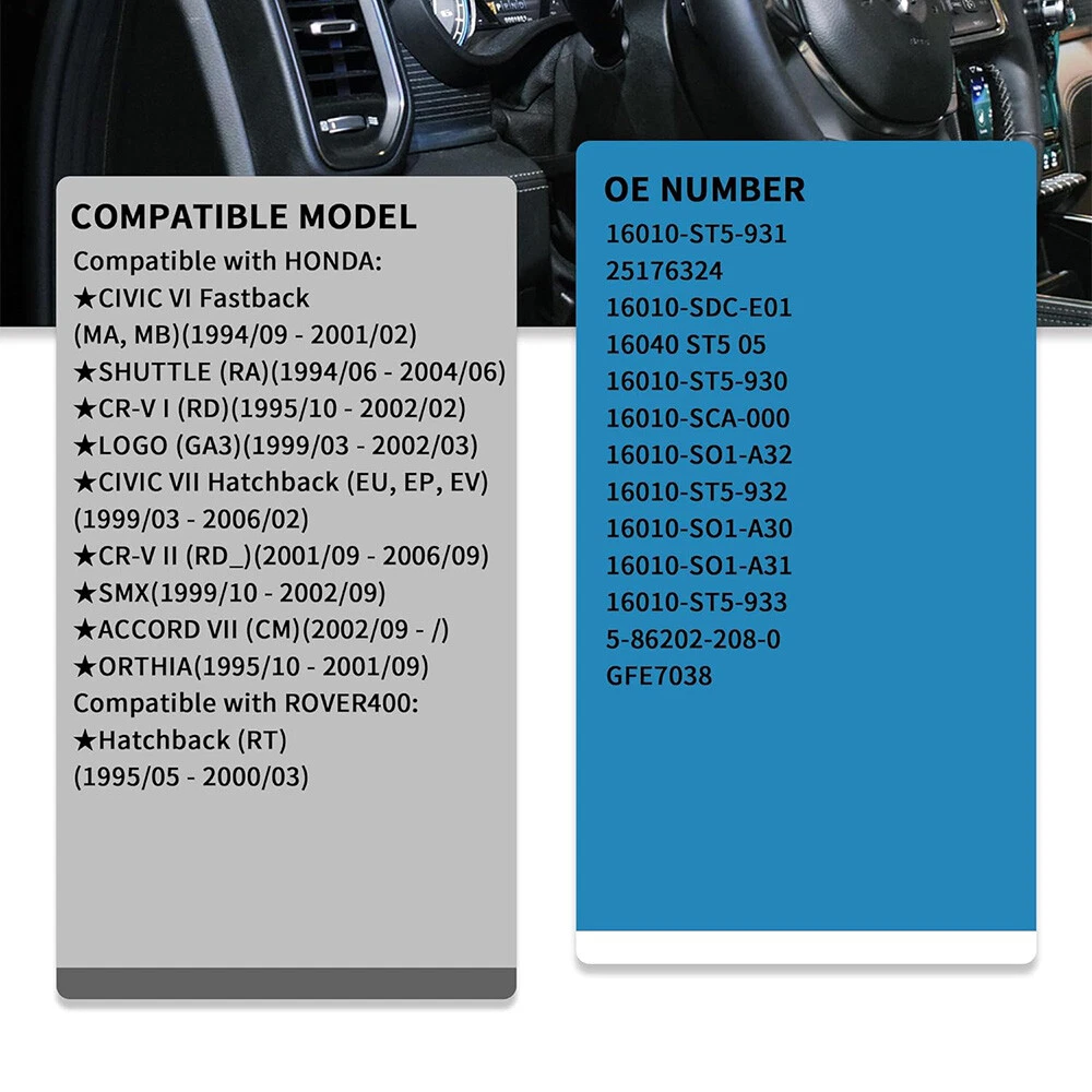 [COMPATIBILITY] - Compatible with Honda: Civic 1995-2000 Accord 1994-1997 Odyssey 1995-1998 Civic del Sol 1995-1997 Prelude 1997-2001 RL 1996-2004 CL 1997-1999 EL 1996-2000 [OE NUMBER] -16010-ST5-931 25176324 16010-SDC-E01 16040 ST5 05 16010-ST5-930 16010-SCA-000 16010-SO1-A32 16010-ST5-932 16010-SO1-A30 16010-SO1-A31 16010-ST5-933 5-86202-208-0 GFE7038 [EASY TO INSTALL] - This Fuel Filter are easy to use, but if you don't have a similar experience, we recommend to ask support from the automotive specialist. [REMINDERS] - Please must read our description and pictures carefully to check details about our Fuel Filter,it must be completely the same,Or it will not fit your vehicle.If you can not make sure about your vehicle's fitment,you can contact us to get more information you need. [SATISFACTION] - Brand new and high-quality Fuel Filter. Part Number: 16010-ST5-931, 16010ST5931, 16010 ST5 931, 16010-ST5-E02 Reference Part Number: 16010-ST5-E02,16010ST5E02,16010-ST5-931,16010-ST5-933,16010-ST5-932 , 71632,F44870, G6511,043-0995 ,33559 , G7599 Compatible with: For 1999 ACURA 2.3CL 2.3L For 1999 ACURA 3.0CL 3.0L V6 For 1999 ACURA 3.5RL 3.5L V6 For 1999 ACURA INTEGRA 1.8L RS/ LS/ SE/GS For 1999 ACURA INTEGRA 1.8L GS-R For 1999 ACURA INTEGRA 1.8L TYPE-R For 1999 HONDA CIVIC 1.6L CX/DX/LX For 1999 HONDA CIVIC 1.6L EX/GX/HX W/O ABS For 1999 HONDA CIVIC 1.6L EX ABS For 1999 HONDA CIVIC 1.6L GX ABS For 1999 HONDA CIVIC 1.6L Si For 1999 HONDA CR-V 2.0L W/O ABS For 1999 HONDA CR-V 2.0L ABS For 1999 HONDA PRELUDE 2.2L For 1998 ACURA 2.3CL 2.3L For 1998 ACURA 2.5TL 2.5L L5 For 1998 ACURA 3.0CL 3.0L V6 For 1998 ACURA 3.2TL 3.2L V6 For 1998 ACURA 3.5RL 3.5L V6 For 1998 ACURA INTEGRA 1.8L GS/LS For 1998 ACURA INTEGRA 1.8L GS-R For 1998 ACURA INTEGRA 1.8L RS For 1998 HONDA CIVIC 1.6L CX/DX/LX For 1998 HONDA CIVIC 1.6L EX/GX/HX W/O ABS For 1998 HONDA CIVIC 1.6L EX/GX ABS For 1998 HONDA CR-V 2.0L W/O ABS For 1998 HONDA CR-V 2.0L ABS For 1998 HONDA ODYSSEY 2.2L For 1998 HONDA PRELUDE 2.2L For 1998 ISUZU OASIS 2.3L For 1997 HONDA CR-V 2.0L W/O ABS For 1997 HONDA CR-V 2.0L ABS For 1997 HONDA ODYSSEY 2.2L For 1997 HONDA PRELUDE 2.2L For 1997 ISUZU OASIS 2.2L Package including: 1x Fuel Filter