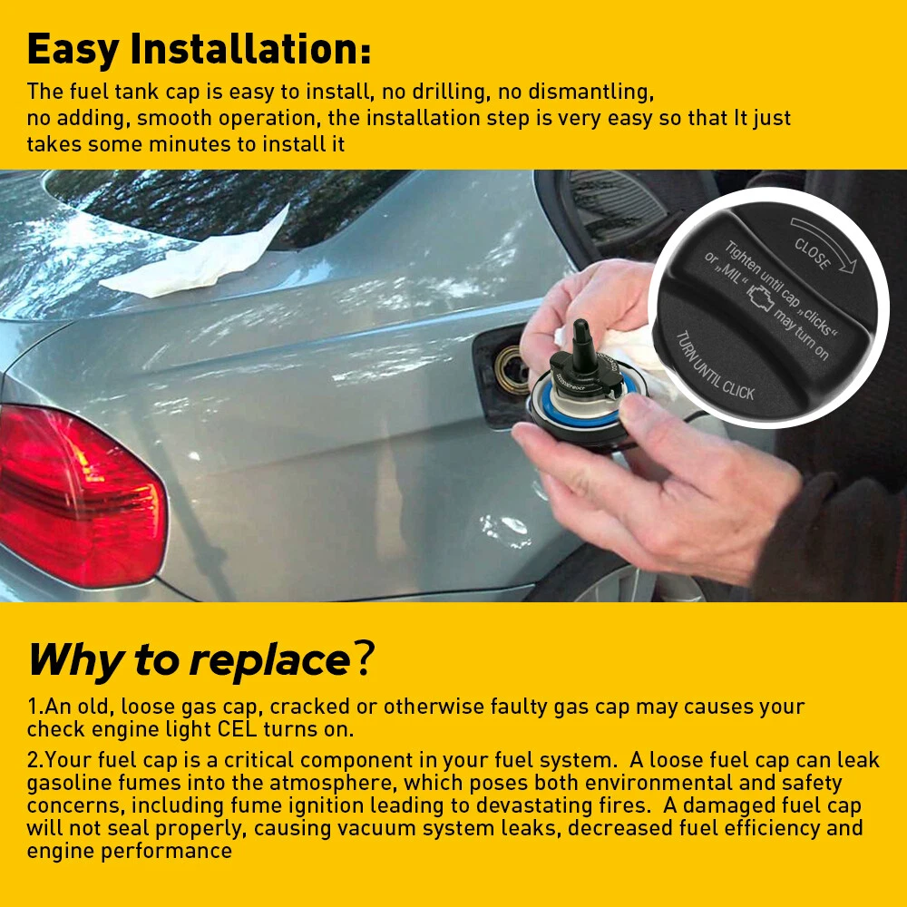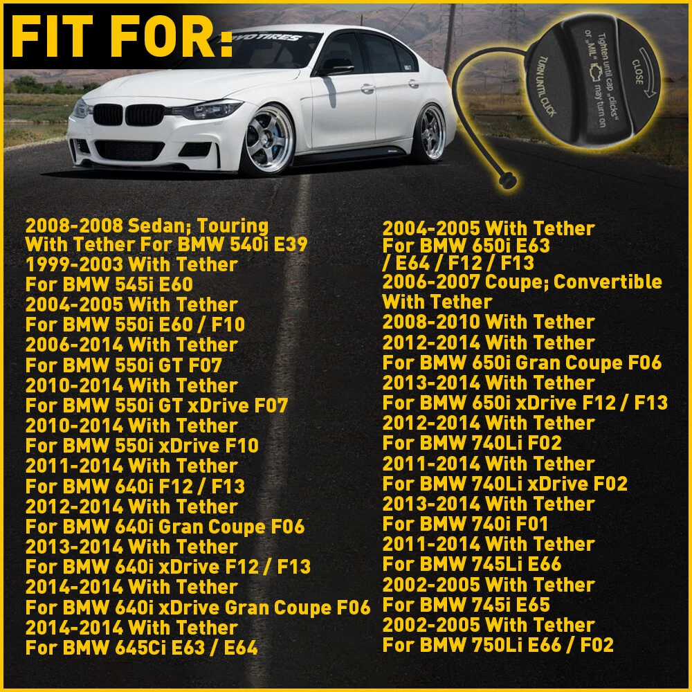 Fit for: For BMW 1 Series M E82 2011-2011 With Tether For BMW 128i E82 2008-2013 With Tether For BMW 135i E82 / E88 2008-2013 With Tether For BMW 320i F30 2012-2014 With Tether For BMW 320i xDrive F30 2013-2014 With Tether For BMW 323Ci E46 2000-2000 With Tether For BMW 323i E46 1999-2000 With Tether For BMW 325Ci E46 2001-2006 With Tether For BMW 325i E90 2001-2006 With Tether For BMW 325xi E90 2001-2006 With Tether For BMW 328Ci E46 2000-2000 With Tether For BMW 328i E36 / E46 / E90 / E92 / E93 1999-1999 From August 1999 Fuel Gas Tank Filler For BMW Cap 435i 525i 528i 530i 535i 540i 545i 550i 640i Fit for: For BMW 1 Series M E82 2011-2011 With Tether For BMW 128i E82 2008-2013 With Tether For BMW 135i E82 / E88 2008-2013 With Tether For BMW 320i F30 2012-2014 With Tether For BMW 320i xDrive F30 2013-2014 With Tether For BMW 323Ci E46 2000-2000 With Tether For BMW 323i E46 1999-2000 With Tether For BMW 325Ci E46 2001-2006 With Tether For BMW 325i E90 2001-2006 With Tether For BMW 325xi E90 2001-2006 With Tether For BMW 328Ci E46 2000-2000 With Tether For BMW 328i E36 / E46 / E90 / E92 / E93 1999-1999 From August 1999 with Tether 2000-2000 With Tether 2007-2007 With Tether 2008-2008 With Tether 2009-2014 With Tether For BMW 328i GT xDrive F34 2014-2014 With Tether For BMW 328i xDrive F30 / F31 / E90 / E92 / E93 2009-2014 With Tether For BMW 328xi E90 / E91 / E92 / E93 2007-2007 With Tether 2008-2008 With Tether For BMW 330Ci E46 2001-2006 With Tether For BMW 330i E90 2001-2006 With Tether For BMW 330xi E90 2001-2006 With Tether For BMW 335i E90 2007-2008 Sedan With Tether 2009-2014 With Tether For BMW 335i GT xDrive F34 2014-2014 With Tether For BMW 335i xDrive F30 / E90 / E92 2009-2014 With Tether For BMW 335is E92 / E93 2011-2013 With Tether For BMW 335xi E90 2007-2008 Sedan With Tether For BMW 428i F32 / F33 2014-2014 With Tether For BMW 428i xDrive F32 2014-2014 With Tether For BMW 435i F32 / F33 2014-2014 With Tether For BMW 435i xDrive F32 2014-2014 With Tether For BMW 525i E60 / E39 2001-2001 With Tether 2003-2003 With Tether 2004-2007 With Tether For BMW 525xi E60 / E61 2006-2007 Sedan; Touring With Tether For BMW 528i E60 / E39 / F10 1999-1999 With Tether 2000-2000 With Tether 2008-2008 With Tether 2009-2012 With Tether 2013-2014 With Tether For BMW 528i xDrive F10 / E60 2009-2010 With Tether 2012-2014 With Tether For BMW 528xi E60 2008-2008 With Tether For BMW 530i E60 2001-2007 With Tether For BMW 530xi E60 / E61 2006-2007 Sedan; Touring With Tether For BMW 535i E60 / F10 2008-2014 With Tether For BMW 535i GT F07 2010-2014 With Tether For BMW 535i GT xDrive F07 2011-2014 With Tether For BMW 535i xDrive F10 2009-2014 With Tether For BMW 535xi E60 / E61 2008-2008 Sedan; Touring With Tether For BMW 540i E39 1999-2003 With Tether For BMW 545i E60 2004-2005 With Tether For BMW 550i E60 / F10 2006-2014 With Tether For BMW 550i GT F07 2010-2014 With Tether For BMW 550i GT xDrive F07 2010-2014 With Tether For BMW 550i xDrive F10 2011-2014 With Tether For BMW 640i F12 / F13 2012-2014 With Tether For BMW 640i Gran Coupe F06 2013-2014 With Tether For BMW 640i xDrive F12 / F13 2014-2014 With Tether For BMW 640i xDrive Gran Coupe F06 2014-2014 With Tether For BMW 645Ci E63 / E64 2004-2005 With Tether For BMW 650i E63 / E64 / F12 / F13 2006-2007 Coupe; Convertible With Tether 2008-2010 With Tether 2012-2014 With Tether For BMW 650i Gran Coupe F06 2013-2014 With Tether For BMW 650i xDrive F12 / F13 2012-2014 With Tether For BMW 740Li F02 2011-2014 With Tether For BMW 740Li xDrive F02 2013-2014 With Tether For BMW 740i F01 2011-2014 With Tether For BMW 745Li E66 2002-2005 With Tether For BMW 745i E65 2002-2005 With Tether For BMW 750Li E66 / F02 2006-2014 With Tether For BMW 750Li xDrive F02 2010-2014 With Tether For BMW 750i E65 / F01 2006-2014 With Tether For BMW 750i xDrive F01| 2010-2014 With Tether For BMW 760Li E66 / F02 2003-2014 w/ Tether For BMW 760i E65 2004-2006 With Tether For BMW ActiveHybrid 3 F30 2013-2014 With Tether For BMW ActiveHybrid 5 f10 2012-2014 With Tether For BMW Alpina B7 F01 2007-2008 With Tether 2011-2014 With Tether For BMW Alpina B7 xDrive F01 2011-2014 With Tether For BMW Alpina B7L F02 2011-2014 With Tether For BMW Alpina B7L xDrive F02 2011-2014 With Tether For BMW M3 E46 / E90 / E92 / E93 2001-2006 With Tether 2008-2013 With Tether For BMW M5 E60 / F10 2001-2003 With Tether 2006-2010 With Tether 2013-2014 With Tether For BMW M6 E63 / E64 / F12 / F13 2006-2007 Coupe; Convertible With Tether 2008-2014 w/ Tether For BMW M6 Gran Coupe F06 2014-2014 With Tether For BMW X1 E84 2012-2014 With Tether For BMW X3 E83 / E83 / F25 2004-2005 w/ Tether 2006-2006 3.0L; w/ Tether 2007-2014 w/ Tether For BMW X5 E70 / F15 2007-2009 With Tether 2010-2010 L6; 3.0L With Tether 2010-2010 V8; 4.4L With Tether 2010-2010 V8; 4.8L With Tether 2011-2011 L6; 3.0L With Tether 2011-2011 V8; 4.4L With Tether 2012-2014 3.0L With Tether 2012-2014 4.4L With Tether For BMW X6 E71 2008-2009 With Tether 2010-2011 GAS; M With Tether 2010-2011 GAS; xDrive35i With Tether 2010-2011 GAS; xDrive50i With Tether 2012-2014 With Tether For BMW Z4 E85 / E89 2003-2004 With Tether 2009-2012 With Tether For Mini Cooper 2002-2004 R50 / R53 With Tether 2005-2006 R50 / R52 / R53 With Tether 2007-2007 R52 /R56 With Tether 2008-2008 R52 / R55 / R56 With Tether 2009-2009 R56 / R57 / R55 With Tether 2010-2010 R56 / R57 / R55 With Tether 2011-2011 R56 / R57/ R55 With Tether 2012-2012 R55 / R56 / R57 / R58 / R59 With Tether 2013-2013 R55 / R56 / R57 / R58 R59 With Tether For Mini Cooper Countryman 2011-2013 R60 With Tether Specifications: OE: 16117222391,16116756772,16116754491,16111184668, 16111756722, 34102??16110149425, 16116754634, 16116759042, 16116759252, 16116765045, 16116765046, 16117224480??16110392413 Material: ABS+rubber Features: *Easy installation The fuel tank cap with smooth operation is easy to install,drilling,dismanting and adding are not needed. *high performance The fuel filler cap is made of ABS 