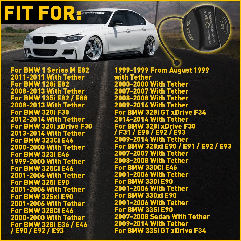 Fit for: For BMW 1 Series M E82 2011-2011 With Tether For BMW 128i E82 2008-2013 With Tether For BMW 135i E82 / E88 2008-2013 With Tether For BMW 320i F30 2012-2014 With Tether For BMW 320i xDrive F30 2013-2014 With Tether For BMW 323Ci E46 2000-2000 With Tether For BMW 323i E46 1999-2000 With Tether For BMW 325Ci E46 2001-2006 With Tether For BMW 325i E90 2001-2006 With Tether For BMW 325xi E90 2001-2006 With Tether For BMW 328Ci E46 2000-2000 With Tether For BMW 328i E36 / E46 / E90 / E92 / E93 1999-1999 From August 1999 Fuel Gas Tank Filler For Cap BMW 435i 525i 528i 530i 535i 540i 545i 550i 640i Fit for: For BMW 1 Series M E82 2011-2011 With Tether For BMW 128i E82 2008-2013 With Tether For BMW 135i E82 / E88 2008-2013 With Tether For BMW 320i F30 2012-2014 With Tether For BMW 320i xDrive F30 2013-2014 With Tether For BMW 323Ci E46 2000-2000 With Tether For BMW 323i E46 1999-2000 With Tether For BMW 325Ci E46 2001-2006 With Tether For BMW 325i E90 2001-2006 With Tether For BMW 325xi E90 2001-2006 With Tether For BMW 328Ci E46 2000-2000 With Tether For BMW 328i E36 / E46 / E90 / E92 / E93 1999-1999 From August 1999 with Tether 2000-2000 With Tether 2007-2007 With Tether 2008-2008 With Tether 2009-2014 With Tether For BMW 328i GT xDrive F34 2014-2014 With Tether For BMW 328i xDrive F30 / F31 / E90 / E92 / E93 2009-2014 With Tether For BMW 328xi E90 / E91 / E92 / E93 2007-2007 With Tether 2008-2008 With Tether For BMW 330Ci E46 2001-2006 With Tether For BMW 330i E90 2001-2006 With Tether For BMW 330xi E90 2001-2006 With Tether For BMW 335i E90 2007-2008 Sedan With Tether 2009-2014 With Tether For BMW 335i GT xDrive F34 2014-2014 With Tether For BMW 335i xDrive F30 / E90 / E92 2009-2014 With Tether For BMW 335is E92 / E93 2011-2013 With Tether For BMW 335xi E90 2007-2008 Sedan With Tether For BMW 428i F32 / F33 2014-2014 With Tether For BMW 428i xDrive F32 2014-2014 With Tether For BMW 435i F32 / F33 2014-2014 With Tether For BMW 435i xDrive F32 2014-2014 With Tether For BMW 525i E60 / E39 2001-2001 With Tether 2003-2003 With Tether 2004-2007 With Tether For BMW 525xi E60 / E61 2006-2007 Sedan; Touring With Tether For BMW 528i E60 / E39 / F10 1999-1999 With Tether 2000-2000 With Tether 2008-2008 With Tether 2009-2012 With Tether 2013-2014 With Tether For BMW 528i xDrive F10 / E60 2009-2010 With Tether 2012-2014 With Tether For BMW 528xi E60 2008-2008 With Tether For BMW 530i E60 2001-2007 With Tether For BMW 530xi E60 / E61 2006-2007 Sedan; Touring With Tether For BMW 535i E60 / F10 2008-2014 With Tether For BMW 535i GT F07 2010-2014 With Tether For BMW 535i GT xDrive F07 2011-2014 With Tether For BMW 535i xDrive F10 2009-2014 With Tether For BMW 535xi E60 / E61 2008-2008 Sedan; Touring With Tether For BMW 540i E39 1999-2003 With Tether For BMW 545i E60 2004-2005 With Tether For BMW 550i E60 / F10 2006-2014 With Tether For BMW 550i GT F07 2010-2014 With Tether For BMW 550i GT xDrive F07 2010-2014 With Tether For BMW 550i xDrive F10 2011-2014 With Tether For BMW 640i F12 / F13 2012-2014 With Tether For BMW 640i Gran Coupe F06 2013-2014 With Tether For BMW 640i xDrive F12 / F13 2014-2014 With Tether For BMW 640i xDrive Gran Coupe F06 2014-2014 With Tether For BMW 645Ci E63 / E64 2004-2005 With Tether For BMW 650i E63 / E64 / F12 / F13 2006-2007 Coupe; Convertible With Tether 2008-2010 With Tether 2012-2014 With Tether For BMW 650i Gran Coupe F06 2013-2014 With Tether For BMW 650i xDrive F12 / F13 2012-2014 With Tether For BMW 740Li F02 2011-2014 With Tether For BMW 740Li xDrive F02 2013-2014 With Tether For BMW 740i F01 2011-2014 With Tether For BMW 745Li E66 2002-2005 With Tether For BMW 745i E65 2002-2005 With Tether For BMW 750Li E66 / F02 2006-2014 With Tether For BMW 750Li xDrive F02 2010-2014 With Tether For BMW 750i E65 / F01 2006-2014 With Tether For BMW 750i xDrive F01| 2010-2014 With Tether For BMW 760Li E66 / F02 2003-2014 w/ Tether For BMW 760i E65 2004-2006 With Tether For BMW ActiveHybrid 3 F30 2013-2014 With Tether For BMW ActiveHybrid 5 f10 2012-2014 With Tether For BMW Alpina B7 F01 2007-2008 With Tether 2011-2014 With Tether For BMW Alpina B7 xDrive F01 2011-2014 With Tether For BMW Alpina B7L F02 2011-2014 With Tether For BMW Alpina B7L xDrive F02 2011-2014 With Tether For BMW M3 E46 / E90 / E92 / E93 2001-2006 With Tether 2008-2013 With Tether For BMW M5 E60 / F10 2001-2003 With Tether 2006-2010 With Tether 2013-2014 With Tether For BMW M6 E63 / E64 / F12 / F13 2006-2007 Coupe; Convertible With Tether 2008-2014 w/ Tether For BMW M6 Gran Coupe F06 2014-2014 With Tether For BMW X1 E84 2012-2014 With Tether For BMW X3 E83 / E83 / F25 2004-2005 w/ Tether 2006-2006 3.0L; w/ Tether 2007-2014 w/ Tether For BMW X5 E70 / F15 2007-2009 With Tether 2010-2010 L6; 3.0L With Tether 2010-2010 V8; 4.4L With Tether 2010-2010 V8; 4.8L With Tether 2011-2011 L6; 3.0L With Tether 2011-2011 V8; 4.4L With Tether 2012-2014 3.0L With Tether 2012-2014 4.4L With Tether For BMW X6 E71 2008-2009 With Tether 2010-2011 GAS; M With Tether 2010-2011 GAS; xDrive35i With Tether 2010-2011 GAS; xDrive50i With Tether 2012-2014 With Tether For BMW Z4 E85 / E89 2003-2004 With Tether 2009-2012 With Tether For Mini Cooper 2002-2004 R50 / R53 With Tether 2005-2006 R50 / R52 / R53 With Tether 2007-2007 R52 /R56 With Tether 2008-2008 R52 / R55 / R56 With Tether 2009-2009 R56 / R57 / R55 With Tether 2010-2010 R56 / R57 / R55 With Tether 2011-2011 R56 / R57/ R55 With Tether 2012-2012 R55 / R56 / R57 / R58 / R59 With Tether 2013-2013 R55 / R56 / R57 / R58 R59 With Tether For Mini Cooper Countryman 2011-2013 R60 With Tether Specifications: OE: 16117222391,16116756772,16116754491,16111184668, 16111756722, 34102??16110149425, 16116754634, 16116759042, 16116759252, 16116765045, 16116765046, 16117224480??16110392413 Material: ABS+rubber Features: *Easy installation The fuel tank cap with smooth operation is easy to install,drilling,dismanting and adding are not needed. *high performance The fuel filler cap is made of ABS 
