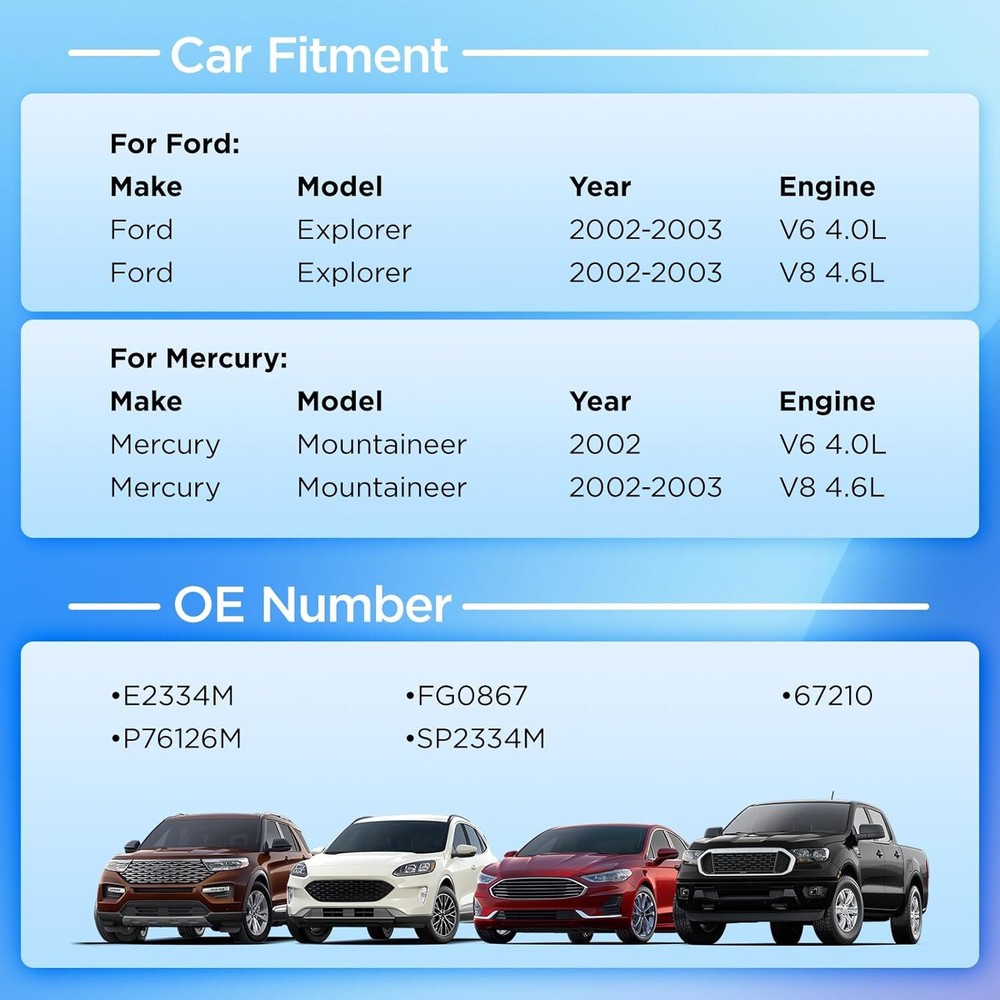 Fuel Pump Assembly For Ford Explorer Mercury Mountaineer 2002-2003 V6 E2334M Product Type:Electric Fuel Pump Assembly OE Number:E2334M,P76126M,FG0867,SP2334M,67210 Vehicle Information: Make Model Year Engine Body?Style Notes Ford Explorer 2002-2003 V6?4.0L Sport?Utility ?VIN?E,?w/7?Pin?Connector,?To?12/10/02 Ford Explorer 2003 V8?4.6L Sport?Utility To?12/9/02 Ford Explorer 2002 V8?4.6L Sport?Utility Ford Explorer 2003 V6?4.0L Stripped?Chassis VIN?E,?w/7?Pin?Connector,?To?12/10/02 Ford Explorer 2002 V6?4.0L Stripped?Chassis VIN?E,?w/7?Pin?Connector Mercury Mountaineer 2002 V6?4.0L Sport?Utility VIN?E,?w/7?Pin?Connector Mercury Mountaineer 2003 V8?4.6L Sport?Utility TO?12/9/02 Mercury Mountaineer 2002 V8?4.6L Sport?Utility Product Specifications: Product Type:Fuel Pump Assembly Inlet Type:Strainer Sending Unit Inclued:Yes Sealing Ring:Yes Float Included:Yes Voltage:12V Package Quantity:1 Packaging Type:Box Fitment:Direct Replacement Testing: 100% Testing Before Packing 100% Leakaging And Fuel Level Sensor Testing 100% Fuel Level Sensor and Visual Inspection Laboratory Ability: According to the SAE J 1537 Standard: CMM, Pull & Push testing,?Salt Spray Testing, Comprehensive Testing Vibration Testing,?Hardness Testing, Fuel pump life testing,?Fuel level sensor life testing Thermal Cycling Testing, Vibration-Temperature-Humidity comprehensive testing Main Equipment: Raw material-Central feeding system Injection molding machine Fanuc Robot workgroup Full-automatic armature line Certifications: ISO/TS 16949 SGS Certificate ITS Report QS9000 Production Environment : Fuel Pump Clean Room,?Module Assembly Workshop The New Design of Module Assembly: Keep the fuel pump work reliable for a long time in the tank under the low fuel level Payment Delivery details Terms of sales About us Contact us Payment 1.We only accept PayPal. PayPal is the only online payment method we accept. Please make sure you have a valid/confirmed PayPal account prior bidding. 2.All Paypal Payments must be Confirmed. Payment must be made within 48hrs of the auction end time. Non-Paying bidders will be reported. 3.When you get your package,maybe you will pay some charges, it's taxes for local customs,not pay to us, and the fees are depends on the customs, all buyer are same. Delivery details 1.Items will be shipped within 2 business days after payment is received. 2.We ship to your eBay address. Please make sure your eBay address is correct. Buyer takes responsibility if eBay address is wrong. 3.Import duties, taxes and charges are not included in the item price or shipping charges. Please check with your country customs office for these additional charges. 4.We shipping using UPS or USPS from our nearest warehouse to you. Tracking numbers will be emailed upon shipment. Terms of sales 1.Please feel free to email us if you have any question. 2.We appreciate you contact us via eBay message when you are not satisfied rather than open case or leave negative feedback directly. We'll try our best to solve the issue. 3.Refund will be issued once we receive your returned items. Buyer is responsible for all return shipping charges. 4.Please contact us for return process before you return the item. 5.All items for exchange or refund must be returned in "as new" condition. About us We are the responsible seller ,always provide high-quality products and best service .If you have any questions, please contact us, and will try our best to help you. Please contact us by eBay Message, and we will reply you within 24 hours. Thank you very much! Contact us We are the professional auto parts manufacturer , and provide line lock, AN hose end fittings , fuel line , fuel filter , fuel regulator , exhaust cutout , exhaust tips , exhaust muffler and so on .The quality of the product to be secured. If you have any questions or any needs , please contact us , and will try our best to help you. Drive Type Electrical Flow Rate 45-55 gph Please Note VIN code Outlet Type Quick Connect Outlet Size 3/8 Inlet Type Strainer Outlet Count 1 Inlet Count 1 Terminal Type Round Pin Count 7 Terminal Gender Female Connector Shape Round Connector Gender Male Internal Or External Strainer External In Tank or External In Tank Wiring Harness Included No Voltage 12 V Gasket or Seal Included Yes Float Included Yes Package One Fuel Pump Vintage Part No Superseded Part Number E2334M OE/OEM Part Number 67210, P76126M Cross Part Number FG0867 Interchange Part Number 1L2Z9H307LD, 1L2Z9H307LC Weight 3 LB Fitment Type Direct Replacement Manufacturer Warranty 1 Year Placement on Vehicle Fuel Tank Color White Items Included Mounting Hardware Type Fuel Pump Brand Unbranded UPC Does not apply Manufacturer Part Number ADP11411205S Mounting Hardware Included No Fuel Type Gasoline Performance Part Yes