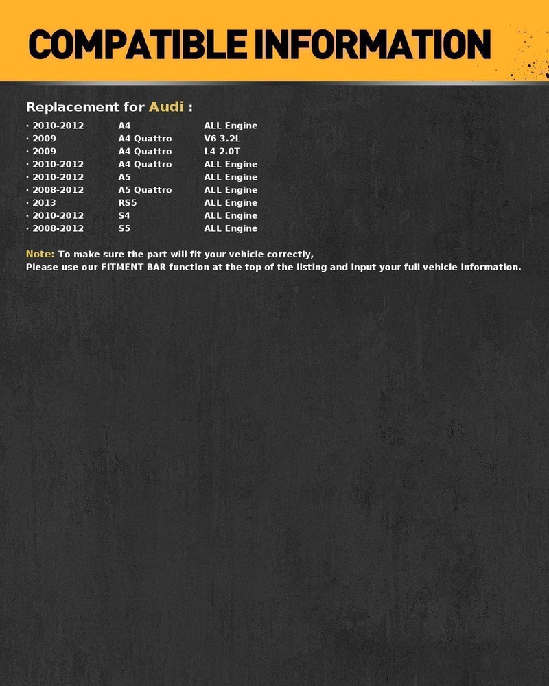 Advantages of KAC Fuel Pump Fuel supply: The Fuel pump assembly can provide stable fuel flow and pressure, ensuring the normal operation of the engine. Boosting: The Fuel pump assembly can increase the pressure of fuel, sending it into the high-pressure fuel rail to meet the needs of high-pressure fuel systems such as direct injection engines. Filtering: The fuel filter in the Fuel pump assembly can filter out impurities and pollutants in the fuel, preventing them from entering the engine. Pressure regulation: The pressure regulator in the electronic Fuel pump assembly is used to control the pressure of the fuel and ensure the stability of the fuel supply. Item Type: Electric Fuel Pump Assembly Condition: Brand New Warranty: One Year Warranty OE Number: E8880M, 66155, SP8880M, 8K0919051G, 0580202016 Quantity Sold: One Piece Note: It comes with 5+2 Blades, Not 4+5 Blades Vehicle Information: Make Model Year Engine Fuel Note Audi A4 2010-2012 L4 2.0L GAS with Sending Unit Audi A4 Quattro 2009-2012 L4 2.0L GAS with Sending Unit Audi A4 Quattro 2009 V6 3.2L GAS with Sending Unit Audi A5 2010-2012 L4 2.0L GAS with Sending Unit Audi A5 Quattro 2010-2012 L4 2.0L GAS with Sending Unit Audi A5 Quattro 2008-2010 V6 3.2L GAS with Sending Unit Audi RS5 2013 V8 4.2L GAS with Sending Unit Audi S4 2010-2012 V6 3.0L GAS with Sending Unit Audi S5 2010-2012 V6 3.0L GAS with Sending Unit Audi S5 2008-2012 V8 4.2L GAS with Sending Unit Product Specifications: Condition New Pressure Sensor No Sending Unit Inclued Yes Mounting Hardware Included Yes Sealing Ring Yes Float Included Yes Terminal Quantity 5+2 Strainer Included Yes Voltage 12V Package Quantity 1 Packaging Type Box Fitment Direct Replacement Payment Shipping Return Policy Contact Us About Warranty 1) we accepts all major credit cards via PayPal: MasterCard, Visa, American Express and Discover. 2) We will only ship to the confirmed PayPal shipping address given with the payment. Please make sure your PayPal and eBay address is correct. If not, please correct it before payment. Thank you. 3) If you want to ship to another address, please change your PayPal shipping address before you make payment. 4) To avoid initiating an unpaid item claim, please pay within 7 days. 5) Custom duties, taxes, or charges are not included in the cost you pay to us. We only ship this item to United States ! 1. We ship to your eBay address. Each package will be shipped by UPS or Fedex with tracking number. 2. Ship within 1 business day once payment completed. Orders placed on weekend will be shipped within 3 days. 4. Seriously promise: Refund or resend will be offered if item still not arrive in 7-10 business days. Just send us an email ,we will give you a satisfied solution as soon as possible. If you send us an e-mail, it will be answered within 48 hours during our working hours. Please feel free to contact us if you have any questions: Dear my friend,we appreciate your support.And our goal is service you well and give you a pleasant shopping time in our store. ✅Dear customer, when you want to return or exchange goods (Please contact us first, instead of directly initiating a dispute) 1: Contact the seller first 2: Send pictures: outer packaging&scanned labels&item itself&with complete accessories, etc necessary condition Rule A: The original packaging of the item is in an unused state. Rule B: The outer packaging must not have any damage. 3: Obtain return label 4: Delivered Projects - Payment Repayment ✅A 15% restocking and shelving fee will be charged for returns or exchanges that are not caused by the seller and are in good condition. Exchange will not charge restocking fees or shipping fees due to transportation errors ✅Priority In case of the following reasons, the freight will be borne by the buyer 1: Unexpected order 2: Find a better price 3: Change your mind 4: Buy more items/make mistakes/misread model information ✅Please note Missing accessories/quality issues/transportation damage, etc Please contact us first to obtain a good solution, rather than directly opening a return dispute. Thank you very much for your understanding. I hope we have a pleasant cooperation! Contact us if you have any question, Give us a chance to serve you, negative feedback could not solve anything, communication Please! ❎ (NO) Three stars is LOW star, NO 1,2,3 stars PLEASE! ✅(YES) Please give us Five-star! Have Question or Problem?? Step 1: Contact seller Step 2: Select the 1st topic: I have a question about using my item or I want to send the seller a message. NO others please! Step 3: Describe your question clearly; we will give you the best solution Please leave five stars positive feedback positive comment and Five-Stars. * We maintain a high standard of excellence (5 star rating) and strive for 100% customer satisfaction! * Feedback is very important to us. * We would like you to contact us immediately before giving us neutral or negative feedback so that we can address your concerns to our satisfaction. * If we don't understand these problems, we won't be able to solve them! * After understanding the problem, we will be able to give you a satisfactory answer! It's highly appreciated you leave us positive feedback and 5 star rating comments if you are satisfied with our service! Your comment is very important in our business success. About Warranty ✅ Free repair: During the warranty period, if the product fails due to manufacturing defects, component failure or workmanship problems, please contact us to provide corresponding handling methods. ✅ Warranty period: The warranty period is usually calculated from the date of purchase, and the specific period may vary depend on the product type and brand. ✅ Extended warranty: Some manufacturers may provide additional extended warranty services, which usually require additional fees and may extend the original warranty period or provide a wider warranty coverage ✅ Warranty terms: The repairer needs to use components a
