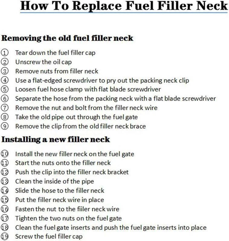 Fuel Tank Filler Neck Pipe For Ford F-350 F-450 F-550 Super Duty Turbo Diesel Item Description 【FITMENT】 Gas fuel tank filler neck tube pipe fit For Ford For F-350 Super Duty 6.0L 363Cu. In. V8 2005 2007,For Ford For F-450 Super Duty 6.0L 363Cu. In. V8 2005 2006 2007,For Ford For F-550 Super Duty 6.0L 363Cu. In. V8 2005 2006 2007 【FUNCTION】 The fuel filler neck pipe is made of steel with low fuel permeability, which can effectively prevent gasoline evaporation,avoid fuel leakage during refueling and ensure the normal driving of the car 【REMINDER】 Aging of the fuel filler neck will cause fuel leakage, fuel pump premature failure, fuel filler and injector blockage, wire damage etc,so replace a new pipe is very necessary 【EASY INSTALLATION】 The fuel filler neck with light weight ,it is easy to install with simple hand tools in just minutes 【ATTENTION】 Please check the descriptions and compatibility chart to ensure that the replacement fits your auto before your purchasing.Please contact us if you have any question Specifications Condition:100% Brand New Warranty: 90 Day Free Return:30 Day Color: Black Item Type: Fuel Tank Filler Neck Pipe OE Number: 4C3Z9034C, 8C3Z9034L, F81Z9034SA, 577-306, FN782 Quantity Sold: One Piece Note: Cab & Chassis; Diesel Only Fitment 2005 2007 Ford F-350 Super Duty 2005 2006 2007 Ford F-450 Super Duty 2005 2006 2007 Ford F-550 Super Duty Please Double-Check that this is compatible with your vehicle. Package Included 1x Fuel Tank Filler Neck Tube Pipe As pictures show FAQ: I purchased by mistake, how do I cancel the order? Please contact us ASAP. If the item has not been shipped out we can cancel the order for you. If the item was shipped out you can refuse the package and wait for the item to return to us. I received your item but it does not fit or is defective Please contact us so we can assist you on the matter. Buy with confidence Our quality is based on meeting the requirements of the manufacturer and improvement them in design problems manufacture. NOTE: (1)It would be highly appreciated if you might contact us first once you have any problems concerning the items. And you can expect all the issues would be resolved ASAP! (2)Please let us know before you send us the neutral/negative feedback that wont help to finish the issues. And I will definitely try my best to provide the best solutions which would meet our satisfactory! (3)According to the distance of the receipt address items would be sent from CA or NJ