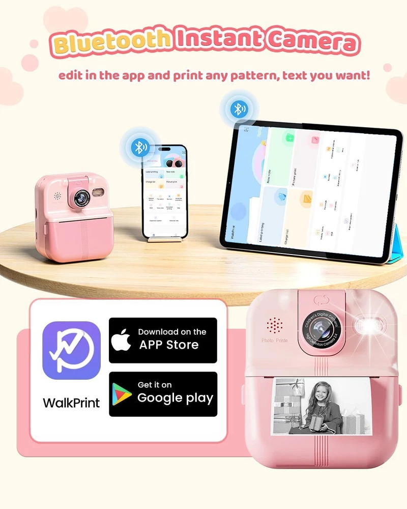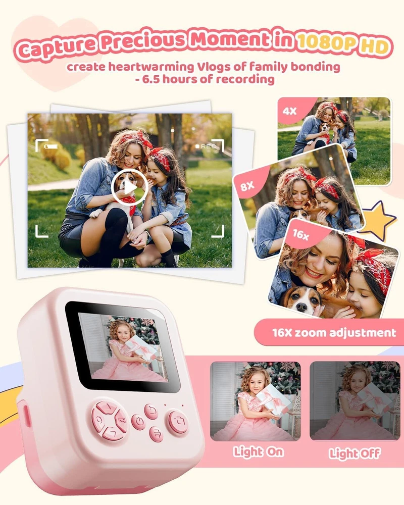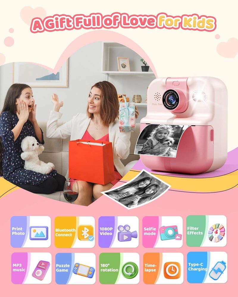 Product Description About this item 【Kids Camera Instant Print】: Kids camera instant print capture fun experiences with 180° rotating camera! Print photos in just 1 second, support Bluetooth connection for printing on mobile phones,while color images save to the 32GB SD card. With 27 frames and 11 filters, instant print camera sparks creativity and transforms snapshots into cherished keepsakes 【All-in-One Instant Print Camera】: Instant print camera very suitable for 3-12 year old girls/boys. toddler digital camera features instant printing, a 2.4-inch screen, and 1080P video recording. Enjoy 16x digital zoom, flash, time-lapse, continuous shooting, fun frames, games, and an MP4 player—perfect for capturing family fun 【Kids Print Camera BPA Free】: Camera for kids is made from harmless, eco-friendly materials and features a shock-resistant design that ensures durability. Kids instant camera suited for all kinds of adventure activities that children engage in. Rest easy, parents, as your kids fully enjoy the joy of photography 【Suitable for Girls Toys age 6-8】: Liscuty kids camera is girls toys age 6-8. Designed for travel, instant print camera comes with a Type-C fast charging port, providing 4 to 5 hours of battery life on a single charge. Toy camera kit includes a USB Type-C charging cable, a convenient carrying strap, and a 32GB SD card, allowing children to capture their joyful moments anytime, anywhere 【Kids Toys for Ages 3-12】: Kids camera is the perfect birthday or holiday gifts for 3 4 5 6 7 8 9 10 11 12 year old girls. Kids instant camera transforming into a tool that inspires creativity.Liscuty kids camera is girls toys age 6-8, encouraging kids to explore the world and capture precious memories, while alleviating parents' concerns about children's exposure to smartphones 【 Included Components】: 1x kids camera, 1x Type C charging cable,1 hanging rope, 1 instruction manual 1 pcs * Type C charging cable, 1 hanging rope, 1 instruction manual, 1 pcs * kids camera, 3 pcs * Printing paper1x1x11 1 pcs * kids camera, 3 pcs * Printing paper Instant Print Adventure Previous page Capture memories and play with our kid-friendly camera, featuring 5 fun educational games! Next page 1 Smart Games for Kids 2 Music Fun on the Go Previous page