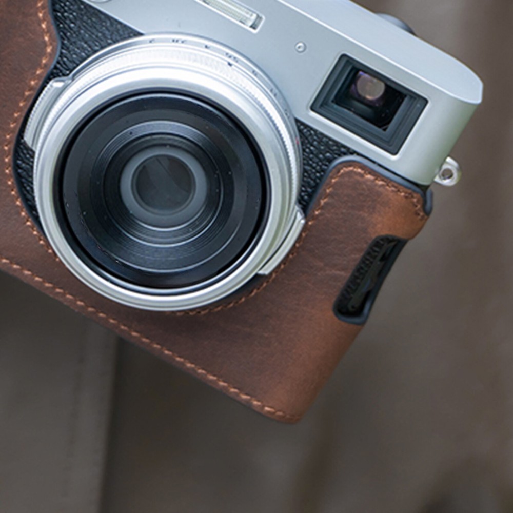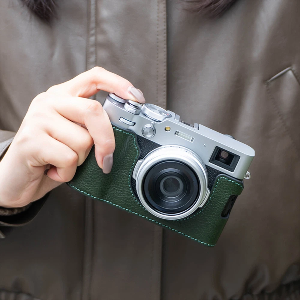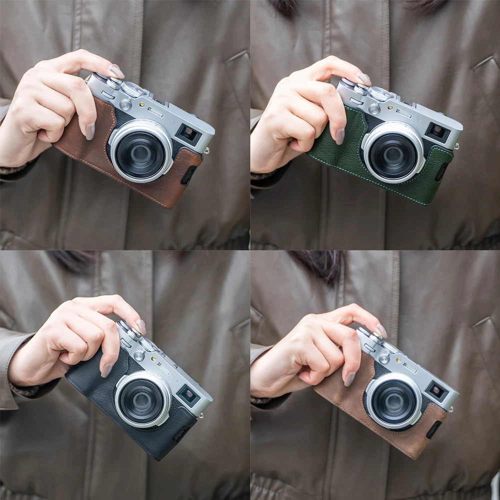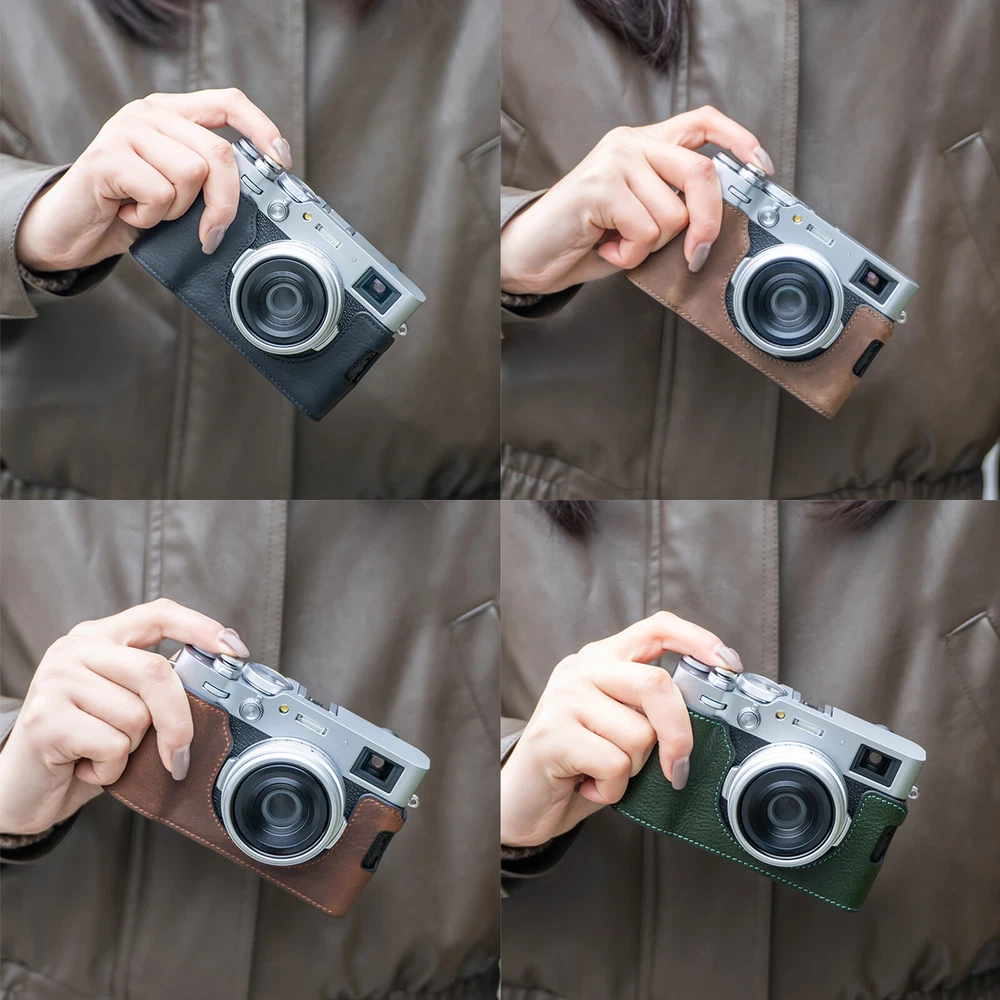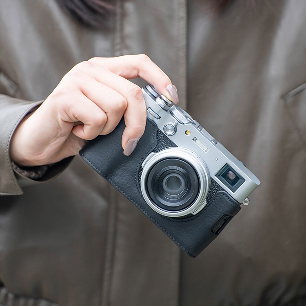Leather case kit for FUJIFILM X100VI 4558 is designed to protect the camera, lens, and enhance the retro feel, and quality of the camera. The kit includes a Leather Half Case, a flip case cover, and a shoulder strap. Both the external of the leather half case and flip case cover are made of breathable and wear-resistant first layer cowhide and repeat the silhouette of the camera to create an eye-catching style; the internal is made of Soft microfiber to provide All-around protection for the camera and lens. It perfectly fits the camera body and allows access to camera interfaces and buttons: battery compartment, MSC mode, card slot, etc.; The case is built-in aircraft-grade aluminum alloy for support to protect the camera from impacts. the bottom 1/4"-20 thread allows the case to be mounted onto the tripod directly without removing the case; The flip case cover features magnetic clasp and Velcro for more convenient and safety; It comes with a PU shoulder strap, easy to carry and hang camera. Designer: Kong, Yette White Note:The case may have some color differences because of using genuine leather. Compatibility FUJIFILM X100VI In the Box: 1 x Leather Half Case Specifications Product Dimensions: 135 x 75 x 95 mm / 53.1 x 2.0 x 37.4in Package Dimensions: 165 x 158 x25mm / 65.0 x 62.2 x 9.8in Product Weight: 262±5g / 9.2±0.2oz Package Weight: 365±5g / 12.9±0.2oz Material(s): Leather, PU, Aluminum Alloy