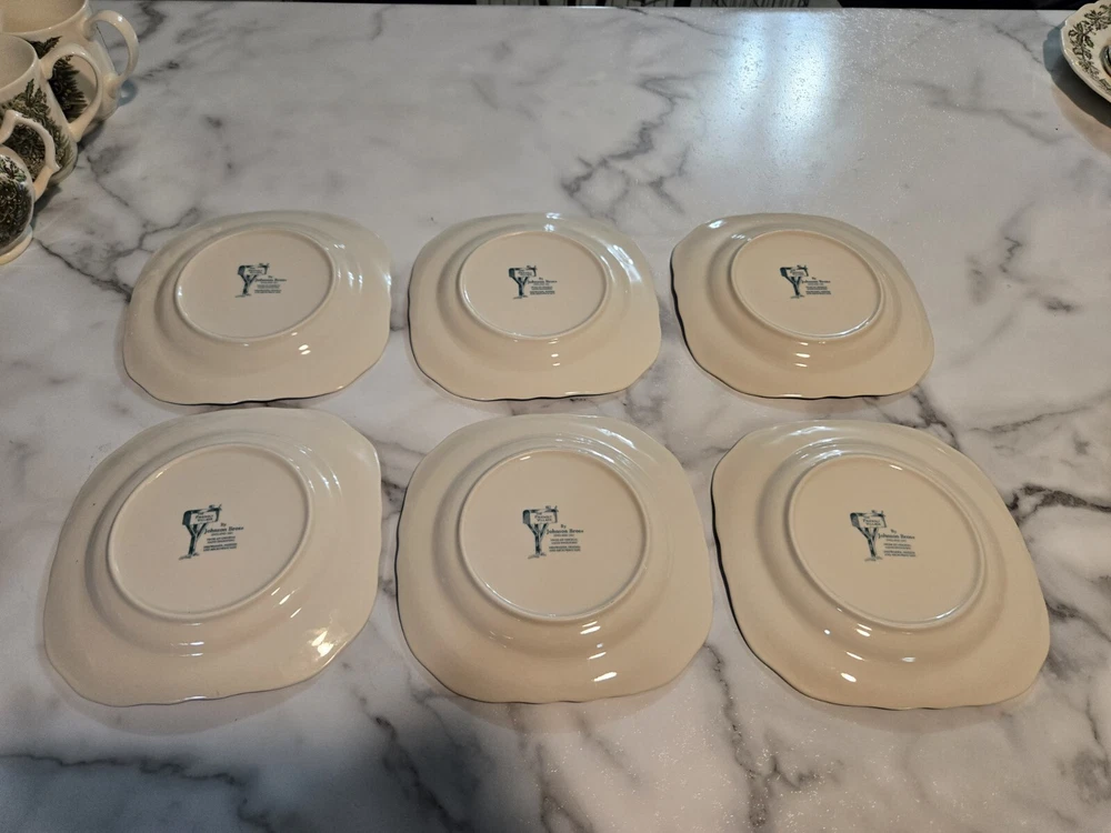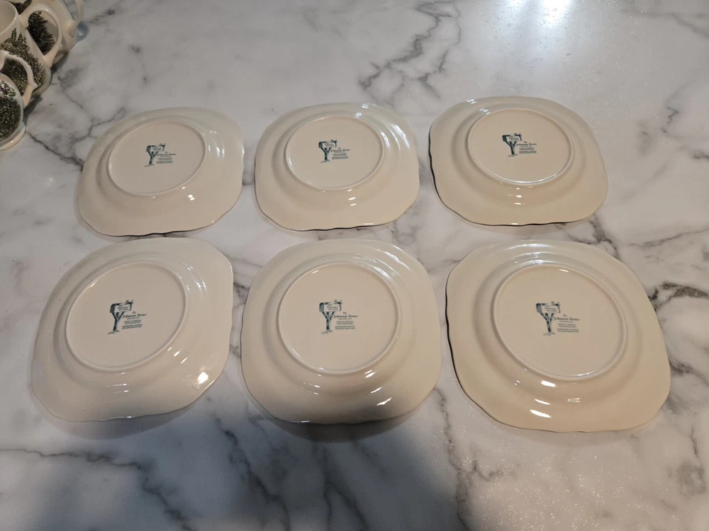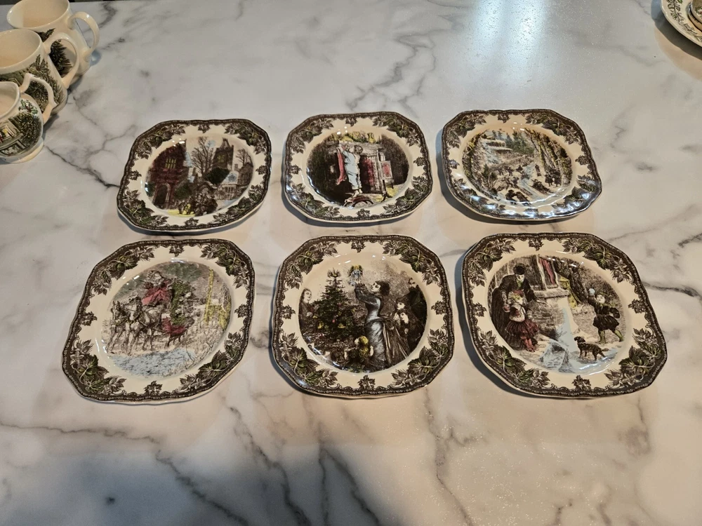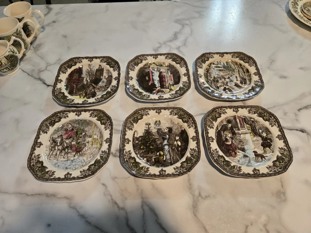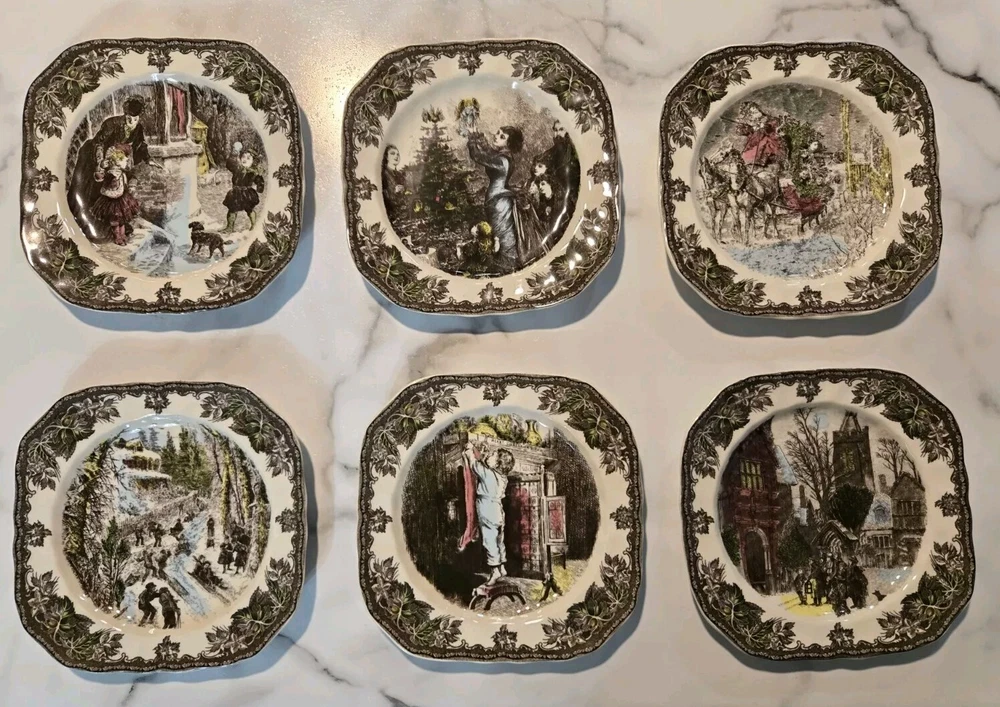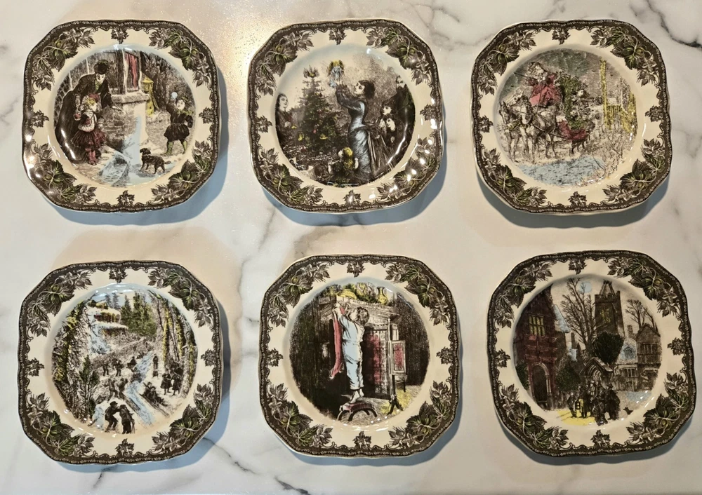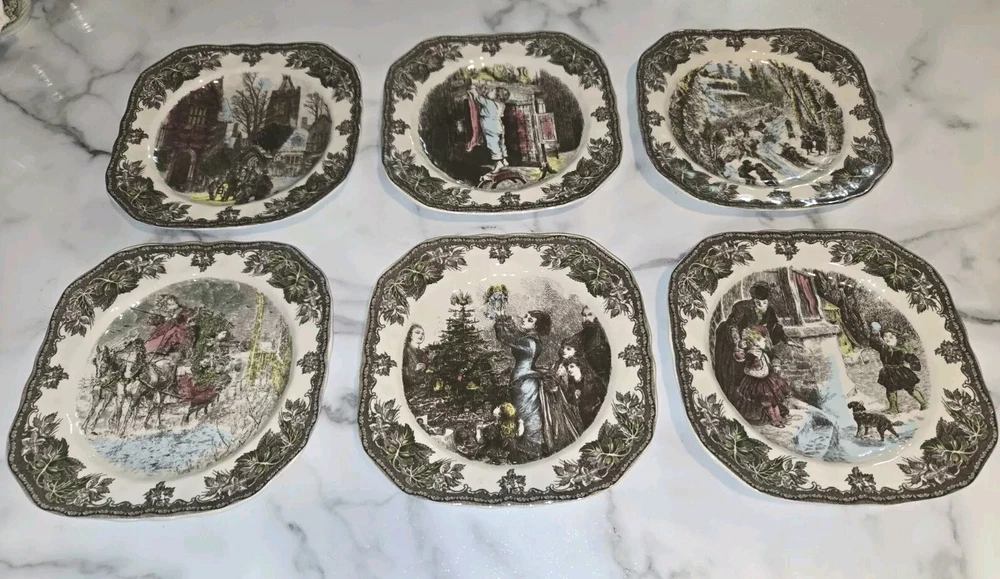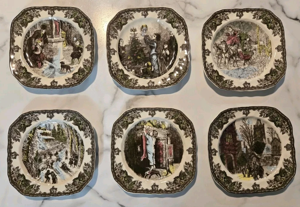 Add a festive touch to your holiday table with this full set of 6 Johnson Brothers Friendly Village Christmas Accent Plates. These square plates feature an underglaze decorated design with a classic, farmhouse, and Victorian style. The plates are made of high-quality porcelain material and have a glossy finish. The set includes 6 Accent/Dessert/Salad plates with a design width of 7 3/8". The plates are part of the Johnson Brothers Friendly Village product line and are original, limited edition plates. The backstamp is printed, and the plates are perfect for any holiday occasion, including Christmas and winter. There are no cracks, chips, or crazing. This set is in excellent condition.