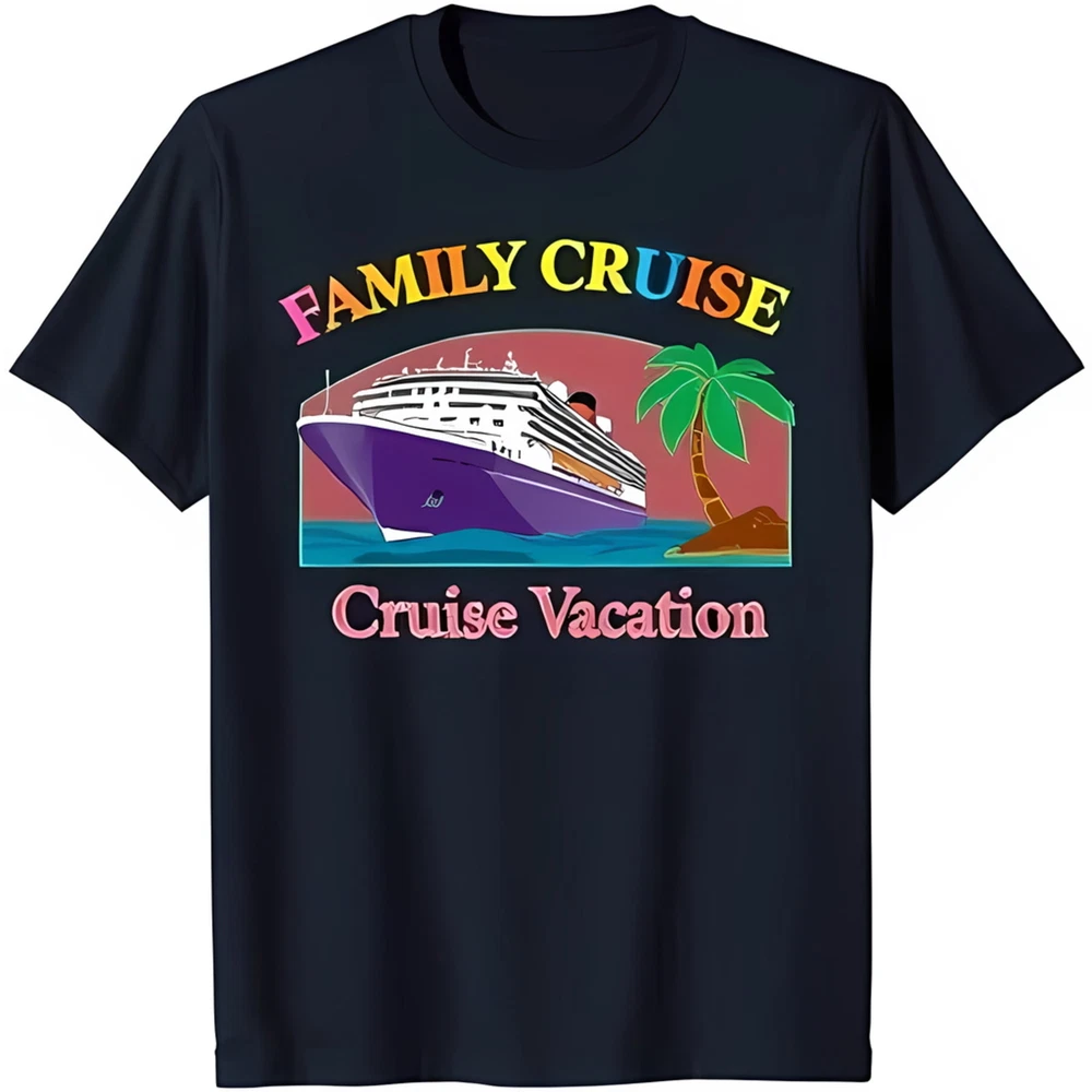 Fun Black T-Shirt with Cartoon Cruise Ship & Tree Graphic Family Cruise Design