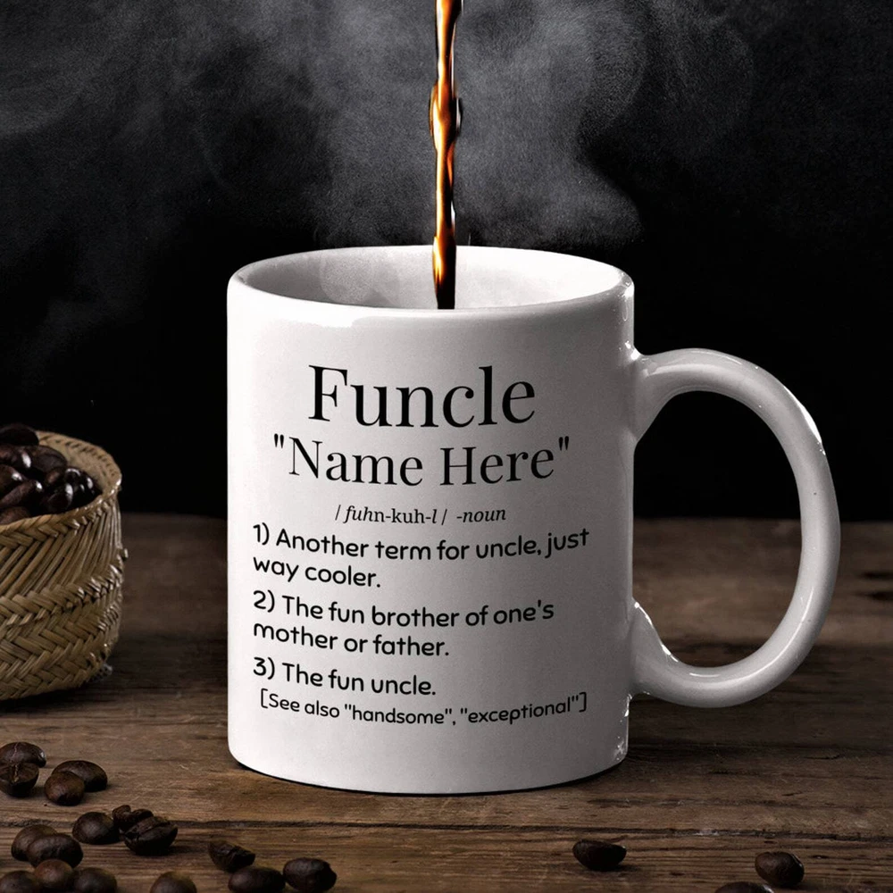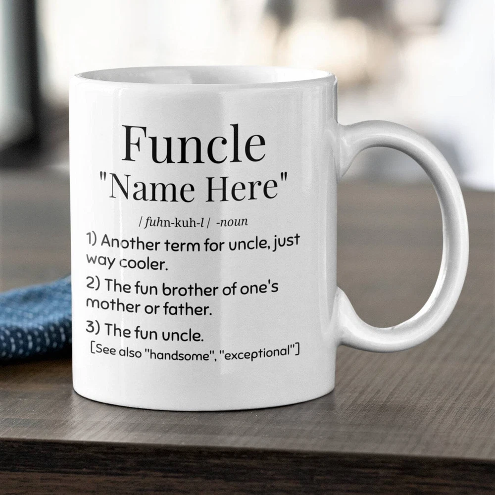 Funcle Mug Personalized Gift Coffee Tea Mug For New Uncle Brother Best Uncle Product Details.. This high quality 11oz. ceramic white mug has a premium hard coat that provides crisp and vibrant color reproduction sure to last for years. Perfect for all hot & cold beverages. The highest quality printing possible is used. It will never fade no matter how many times you wash it. Material: 100% Ceramic. Print both sides. Dishwasher and Microwave Safe. High Gloss + Premium White Finish. Printed in the U.S.A. Personalized & Custom. We support personalized and custom mug to add custom, when placing an order, you can add notes to the "order note" in shipping address section. Also you can contact us directly via message. Shipping Info. Ready to ship in 1 to 2 business days, All products are made-to-order and proudly printed in the United States. Shipped by USPS and DHL, You will receive your order in 5-7 days. Replace & Refund. All products are defective during shipping broken, chipped will be replaced free of charge. You are not satisfied with the product, we will refund 100% money to you. If any other issues arise, please do not hesitate to message, we would be more than happy to assist you.