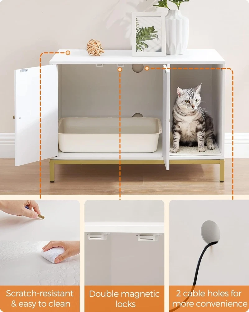 Functional Cat Furniture: White & Gold Litter Box Enclosure with Cabinet Doors ‹ › ‹ › ‹ › ‹ › ‹ › ‹ › ‹ › ‹ › ‹ › ‹ › ‹ › Functional Cat Furniture: White & Gold Litter Box Enclosure Style the Litter Box Area Transform your cat's bathroom into a chic corner with this exquisite litter box enclosure. Featuring a pristine white finish paired with a luxurious gold-colored metal frame, this modern piece effortlessly blends with your existing furniture, turning a previously messy area into a stylish sanctuary. Satisfies Cats' Natural Instincts Designed with your feline friend's comfort in mind, the hidden litter box offers an enclosed space that provides the privacy and security cats crave. The winding entryway caters to their natural curiosity, while the integrated scratching mat not only accommodates their scratching instinct but also traps stray litter, keeping your home tidy. Fits Most Litter Boxes, Most Spaces Measuring 20.5" x 19.7" x 16.5", this versatile enclosure is perfectly sized to accommodate most litter boxes. The thoughtfully designed front entry allows for flexible placement in any room without concern for directional orientation. For Cats, Also for You This multifunctional piece serves as more than just a litter box cabinet. Turn it into a cozy cat house by adding a comfortable cat bed inside, or repurpose it as a stylish side table or TV stand, ensuring both you and your cat enjoy this luxurious furniture piece together. Easy Assembly, Easy Cleaning Your convenience is paramount. With clear, step-by-step instructions and labeled components, assembly takes just 30 minutes. The elevated design not only facilitates easy cleaning beneath the enclosure but also features two doors for straightforward scooping, making maintenance a breeze. Why Choose Our Litter Box Enclosure? Say goodbye to unsightly litter boxes cluttering your living space. This elegant litter box enclosure not only conceals the mess but also enhances your home décor. Treat your furry friend to a stylish and private bathroom that you'll both love! Shipping Free & Fast Shipping - We offer free shipping to most of the USA with a normal delivery time of 3-7 days. However, due to the current situation, additional delivery time (up to 3 weeks) may be required for some items. Alternative Carriers - We may use alternative carriers (e.g. USPS, FedEx, UPS, etc.) to ensure your package arrives safely and on time. Due to the use of multiple carriers, we are unable to provide a tracking number automatically. Handling Time - Orders are processed and shipped within 1-2 business days of receiving cleared payment. Shipping Restrictions - Shipping to Alaska, Hawaii, Puerto Rico, Guam, and other US territories may incur shipping charges or delivery restrictions. Please contact us before ordering, or your order can be refunded/cancelled. State Restrictions - There may be restrictions based on your state of purchase. For example, certain items may not be shipped to California due to state regulations. Contact for Tracking Updates - If you require tracking updates or have any concerns about the delivery of your order, please feel free to contact us, and we will be happy to assist you. Return 30-Day Hassle-Free Returns - We want you to be completely satisfied with your purchase. If you are not, you can return the item within 30 days of receiving it for a full refund or exchange. Easy Return Process - To start a return, simply contact us and we will provide you with a prepaid return shipping label and detailed instructions. Restocking Fee - There are no restocking fees for returns. However, the buyer is responsible for return shipping costs if the return is not due to a seller's error. Refund Processing Time - Refunds will be processed within 5 business days of receiving the returned item in its condition. Payment We accept all major credit cards, PayPal, and Apple Pay for your convenience. Your payment information is secure and encrypted to ensure a safe and seamless transaction. Please complete your payment within 3 days of purchase to avoid any delays in shipping. Feedback Your feedback is extremely important to us. We strive to provide the best products and customer service possible. If you are satisfied with your purchase, please take a moment to leave us a positive review. If you have any concerns or issues with your order, please contact us before leaving negative feedback. We are committed to resolving any problems and ensuring your satisfaction. Contact Us If you have any questions or concerns, please feel free to out to our customer support team. You can contact us through the eBay messaging system. We are available Monday to Friday, 9:00 am to 5:00 pm EST, and we will do our best to respond to your inquiry within 24 hours. Buy it now and enjoy a pleasant shopping experience! Model: Cat Litter Box Enclosure MPN: Cat_Litter_Box_Enclosure Unit Quantity: 35.9 pounds Type: Hooded Litter Box