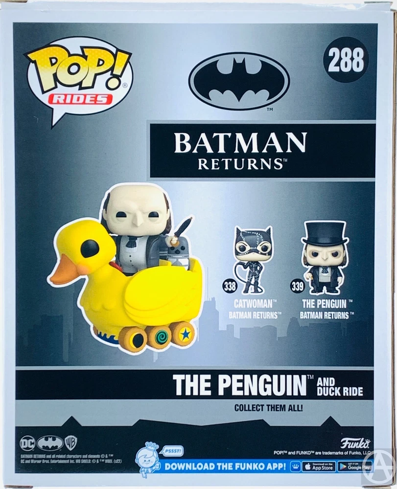 Funko POP! Rides: DC Batman Returns Deluxe THE PENGUIN AND DUCK RIDE Summer Convention Limited Edition/Exclusive #288 - New Crash the party with Pop! Rides: Penguin Summer Convention Limited Edition exclusive arrives in a stylish yellow duck on wheels—and he always carries an umbrella. Even a couple of passenger penguins get to take a spin! Add a surprise or two to your Batman Returns collection with Pop! Rides Penguin. Vinyl figure is approximately 6.14-inches (15.6cm) tall. Product Features 6.14 inches (15.6cm) Made of vinyl Urban stylized design Based on the film Batman Returns (1992) Comes in window-box packaging Box Contents The Penguin and Duck Ride Pop! (Summer Convention Exclusive) #288 Condition Description Brand New Ships in an acid-free POP Protector for added protection during transit. Please carefully review & inspect all listing photos. Buy with Confidence Orders are shipped within 3 business days or less Scam/Fraud Prevention: Some items in our store are equipped with tamper evident seals for buyer/seller protection. We only accept eBay Managed Payments. We only ship to addresses on file with Ebay, no exceptions. Items are shipped with tracking via Stallion Express : Canada Post (CPC) Note: individually sold Comic Books are not tracked and are shipped with Canada Post Lettermail FleetOptics UniUni ICS Courier United States Postal Service (USPS) United Parcel Service (UPS) Federal Express (FedEx) Thank you for visiting!! Please feel free to ask any questions!!! 100% Genuine Canadian Seller - We value & understand the importance of proper packaging, especially when it comes to collectibles. Please be assured: your order will be carefully packed so that you receive it in excellent condition.
