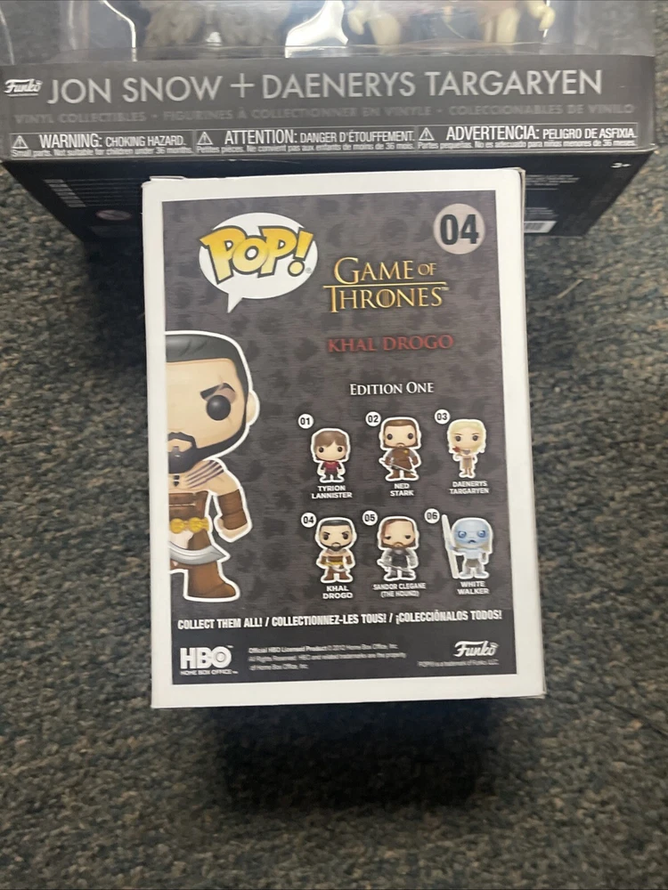gtin13:0830395030135Customized:NoSport:BoxingSeries:Games of Thrones Series 1Release Year:2014Character:Khal DrogoBrand:FunkoSize:StandardFeatures:VaultedUPC:0830395030135Autographed:NoPackaging:Original (Unopened)Franchise:Game of ThronesMPN:3013Product Line:Pop! VinylTheme:Television, FantasyCountry/Region of Manufacture:ChinaExclusive Event/Retailer:HBOBox Number:4Item Height:4 inTV/Streaming Show:Game of ThronesFeatured Person/Artist:George R. R. Martin, Jason MamoaCollection:Game of ThronesMaterial:VinylColor:MulticolorType:Vinyl Figure, Pop! Vinyl