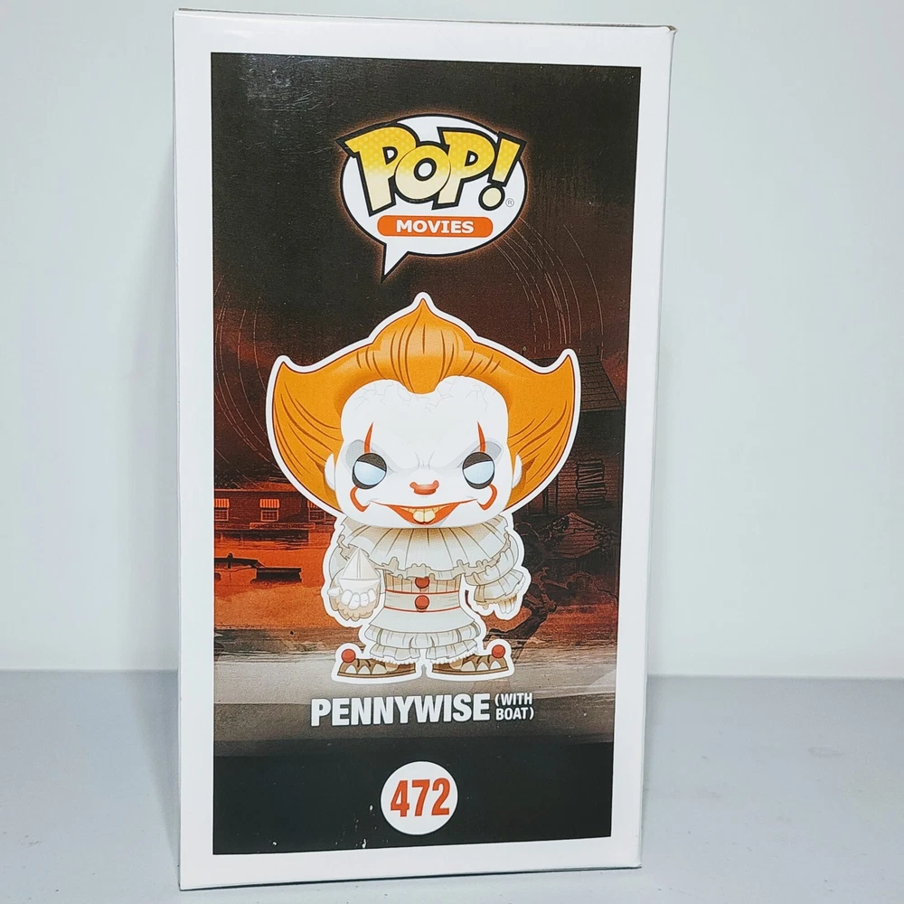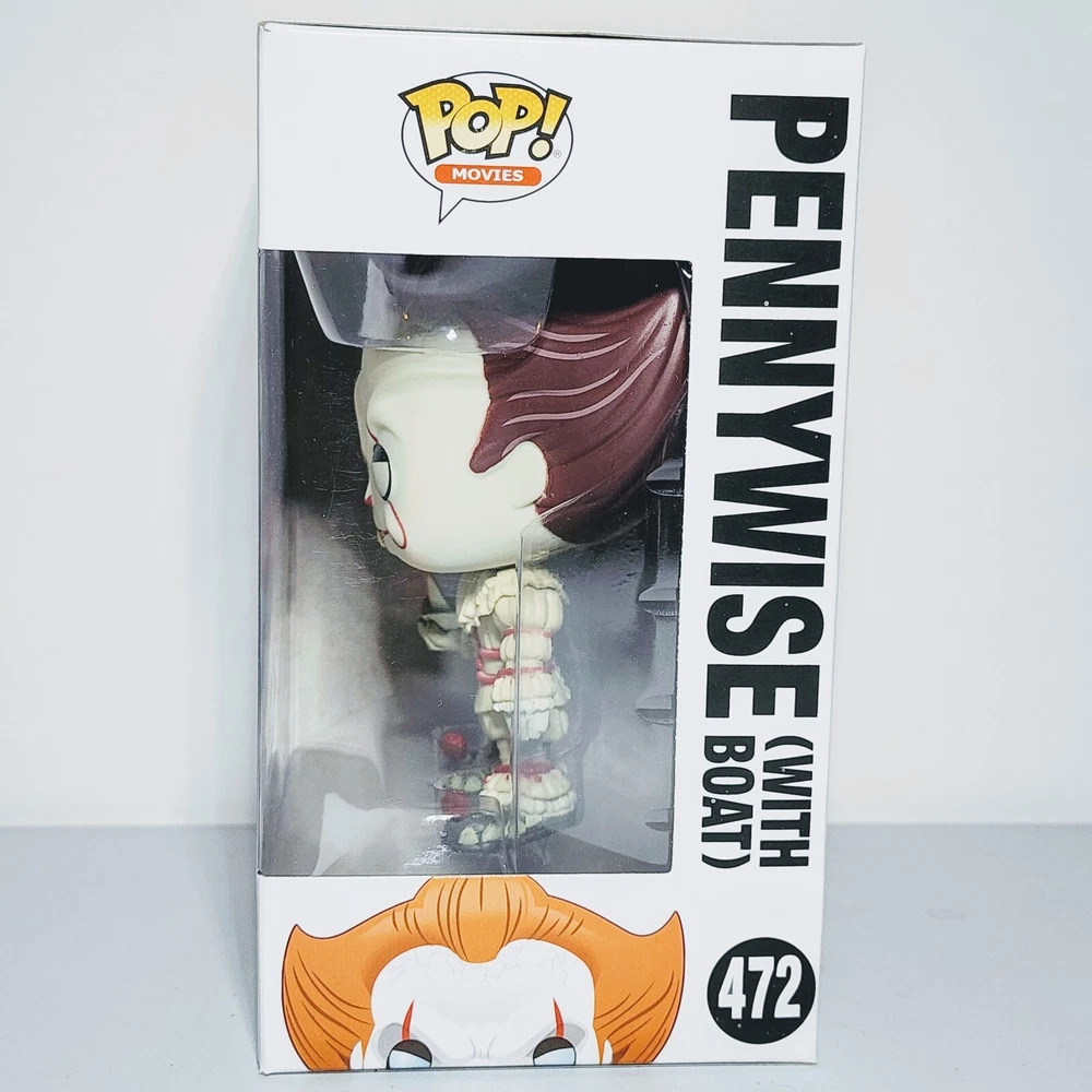 This Funko Pop Movies figure features Pennywise from the horror movie It, sitting in a boat. This exclusive Chase Edition vinyl figure is from the It (2017) S1 series and comes in box number 472. The packaging is damaged but the figure is protected by a protector. The Pennywise figure is part of the Funko Pop! collection and is made of high-quality vinyl material. It is a must-have for any It or horror movie fan. Add this unique and rare figure to your collection today!