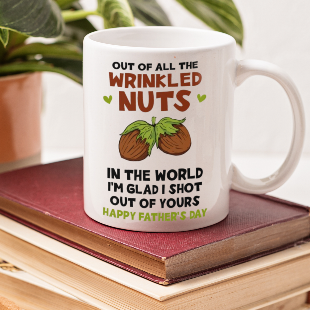 🎁 A FUNNY AND HEARTFELT GIFT FOR DAD: This 11oz white ceramic mug features the humorous message: "Out of all the wrinkled nuts in the world, I'm glad I shot out of yours." A hilarious and unique way to wish Dad a Happy Father’s Day while showing him how much you appreciate his love and care. ☕ FEATURES: Material: High-quality white ceramic Capacity: 11 oz Microwave and dishwasher safe Clear and vibrant text design ✨ WHY THIS MUG IS PERFECT: Ideal for Father’s Day, birthdays, or any occasion Durable and lightweight, perfect for everyday use A great way to show Dad you care with humor 📦 PACKAGING: Securely packaged to ensure safe delivery Ready for gifting and guaranteed to make Dad smile