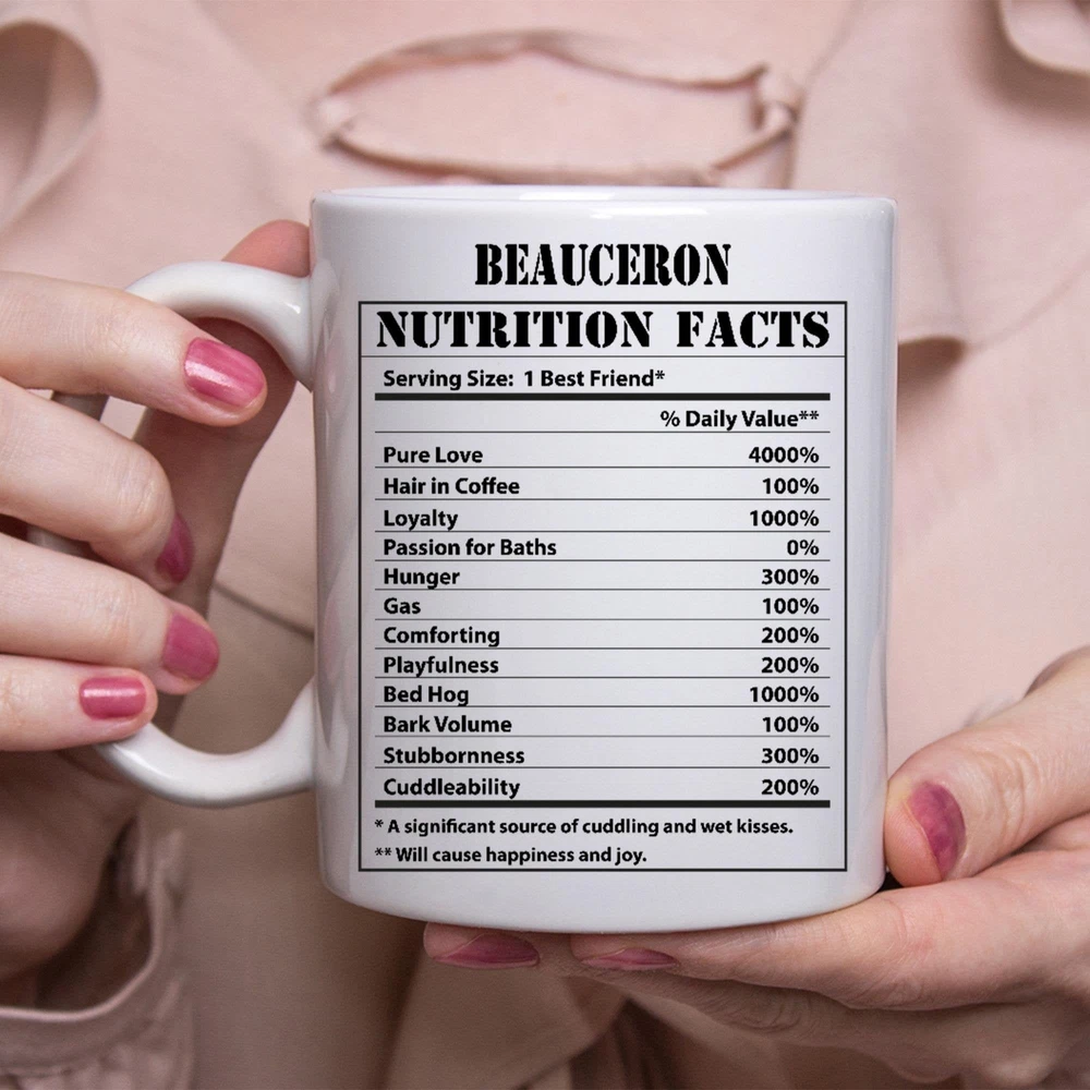 Funny Beauceron Gifts Nutritional Facts White Coffee Mug Product Details.. This high quality 11oz. ceramic white mug has a premium hard coat that provides crisp and vibrant color reproduction sure to last for years. Perfect for all hot & cold beverages. The highest quality printing possible is used. It will never fade no matter how many times you wash it. Material: 100% Ceramic. Print both sides. Dishwasher and Microwave Safe. High Gloss + Premium White Finish. Printed in the U.S.A. Personalized & Custom. We support personalized and custom mug to add custom, when placing an order, you can add notes to the "order note" in shipping address section. Also you can contact us directly via message. Shipping Info. Ready to ship in 1 to 2 business days, All products are made-to-order and proudly printed in the United States. Shipped by USPS and DHL, You will receive your order in 5-7 days. Replace & Refund. All products are defective during shipping broken, chipped will be replaced free of charge. You are not satisfied with the product, we will refund 100% money to you. If any other issues arise, please do not hesitate to message, we would be more than happy to assist you.