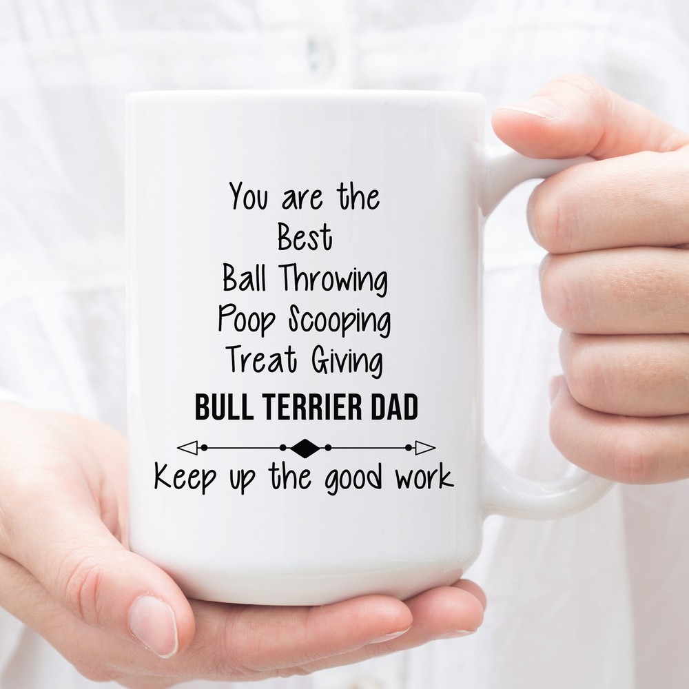 Bull Terrier Dad Gifts Funny Bull Terrier Dad Cup Christmas Present For Bull Product Details.. This high quality 11oz. ceramic white mug has a premium hard coat that provides crisp and vibrant color reproduction sure to last for years. Perfect for all hot & cold beverages. The highest quality printing possible is used. It will never fade no matter how many times you wash it. Material: 100% Ceramic. Print both sides. Dishwasher and Microwave Safe. High Gloss + Premium White Finish. Printed in the U.S.A. Personalized & Custom. We support personalized and custom mug to add custom, when placing an order, you can add notes to the "order note" in shipping address section. Also you can contact us directly via message. Shipping Info. Ready to ship in 1 to 2 business days, All products are made-to-order and proudly printed in the United States. Shipped by USPS and DHL, You will receive your order in 5-7 days. Replace & Refund. All products are defective during shipping broken, chipped will be replaced free of charge. You are not satisfied with the product, we will refund 100% money to you. If any other issues arise, please do not hesitate to message, we would be more than happy to assist you.