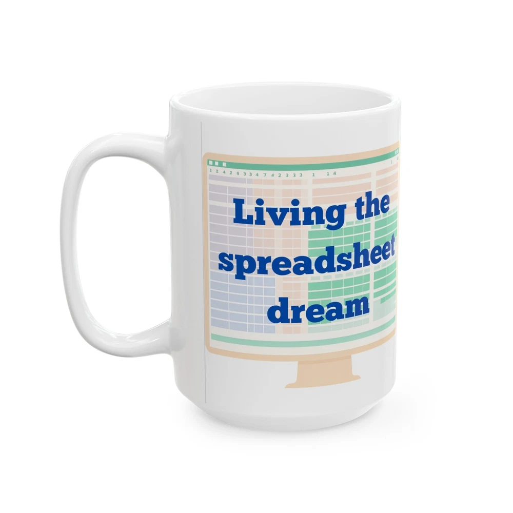 Funny ceramic mug gift for a co-worker, featuring the quote 'Living the Spreadsheet Dream' on a 15 oz mug. This mug is perfect for someone who loves a touch of humor in their daily routine and enjoys a good cup of coffee or tea. Ideal for office birthdays, Secret Santa, or just to brighten someone's day. Product features - Glossy ceramic finish - Vibrant colors - Microwave and dishwasher safe - Available in 11oz and 15oz sizes - Lead and BPA-free Care instructions - Clean in dishwasher or wash by hand with warm water and dish soap