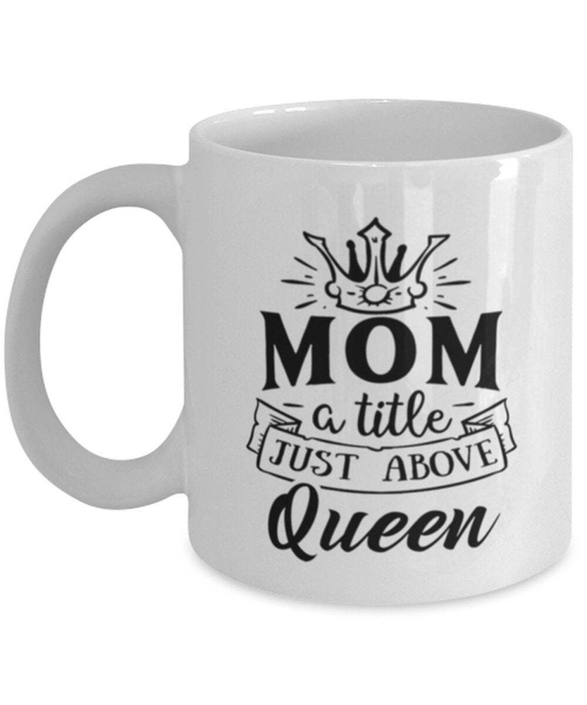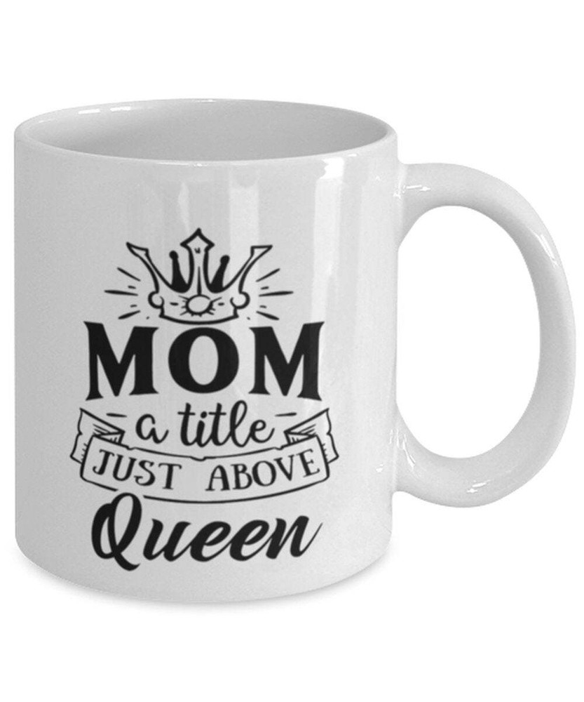 Mom Funny Coffee Mug A Title Just Above Queen New Mom Gift Mom Birthday Mothers Product Details.. This high quality 11oz. ceramic white mug has a premium hard coat that provides crisp and vibrant color reproduction sure to last for years. Perfect for all hot & cold beverages. The highest quality printing possible is used. It will never fade no matter how many times you wash it. Material: 100% Ceramic. Print both sides. Dishwasher and Microwave Safe. High Gloss + Premium White Finish. Printed in the U.S.A. Personalized & Custom. We support personalized and custom mug to add custom, when placing an order, you can add notes to the "order note" in shipping address section. Also you can contact us directly via message. Shipping Info. Ready to ship in 1 to 2 business days, All products are made-to-order and proudly printed in the United States. Shipped by USPS and DHL, You will receive your order in 5-7 days. Replace & Refund. All products are defective during shipping broken, chipped will be replaced free of charge. You are not satisfied with the product, we will refund 100% money to you. If any other issues arise, please do not hesitate to message, we would be more than happy to assist you.