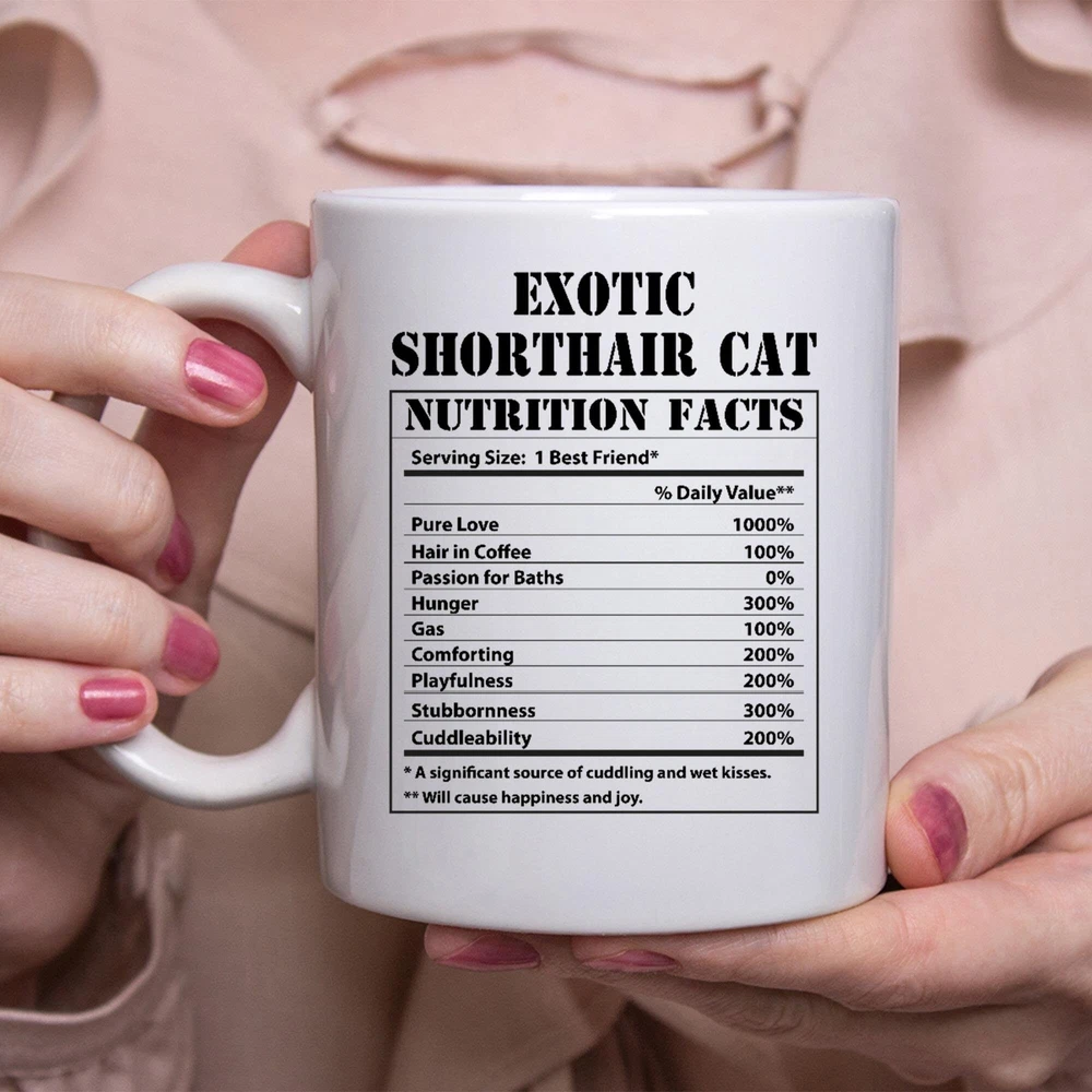 Funny Exotic Shorthair Cat Gifts Nutritional Facts White Coffee Mug Product Details.. This high quality 11oz. ceramic white mug has a premium hard coat that provides crisp and vibrant color reproduction sure to last for years. Perfect for all hot & cold beverages. The highest quality printing possible is used. It will never fade no matter how many times you wash it. Material: 100% Ceramic. Print both sides. Dishwasher and Microwave Safe. High Gloss + Premium White Finish. Printed in the U.S.A. Personalized & Custom. We support personalized and custom mug to add custom, when placing an order, you can add notes to the "order note" in shipping address section. Also you can contact us directly via message. Shipping Info. Ready to ship in 1 to 2 business days, All products are made-to-order and proudly printed in the United States. Shipped by USPS and DHL, You will receive your order in 5-7 days. Replace & Refund. All products are defective during shipping broken, chipped will be replaced free of charge. You are not satisfied with the product, we will refund 100% money to you. If any other issues arise, please do not hesitate to message, we would be more than happy to assist you.
