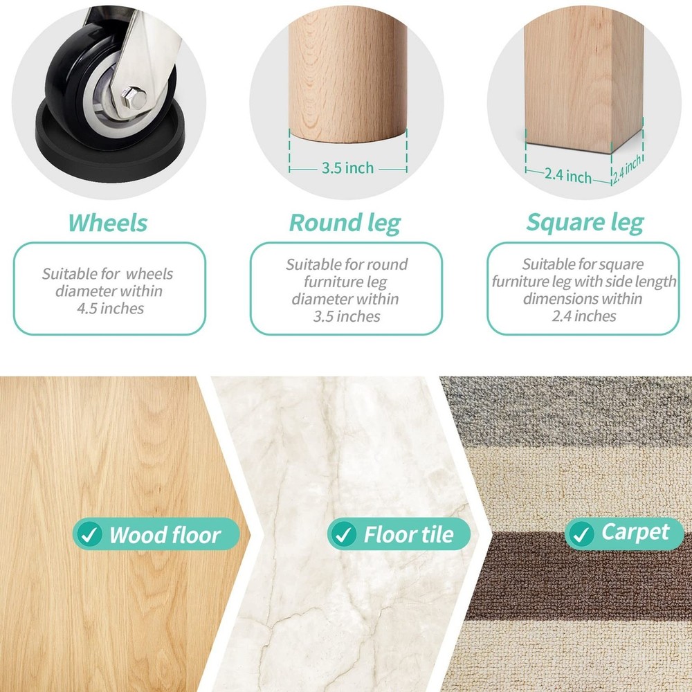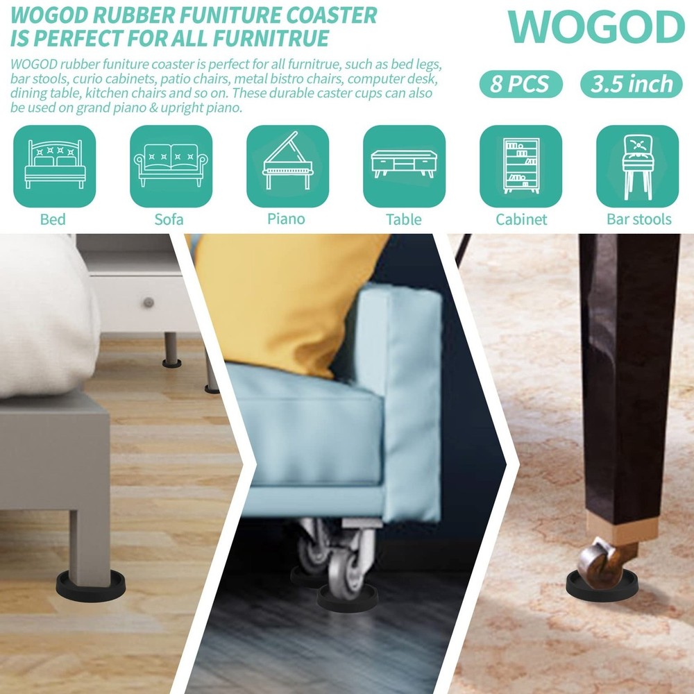 Furniture Caster Cups,Furniture Coasters, Rubber Furniture Pads 8 Pcs 3.5" Non Slip Pads - Furniture Cups for Protect Any Flooring Product Details Model: 8Pcs Black Brand: WOGOD MPN: 8Pcs Black UPC: Does not apply EAN: Does not apply Brand: WOGOD Material: Rubber Color: Black Surface Recommendation: Vinyl, Tile, Hardwood Shape: Round Product Dimensions: 3.5"L x 3.5"W x 0.25"Th Number of Items: 8 Recommended Uses For Product: Scratching Special Feature: Durable Fixture Type: Removable Number of Pieces: 8 Grip Material: Rubber Unit Count: 8.0 Count Manufacturer: WOGOD Item Weight: 13.4 ounces Country of Origin: China Item model number: 8Pcs Black Date First Available: February 8, 2023 DURABLE CUSHION TO SAVE THE FLOOR - These rubber furniture coasters are handy for keeping furniture from scratching hardwood floors. You simply put them under furniture legs and they keep the legs from scratching the floor. They have a slight lip to keep the furniture from slipping off. They are rubber, so they will stay in place,havent smelt any oder coming out of them at all. NON SLIP FURNITURE LEG PROTECTORS RUBBER PADS - The squares furniture pads have a bit of a little edge to keep the legs of your furniture from slipping out or off of it. It fits various feet different types of feet for home. Also have used it on heavy kitchen table to prevent more scratches and chipping of travertine. They are also a great support for upright and grand pianos, outdoor BBQs and outdoor furniture. Works perfect to stop the furniture from sliding and scratching the floors! RUBBER COASTERS GRIP VERY WELL - Furniture Coasters high density cushioning, soft and elastic, anti-slip embossing Noise reduction, shock absorption, waterproof, odor-free. High load-bearing and compression resistance, no need to worry about friction marks.Its made of rubber not plastic so exactly what PROTECTING ANY FLOORING - Furniture caster cups will provide you the best protection for your home for a long time. Great for any flooring, including hardwood floor, cement floors,vinyl, tile, carpet, etc.They wont stick to the carpet like an adhesive but theyll stay put pretty well. WOGOD FURNITURE PADS - Our team carefully creates high quality, durable, innovative, functional and stylish furniture pads and piano caster cups for our custormer. We sincerely hope these elegant and durable rubber furniture caster cups can protect your floor from scratches and keep your furniture of piano from sliding.