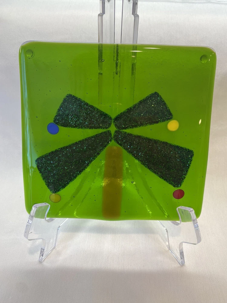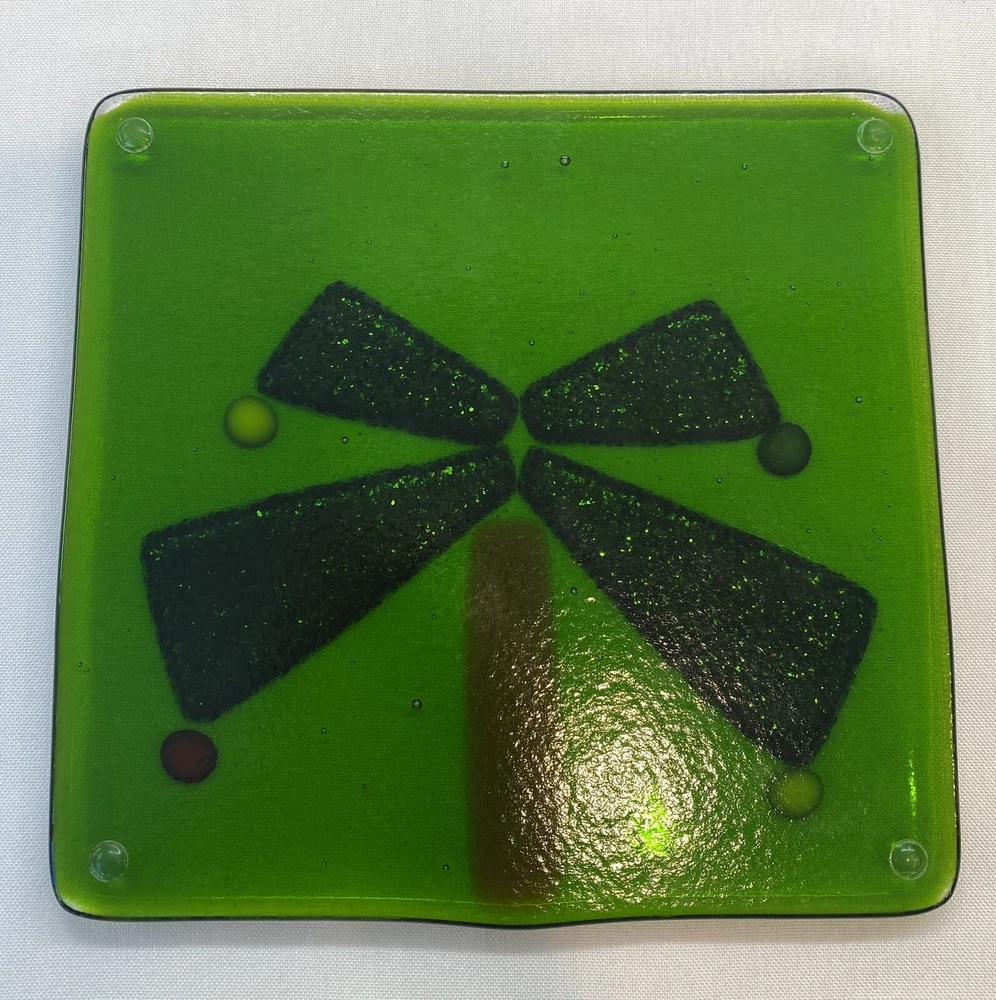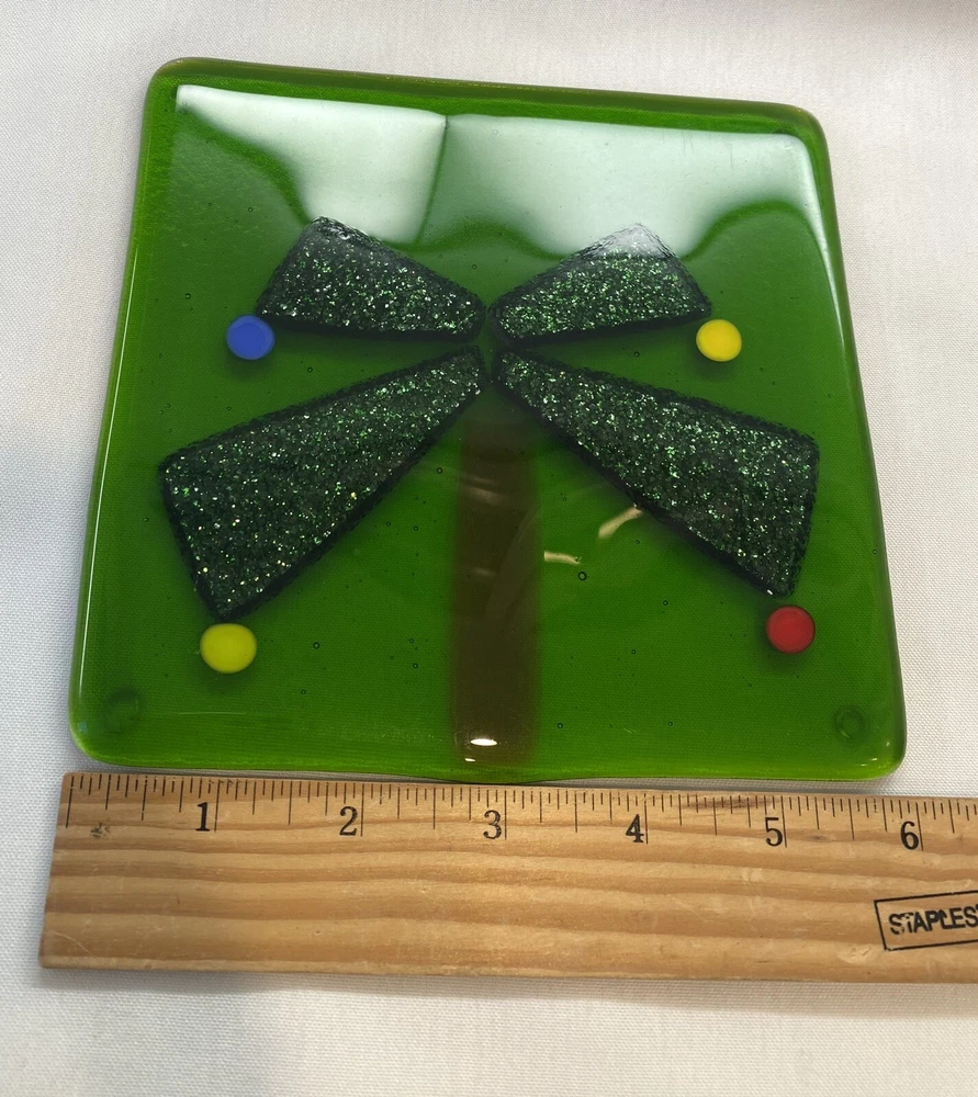 This trivet is beautiful! The green is rich and the palm fronds have an iridescent glitter detail. No chips, cracks, or scratches. No damage noted on either side. I do see one tiny glaze spec on one of the fronds, but very tiny. The underside has the rubber protectors. Measures approximately 5.75” X 6” Please see all pictures provided.