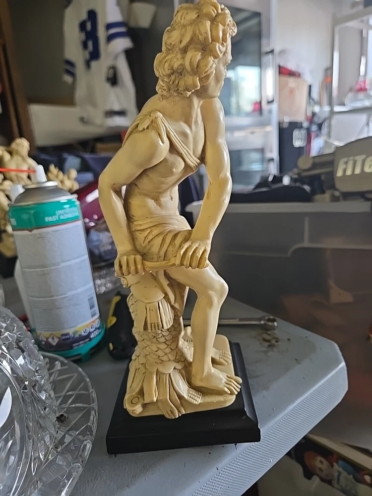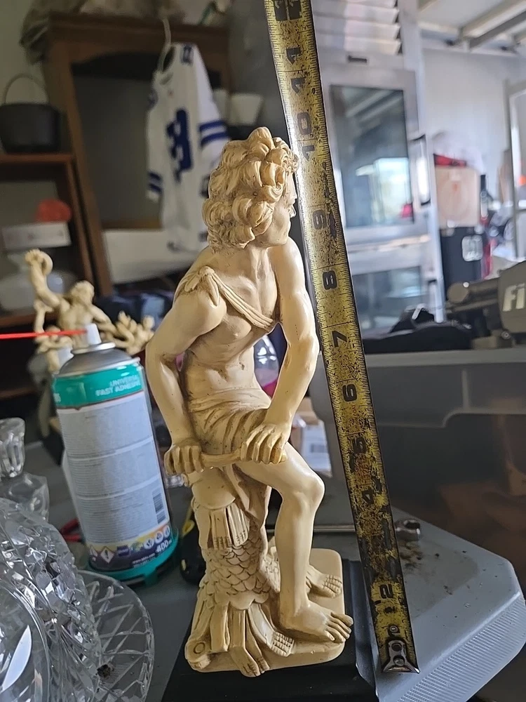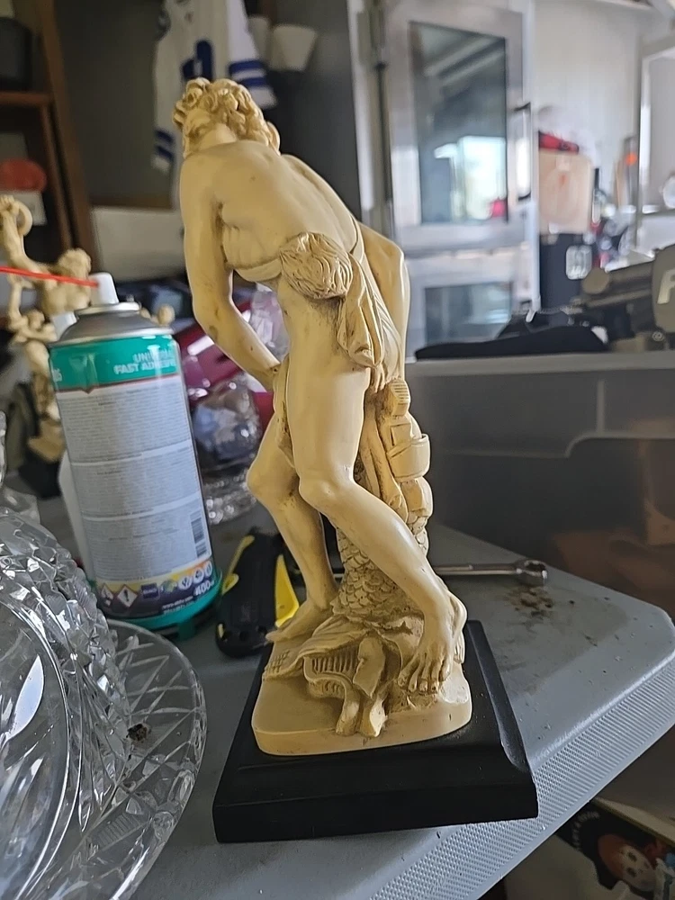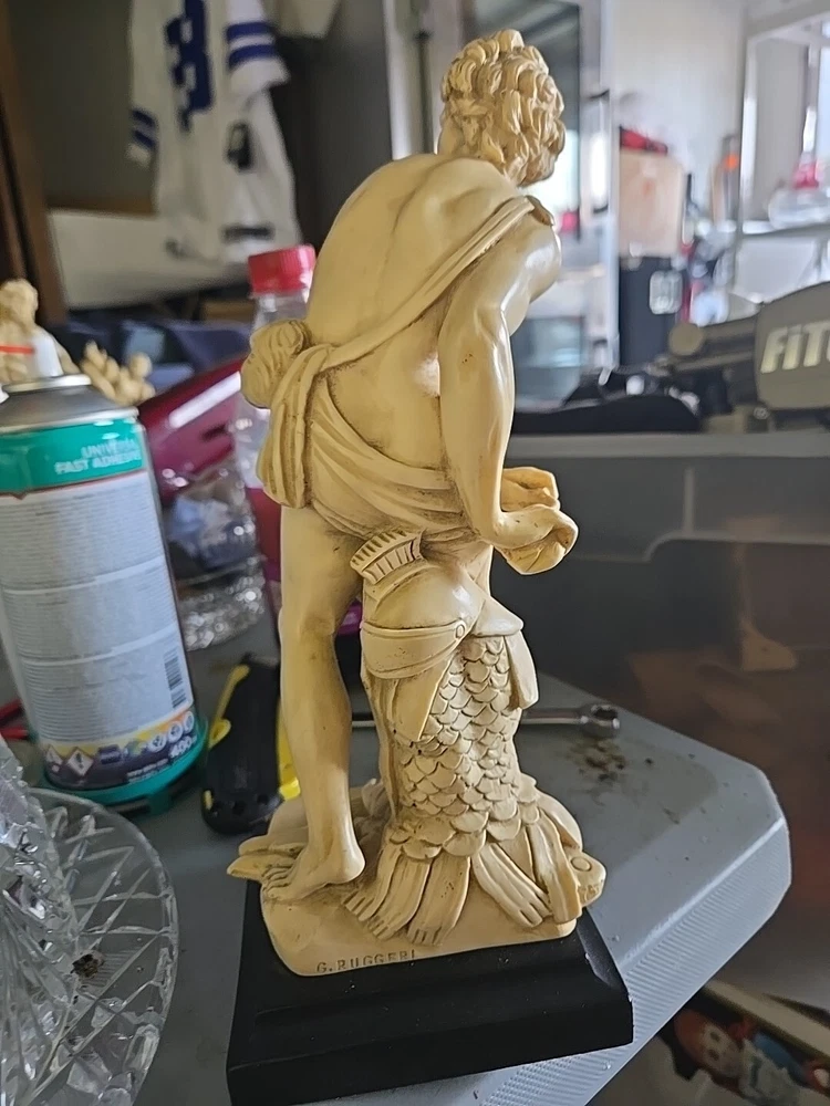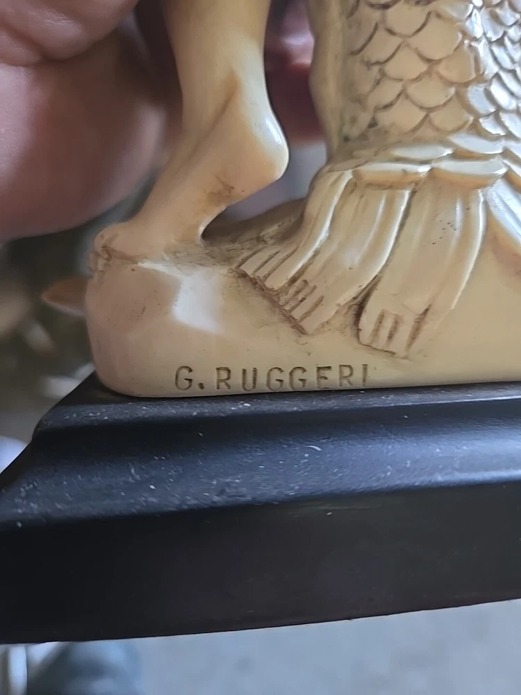 This is a vintage sculpture of the Greek god Hercules, created by the artist G. Ruggeri in Italy. The statue stands at 10 inches tall and is made of resin, with a marble base. It is signed by the artist and features a classical style with intricate carving details. This collectible piece showcases a high level of artistry and craftsmanship, making it a unique and valuable addition to any art collection.