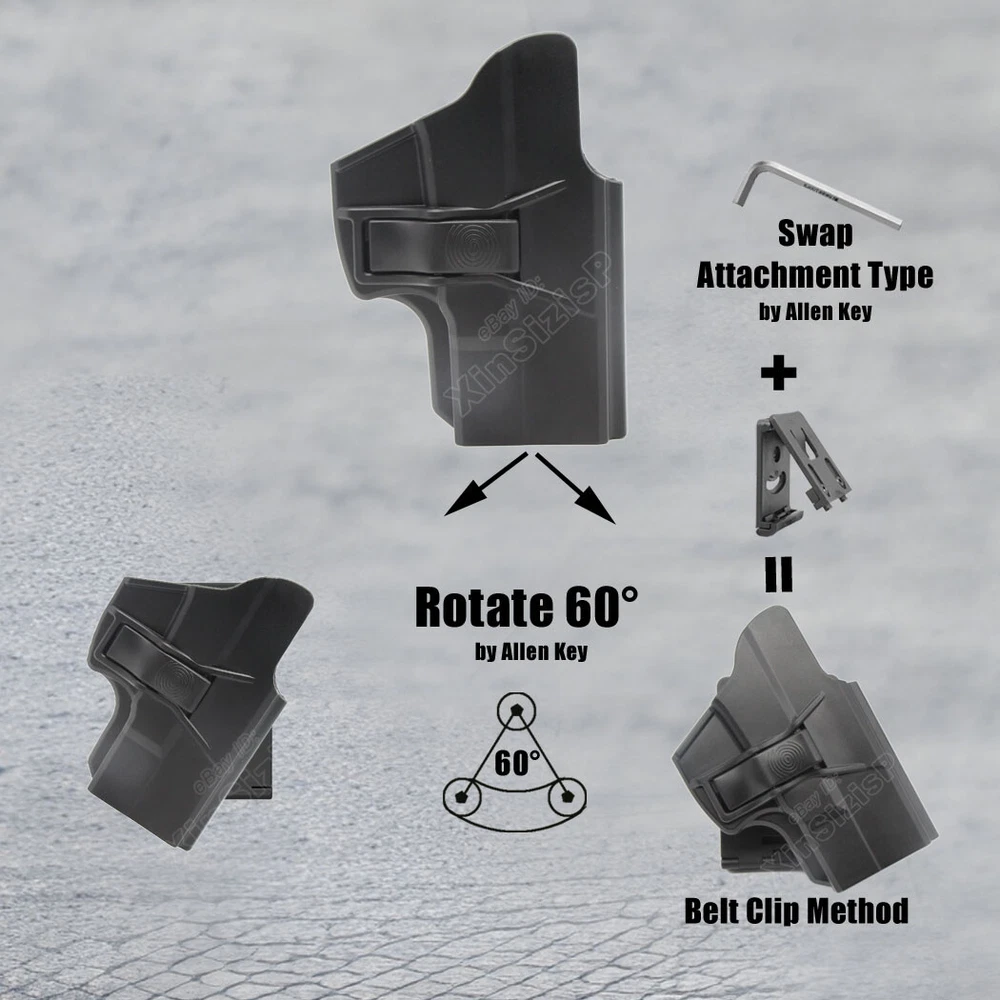 High Quality Military & Police Grade Polymer OWB Holster Specially Designed For Fast Draw During Duty Or Shooting Competition. Outside the Waistband Tactical Holster with belt clip method Holster fit Taurus Taurus G2c 3.2" 9mm Luger Taurus G2s 3.25" 9mm Luger Taurus PT111 Millennium G2 3.2" 9mm Luge r (Not PRO ) Holster fit Taurus G2c 3.2" .40 S&W Taurus G2s 3.25" .40 S&W Taurus PT140 Millennium G2 3.2" .40 S&W (Not PRO ) Holster for Taurus PT132 Millenn ium 3.25" .32 ACP (Not PRO ) Taurus PT138 Millenn ium 3.25" .380 ACP (Not PRO ) Holster for Taurus PT145 Millennium G2 3.3" .45 ACP (Not PRO ) Taurus PT745 Millennium 3.25" .45 ACP (Not PRO ) ( Notice: These models do not fit Taurus PT24/7 G2 .40 S&W.) (It perfect fit the gun with Optic Mount Mini Sight above on the end of the barrel, But without laser and no embedded chassis, and no flashlight style ) Materials & Durable Made of durable high-tech polymer materials - Stronger than leather will wear out, the polymer holster will not wear out and get flimsy. High S afety I ndex-finger release for quick release button (Level II retention) An audible click lock system ensures knowing when your weapon is securely holstered A djustable E asily set your belt cant 0-60 degrees according to your preference with the Allen key Ease And Comfort Easy on / Easy off- No need to undo your belt every time you wear your holster.Sweat-proof- Protect your weapon from salty perspiration and not absorb sweat.Adapt to every environment In the Package: · 1*Holster with Belt Clip Attach ment · 1*Allen Key Shipping: Ships same day or next except Sundays and Holidays ! Free shipping! Ship by USPS First Class Package. 100% MONEY BACK GUARANTEE. Any question please be free to contact with us .Thanks!