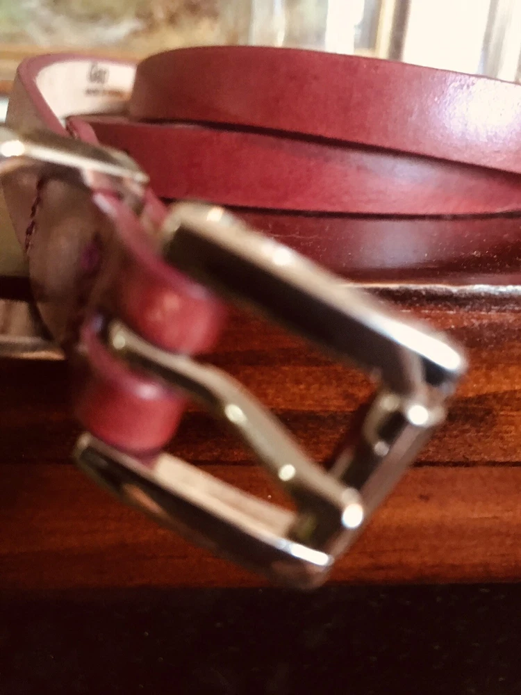 Crafted for style and functionality, this Gap women's waist belt is an essential accessory for any wardrobe. It features a sleek burgundy leather design, complemented by a striking silver buckle that adds a touch of elegance to your outfit. The belt is a versatile piece, easily adjustable to fit a waist size of 38.5 inches, and has a medium-width strap that measures 1/2 inch in width, ensuring a comfortable fit for regular size types.The belt's solid pattern is enhanced by subtle stitching details, providing a sophisticated finish. Its durable leather construction and solid burgundy color make it a perfect match for a variety of outfits, whether you're aiming for a casual look or dressing up for an evening event. The belt's design is punctuated by a metal theme, giving it a contemporary edge that's sure to impress.