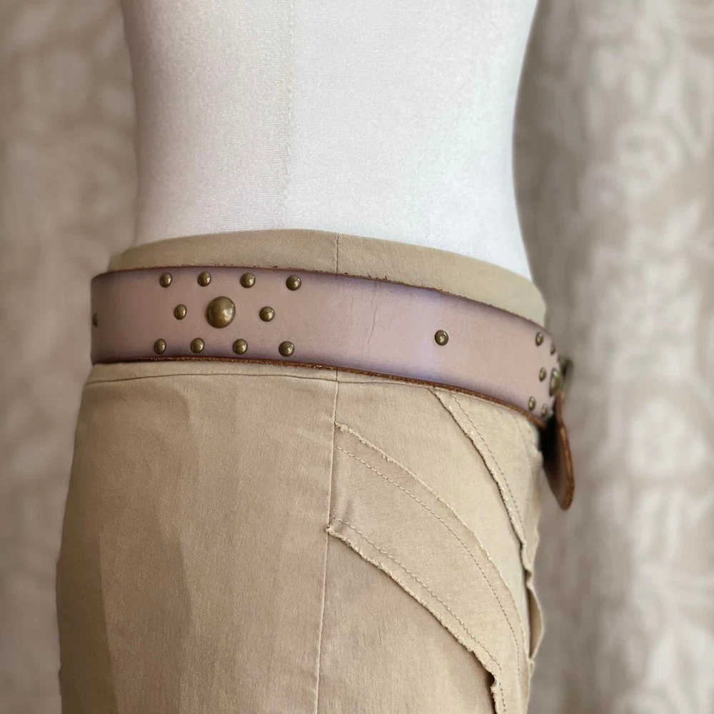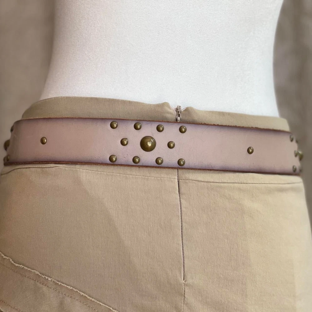 Grunge Stud Belt in Taupe and Bronze Description: taupe colored leather belt with bronze tone buckle and studs by GAP in US women’s size S. Condition: good condition. Some wear to the leather and some creasing throughout, especially in the area with the buckle holes. Dimensions: Length of belt, including buckle: 39.5 inches Length of belt not including buckle: 38.5 inches