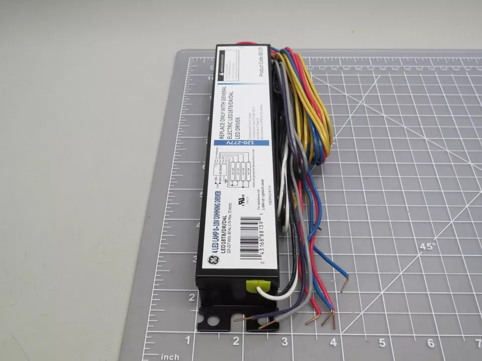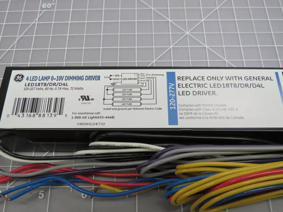 This is a GE LED lamp with a 0-10V dimming driver, designed for T8 fixtures. It consumes 72 watts and operates at voltages of 120-277V. The lamp contains 4 LEDs and is compatible with a T15744 socket.