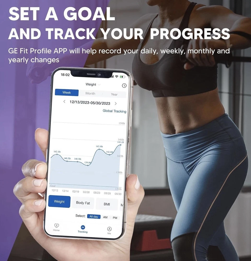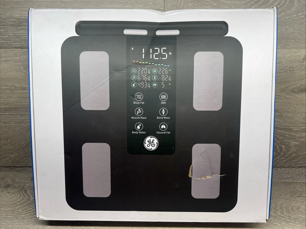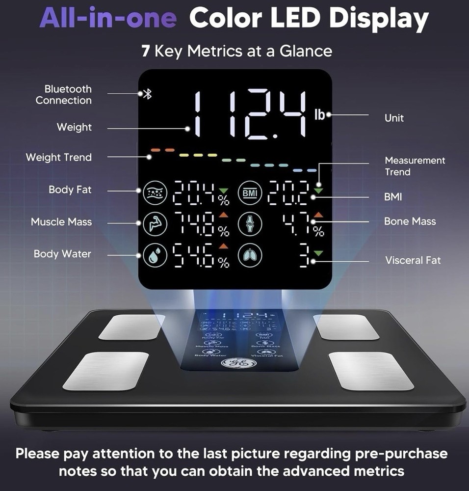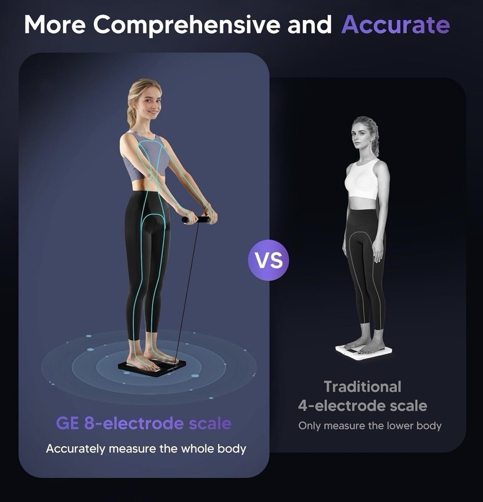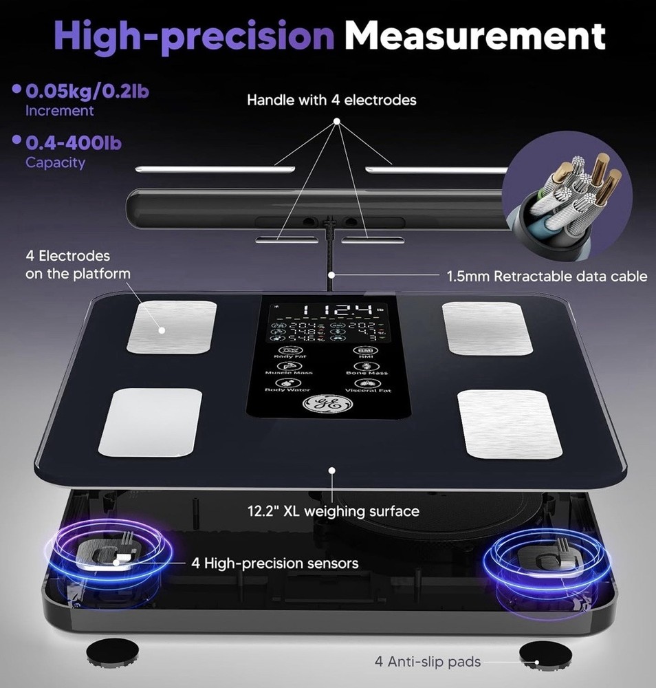 GE Smart Scale for Body Weight: 8-Electrode Digital Bathroom Scale for Weight Fat BMI Muscle Mass Full Body Composition Analyzer 50 Measurements Bluetooth Highly Accurate Weighing Machine 400lb Black