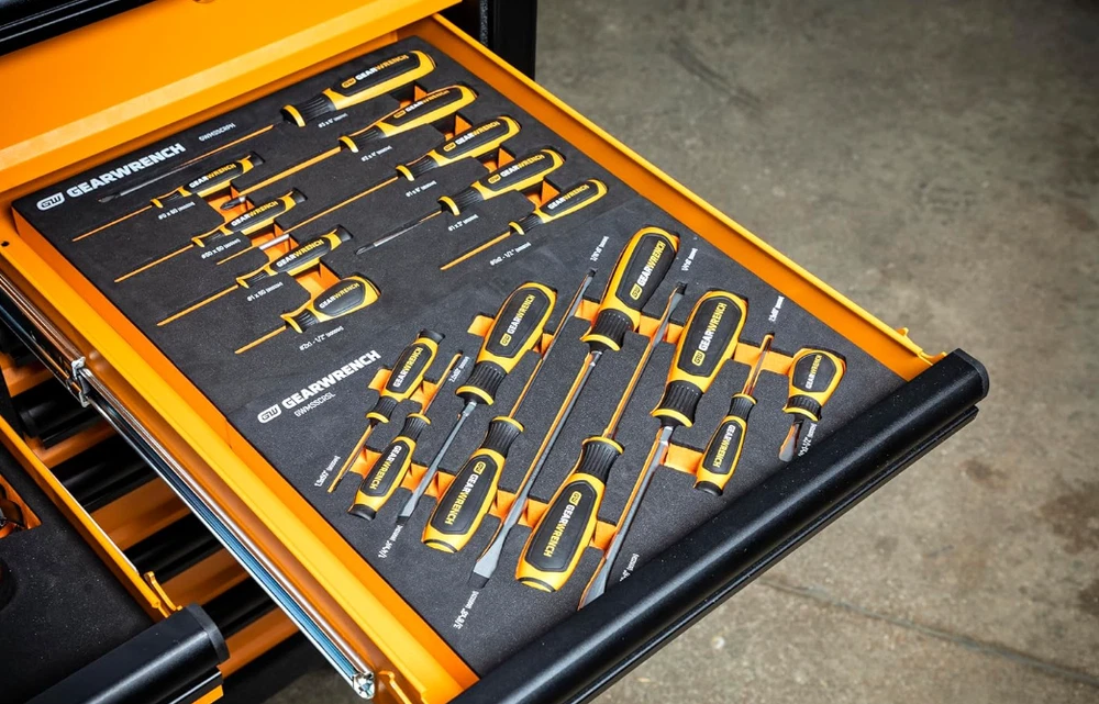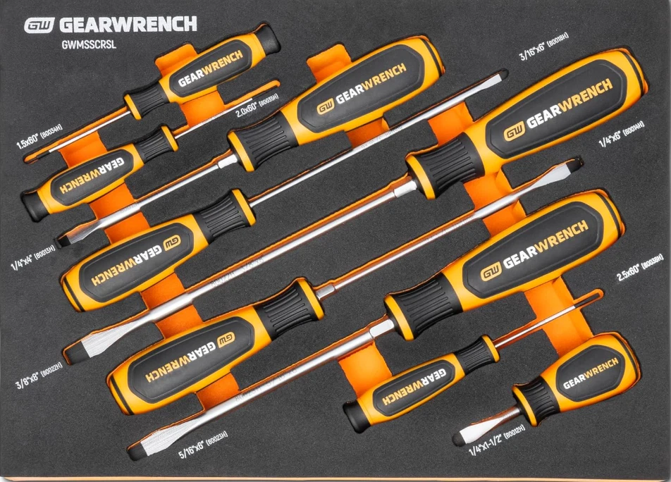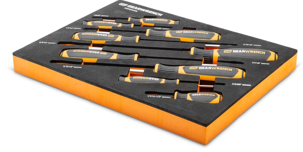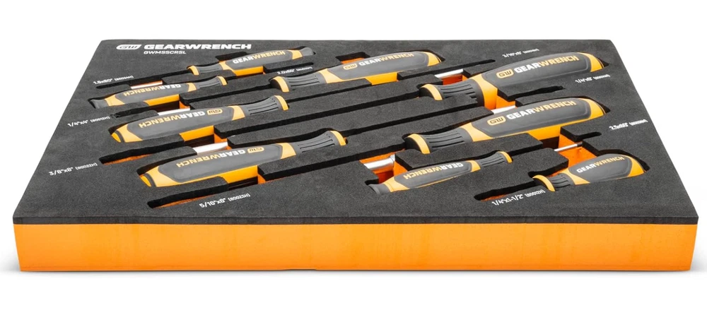 GEARWRENCH 9-Piece Slotted Screwdriver Set in Foam Tray - GWMSSCRSL Dual material handle offers a more comfortable grip and higher performance Non-slip black oxide tip for more secure fit in fastener Ergonomic tri-lobe dual material handle provides the optimal balance of strength and efficiency Full polish alloy steel screwdriver shaft prevents rust and corrosion “Speed Zone” handle design for faster rotation in low-torque applications When you receive your order and have any queries or concerns about the product, feel free to message us. We guarantee 100% resolution for you. Our commitment is to provide high-quality products and exceptional customer service, ensuring your trust and satisfaction.