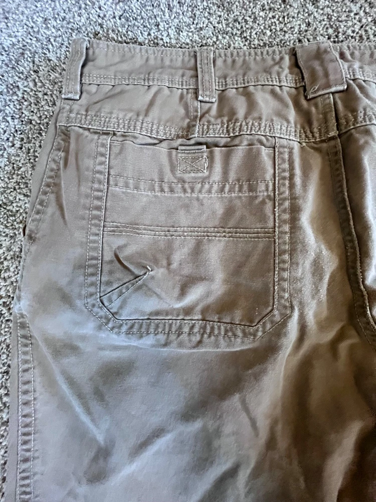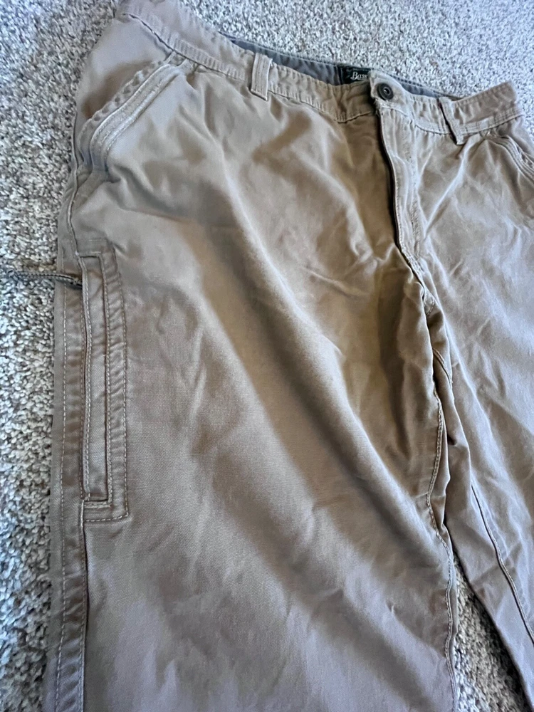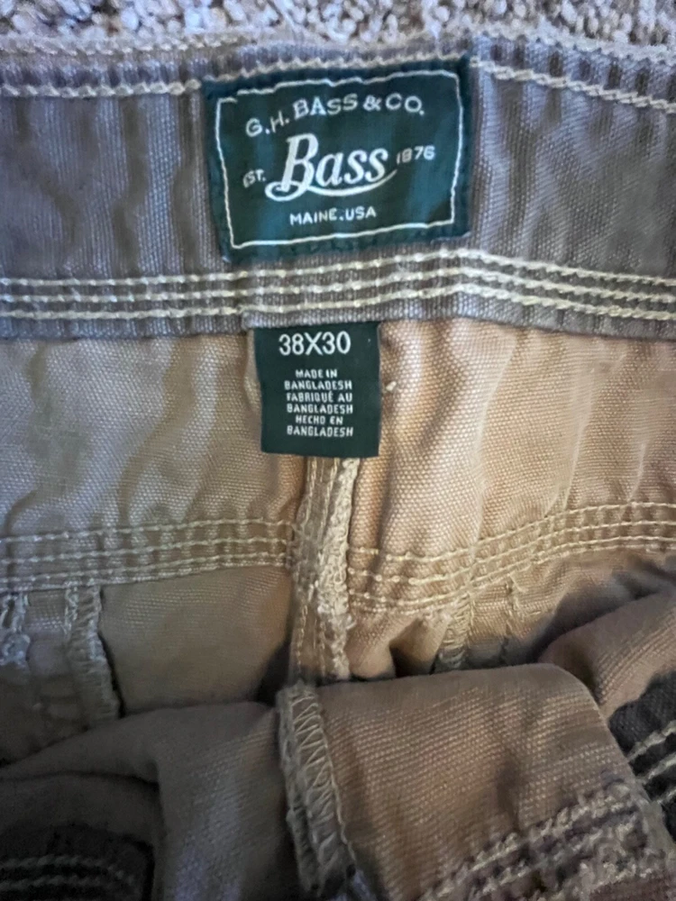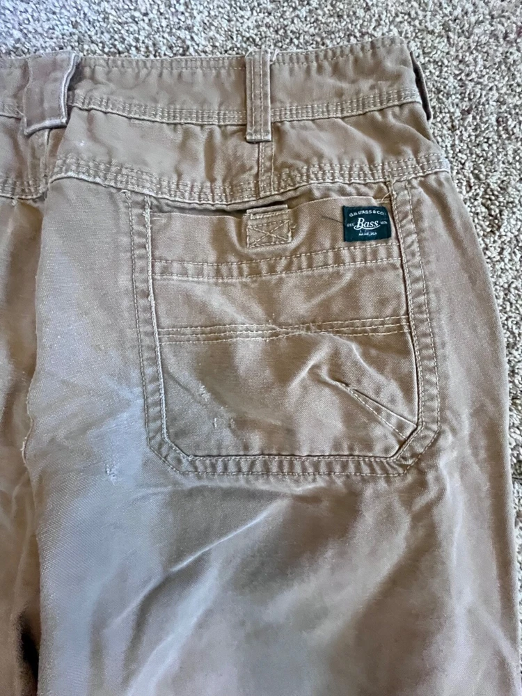 Elevate your workwear wardrobe with these G.H. Bass & Co. canvas work pants. These pants feature a heavy-duty construction with a comfortable fit, making them perfect for winter, fall, and spring seasons. The pants come in a solid brown color and have a flat front with a straight leg style and a mid-rise. The pants have multiple accents including a button, zipper, and logo, as well as a slash pocket for added convenience. They are made from a cotton blend material and are machine washable for easy care. These pants are suitable for various occasions including travel, casual wear, and workwear. Available in size 38x30 some staining on front as seen in photo-should wash out with some effort B