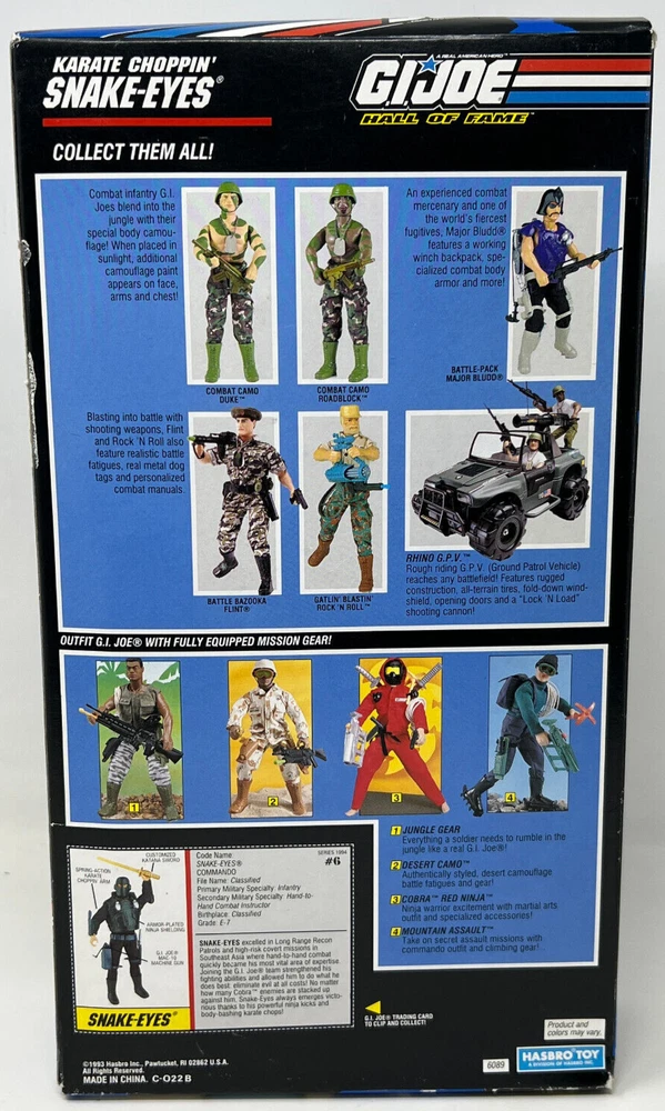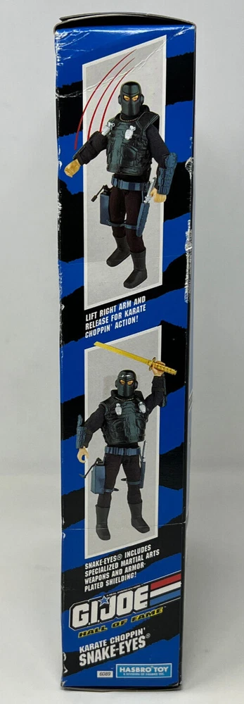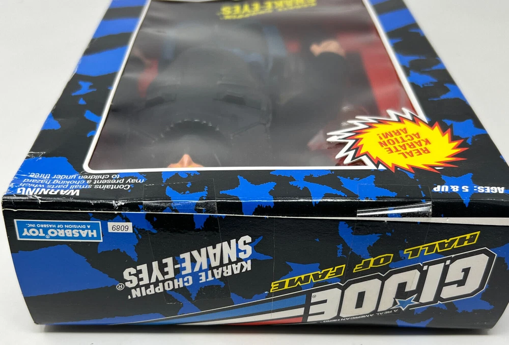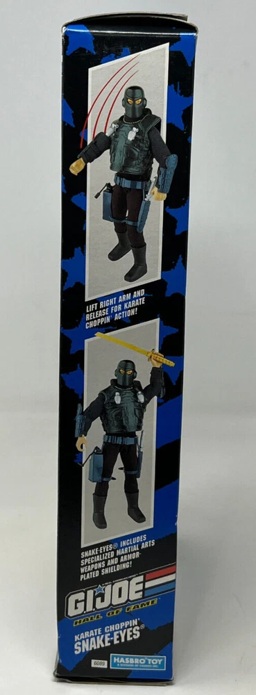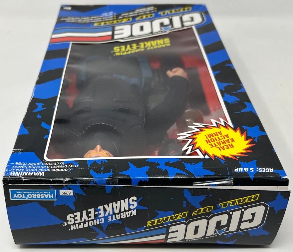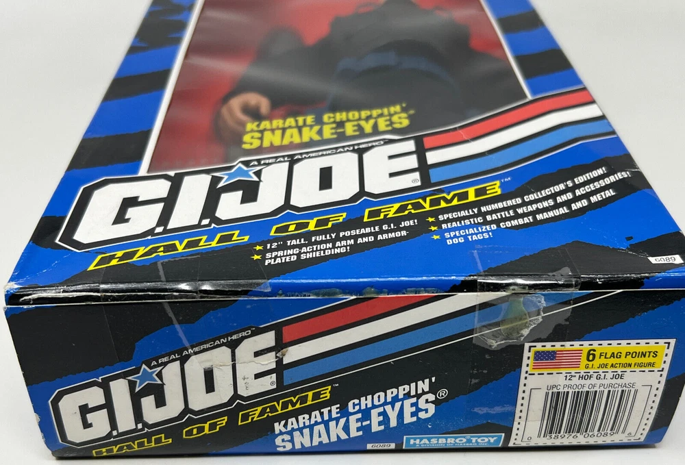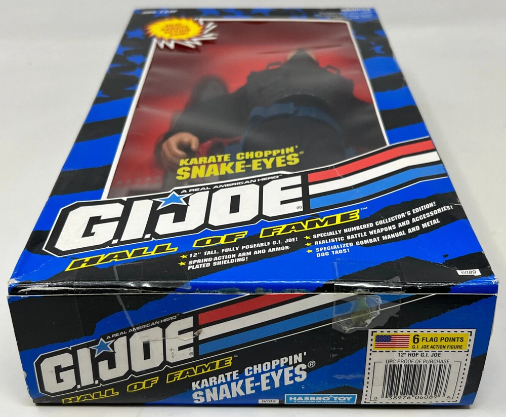 1993 Hasbro GI Joe - Hall of Fame Series Action Figure KARATE-CHOPPIN' SNAKE EYES #6089 Brand new with all accessories. Has been opened and retaped on bottom panel. Storage wear is present. See photos for condition. THE CLASSIC, 12" TALL, FULLY POSEABLE G.I. JOE! BUYER WILL RECEIVE THE EXACT ITEM SHOWN IN PHOTOS. Please review all photos carefully. Photos are of the actual item that the buyer will receive. We provide every angle for your inspection needs. Review the photos thoroughly! Welcome to Gimme Collectibles! Gimme Collectibles was founded in June of 2021 in Orange County, California. We specialize in high quality vintage collectibles from the 1980's and 1990's, including GI Joe, Hot Wheels, Trading Cards, and much more! Please feel free to ask any questions! Thank you for viewing.