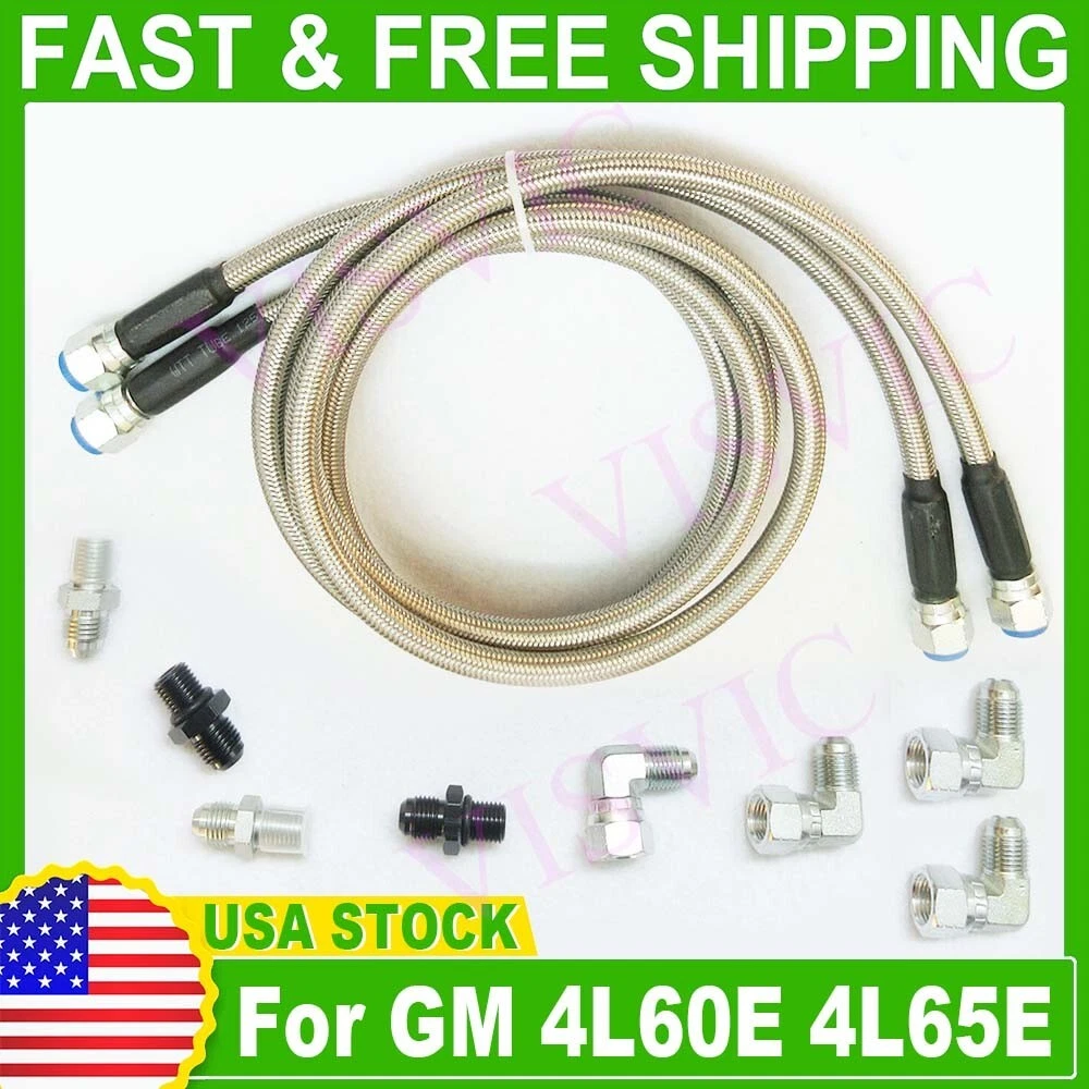 Automatic Transmission Cooler Line Kit -6AN Fiber Braided with Flexible Hoses Fittings GM 4L60E 4L65E Item Description: Fiber & SS braided transmission hoses/ lines, with Stainless Steel Wire used in Middle Layer; ID 3/8" hoses are about 55" & 58” long respectively with AN-6 inverted flare ends. Package Includes: (2) Inner diameter 3/8” hoses with around 55" & 58” length respectively; (4)90 degree adapters/fittings; (2) 1/4” NPS to -6AN transmission fittings; (2) 1/4” NPT to -6AN radiator fittings. Please check pictures for more details. Please check Radiator fitting sizes prior to ordering since some fittings sizes are differ from above listed ones. Thank you! We'll provide extra fittings if needed.