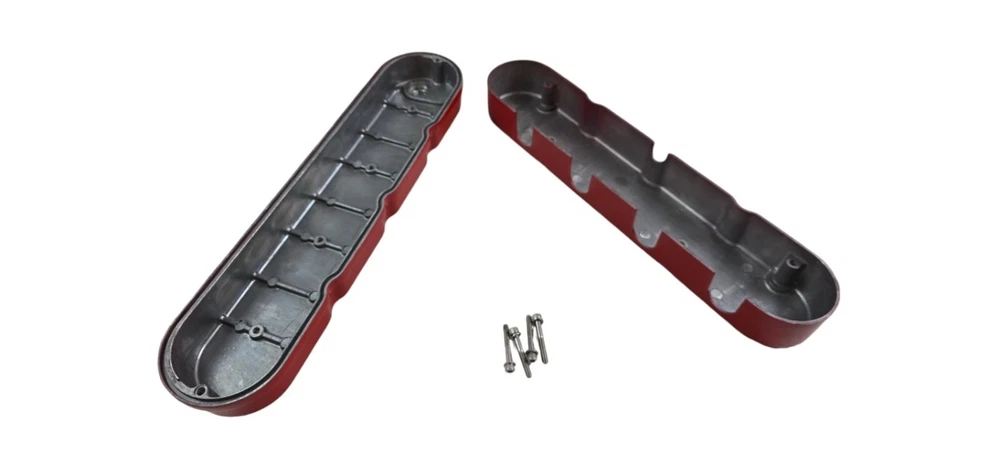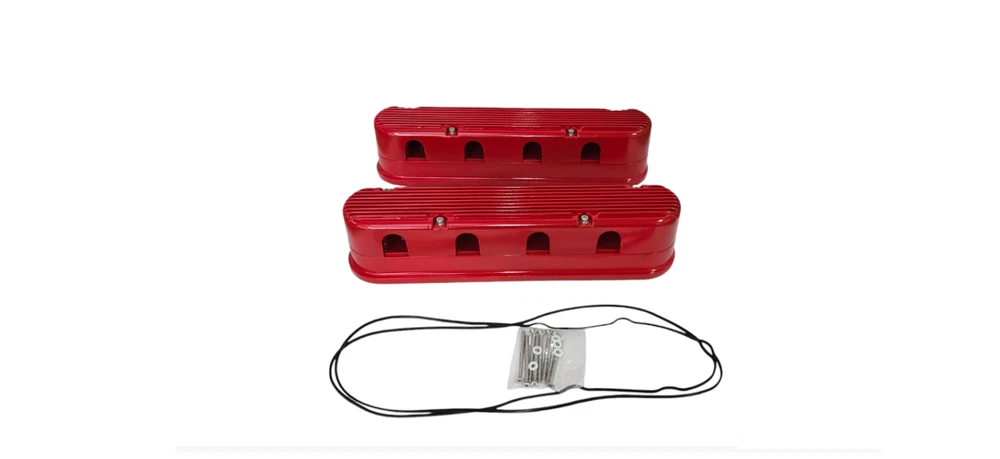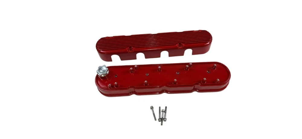 LS GM Finned Cast Aluminum 2 PC Valve Covers w/ Coil Mounts Red. The finned top is secured by allen fasteners. The lower section is where the 510 coil mounts are and the screw on oil cap. Oval all Height is 4.25 includes Gaskets mounting hardware sold as pairs. Fits GM LS-based small block engines Finned cast aluminum valve covers available in RED Mounts Gen 5 LS style ignition coils RED Coated finish 2-piece cover for hiding ignition coils Includes oil fill cap, gasket and mounting hardware Sold as pair 4.25'' Overall Height