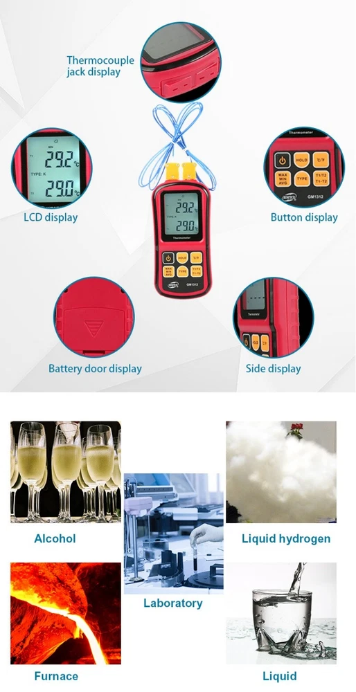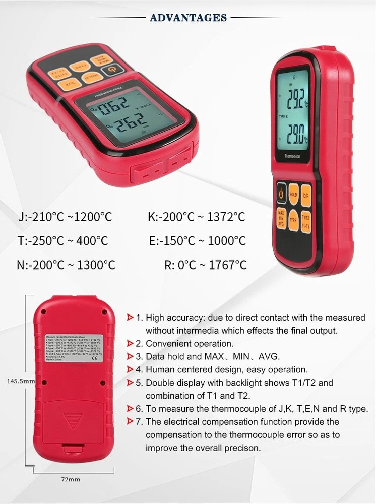 Product Description If you have any questions, please contact customer service first, do not open disputes easily, thank you! Features: 1. High accuracy: due to direct contact with the measured without intermedia which effects the final output. 2. Convenient operation. 3. Data hold and MAX、 MIN、 AVG. 4. Human centered design, easy operation. 5. Double display with backlight shows T1/T2 and combination of T1 and T2. 6. To measure the thermocouple of J,K, T,E,N and R type. 7. The electrical compensation function provide the compensation to the thermocouple error so as to improve the overall precison. Specification: Measuring range: J-type:-210℃ to 1200℃ (-346℉ to 2192℉ ) K-type:-200℃ to 1372℃ (-328℉ to 2501℉ ) T-type:-250℃ to 400℃ (-418℉ to 752℉ ) E-type:-150℃ to 1000℃ (-238℉ to 1832℉ ) N-type:-200℃ to 1300℃(-328℉ to 2372℉ ) R-and S-type: 0℃to 1767℃ (32℉ to 3212℉ ) Resolution: 0.1℃/℉ <1000 degrees 1.0℃/℉ ≥1000 degrees Accuracy: ±0.1%+0.6℃ Input: Bi-channel input General Characteristics: Operating Temperature: 0℃ to 40℃ Storage Temperature: - 10℃ to 50℃ Power supply: 3 * 1.5V AAA batteries (not included) Functions: Data hold and auto power off. Max./ min./ average value measurement. LCD backlight. Celsius and Fahrenheit unit selectable. Dual channel input. Package Includes: 1 * Digital Thermometer 1 * Manual 2 * Temperature Probe Note: The above information and data is for reference only, please refer to the real thing prevail Dimensions are manually measured,please prevail in kind Due to manual measurement, please allow an error of 0-3cm. please make sure you don't mind bidding before. Due to differences between monitors, images may not reflect the actual color of the item. Thank you! About Us We accept all payments authorized by eBay. About Us We accept all payments authorized by eBay. powered by