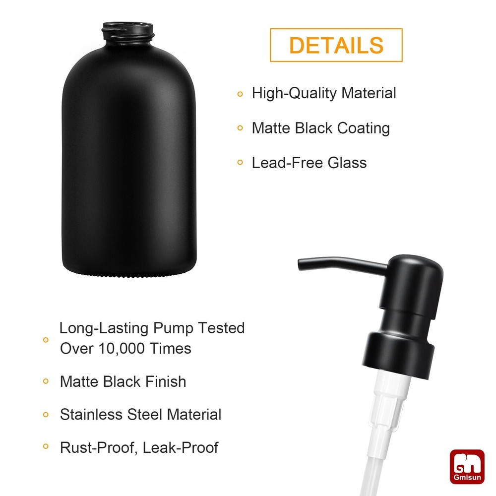 GMISUN Black Soap Dispenser, Dish/Hand Soap Dispenser with Matte Black Stainless Steel Pump, 15 fl oz/450ml Glass Soap Dispensers Set for Kitchen/Bathroom, Modern Refillable Liquid Lotion Dispenser - Buy Now with Fast Shipping! GMISUN Black Soap Dispenser, Dish/Hand Soap Dispenser with Matte Black Stainless Steel Pump, 15 fl oz/450ml Glass Soap Dispensers Set for Kitchen/Bathroom, Modern Refillable Liquid Lotion Dispenser Product Details Color: Black Bottle + Black Pump Material: Stainless Steel Pump+Lead-free Glass Brand: GM GMISUN Product Dimensions: 3"L x 3"W x 7"H Material Type Free: Lead Free Color: Black Bottle + Black Pump Material: Stainless Steel Pump+Lead-free Glass Brand: GM GMISUN Product Dimensions: 3"L x 3"W x 7"H Material Type Free: Lead Free Shape: Round Number of Sets: 1 Unit Count: 1.0 Count Liquid Volume: 15 Fluid Ounces Number of Items: 1 Item Weight: 12.3 ounces Manufacturer: GM GMISUN Country of Origin: China Item model number: MSBLYDXSYP_1PACK Date First Available: January 1, 2023 Key Features ✅ Modern Matte Black Soap DispenserThis liquid soap dispenser features a stylish round shape with a black stainless steel pump, adding a touch of contemporary elegance to any bathroom or kitchen decor. The refillable soap dispenser allows you to easily fill the dispenser with your favorite liquids, making it a practical choice for everyday use. ✅ Hand Soap Dispenser with Stainless Steel PumpMatte black stainless steel made of higher-quality 304 materials, which has the functions of anti-rust, and non-fading. They did not rust after the high salinity test. Made with a 2CC pump core, wider pipe, and tight stainless steel spring inside, a sturdy black stainless steel pump ensures easy dispensing. ✅ Glass Soap Dispenser for Bathroom/KitchenThe hand soap dispenser for bathroom is made of lead-free thick glass to ensure the safety of liquid. The black bottles can prevent the liquid from going bad even under the sun. Compact size that doesn't take up much space, providing a tidy and organized look to your countertop. Say goodbye to bulky soap bottles. ✅ Multi-Scene ApplicationWith a capacity of 15 fl oz, this glass soap dispenser can be used for a variety of liquids such as hand soap, dish soap, lotion, body wash, shampoo, conditioner, and more. Suitable for bathroom countertops, kitchen sinks, shower rooms and more, this dish soap dispenser effortlessly blends into any setting, providing both functionality and style. ✅ Carefully PackagedGMISUN added more packaging materials to reduce the damage to the hand soap dispenser, which is a thoughtful present for housewarming, birthdays, or any special occasion. If there is any damage or accessories omission to the kitchen soap dispenser, please get in touch with us, and we will solve it ASAP. Product Description