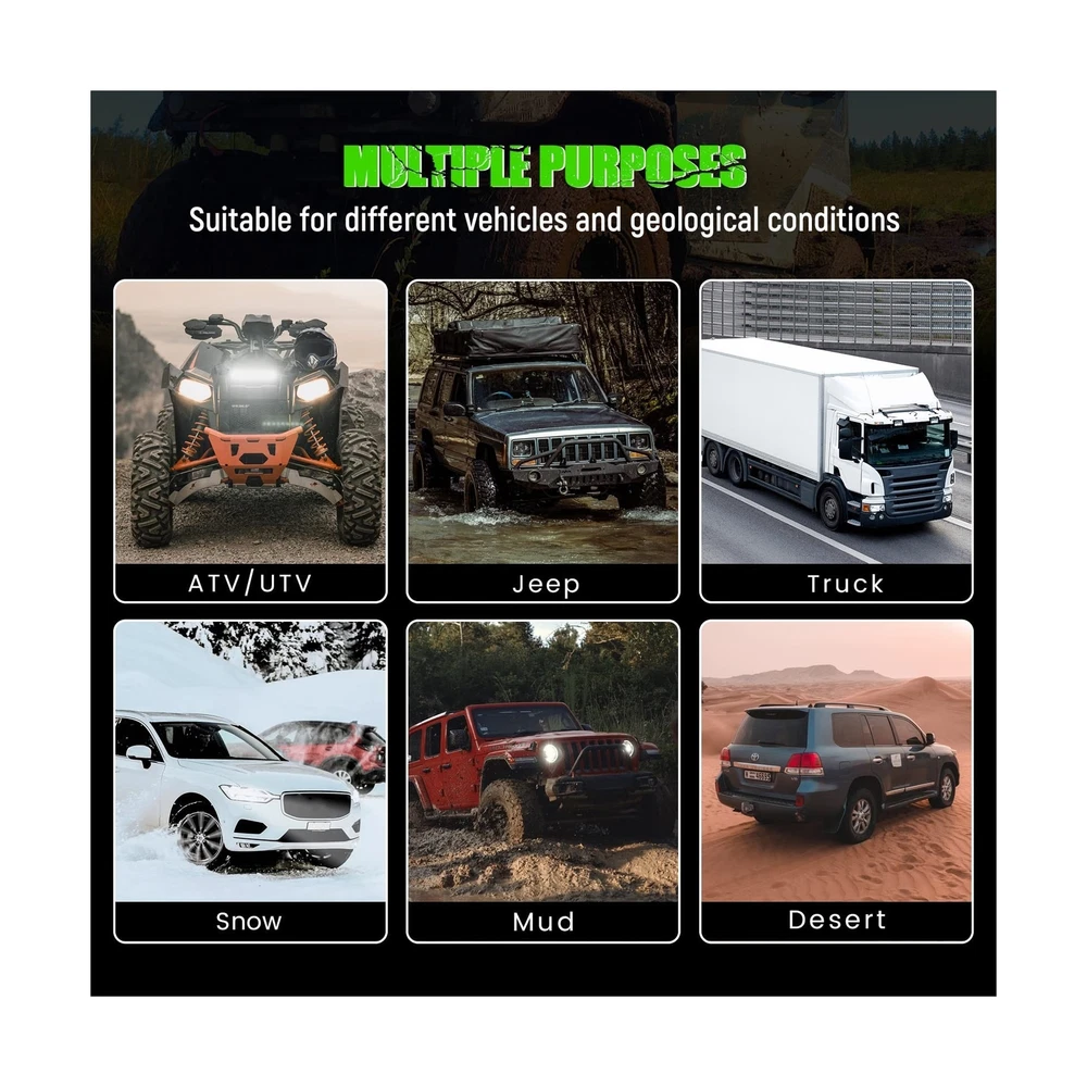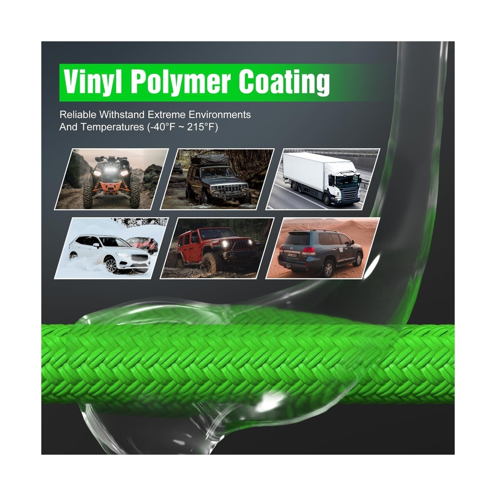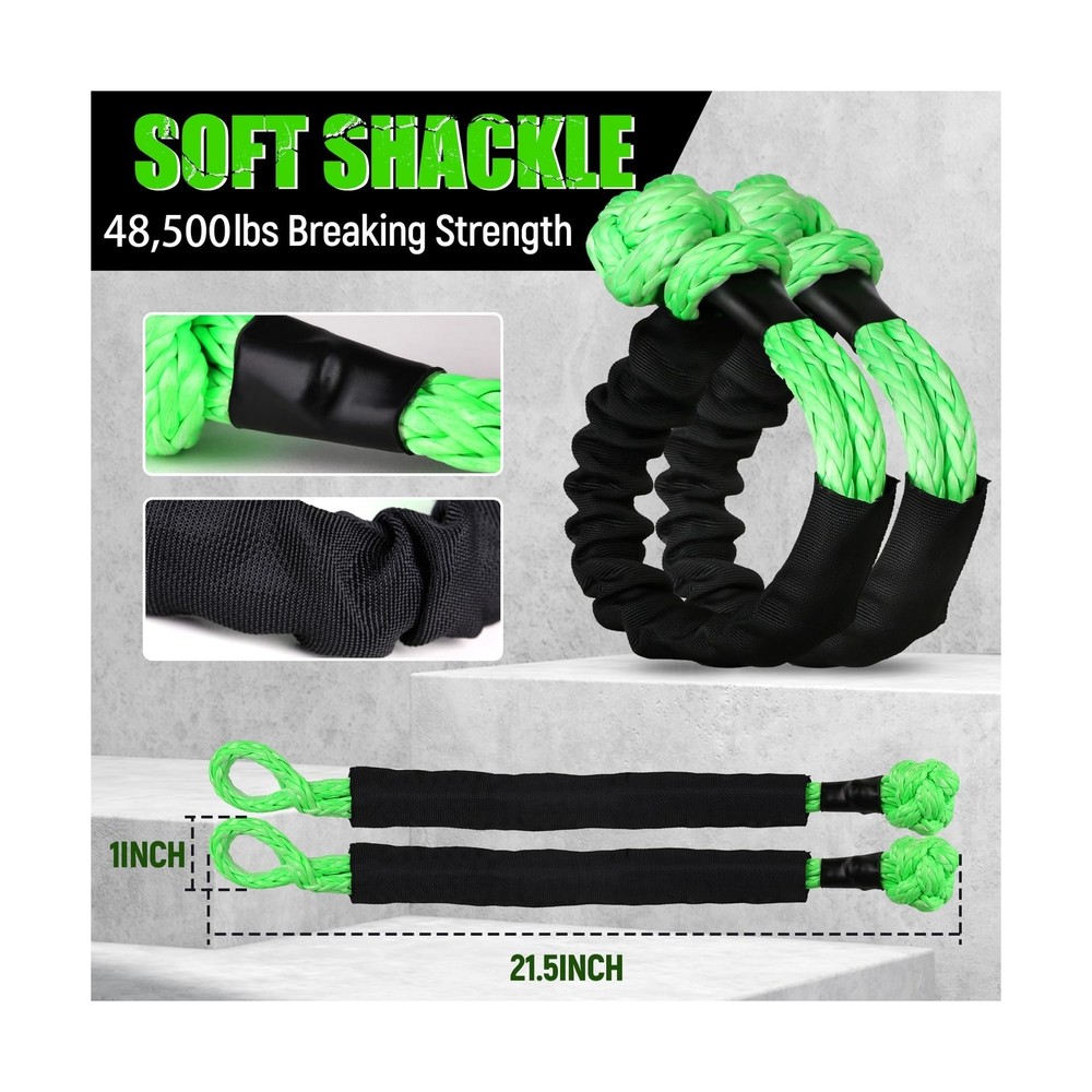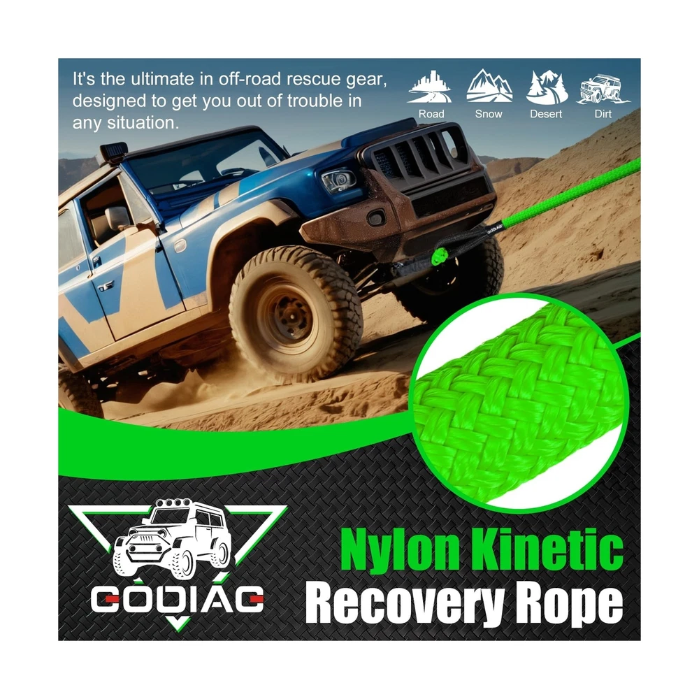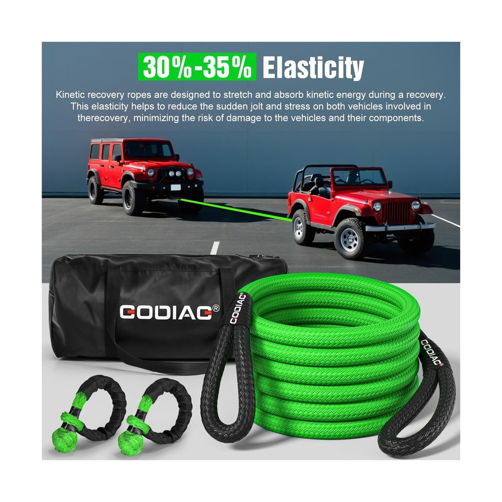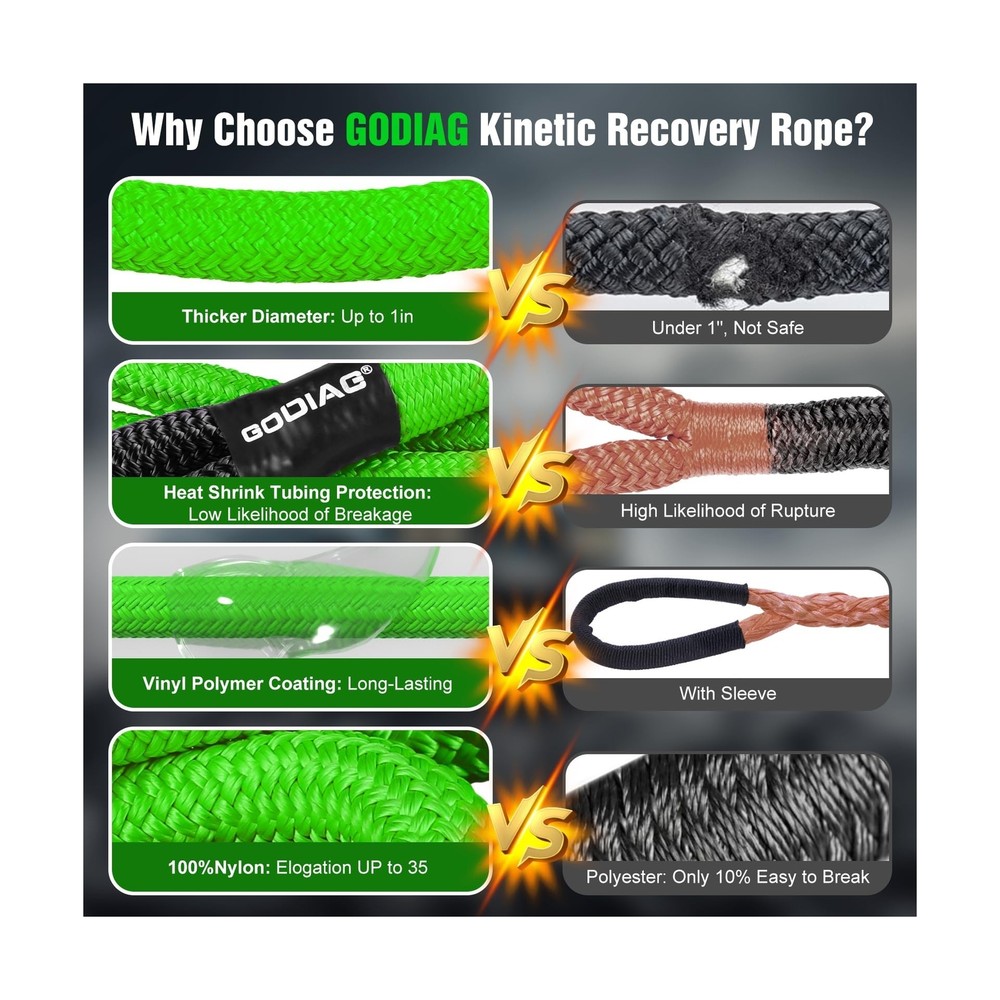 Unprecedented Breaking Strength: With a remarkable breaking strength of 46,500lbs, GODIAG green kinetic recovery rope surpasses traditional wire winch ropes by 45% in efficiency and is 2-3 times stronger than standard tow straps. Ensures safety during the rescue process even when overloaded and is ideal for all sizes and types of vehicles, from jeeps and trucks to ATVs and tractors Enhanced Elongation Capability: Engineered using high-strength nylon material with superior resilience and abrasion resistance, heavy duty offroad recovery rope offers an elongation capacity of up to 35%. This enables it to effectively and safely extract vehicles stuck in challenging terrains like mud, sand, snow, or steep slopes, without transmitting excessive impact forces, thus minimizing the risk of vehicle damage. UHMWPE Soft Shackle: Equipped with a UHMWPE soft shackle boasting a breaking strength of up to 48,500lbs, our recovery cord ensures maximum durability and flexibility. Unlike traditional D-ring shackles, soft shackles maintain their strength and flexibility even in harsh conditions, resisting rust and preventing overheating and slippage during traction, while also safeguarding the tow rope from abrasion. Double Diamond Braid and Vinyl Polymer Coating: The double braid shell of our recovery strap is infused with a vinyl polymer coating, offering exceptional waterproof and UV-resistant properties. Withstanding temperatures ranging from -40°F to 215°F, it ensures durability in extreme conditions. Additionally, both ends of the nylon kinetic rope feature polyurethane coatings for increased wear resistance, corrosion protection, and easy cleaning. Safety Precautions: Considering various factors such as slope, road conditions, and instantaneous acceleration during towing, we recommend utilizing heavy-duty recovery ropes with higher load capacities to ensure safe and effective vehicle recovery operations. GODIAG snatch rope has undergone rigorous quality inspections, making it an ideal choice for trucks, jeeps, pickups, and other small vehicles, providing peace of mind in every recovery situation. On Dec 14, 2025 at 23:45:11 PST, seller added the following information: On Jan 11, 2026 at 22:26:09 PST, seller added the following information: