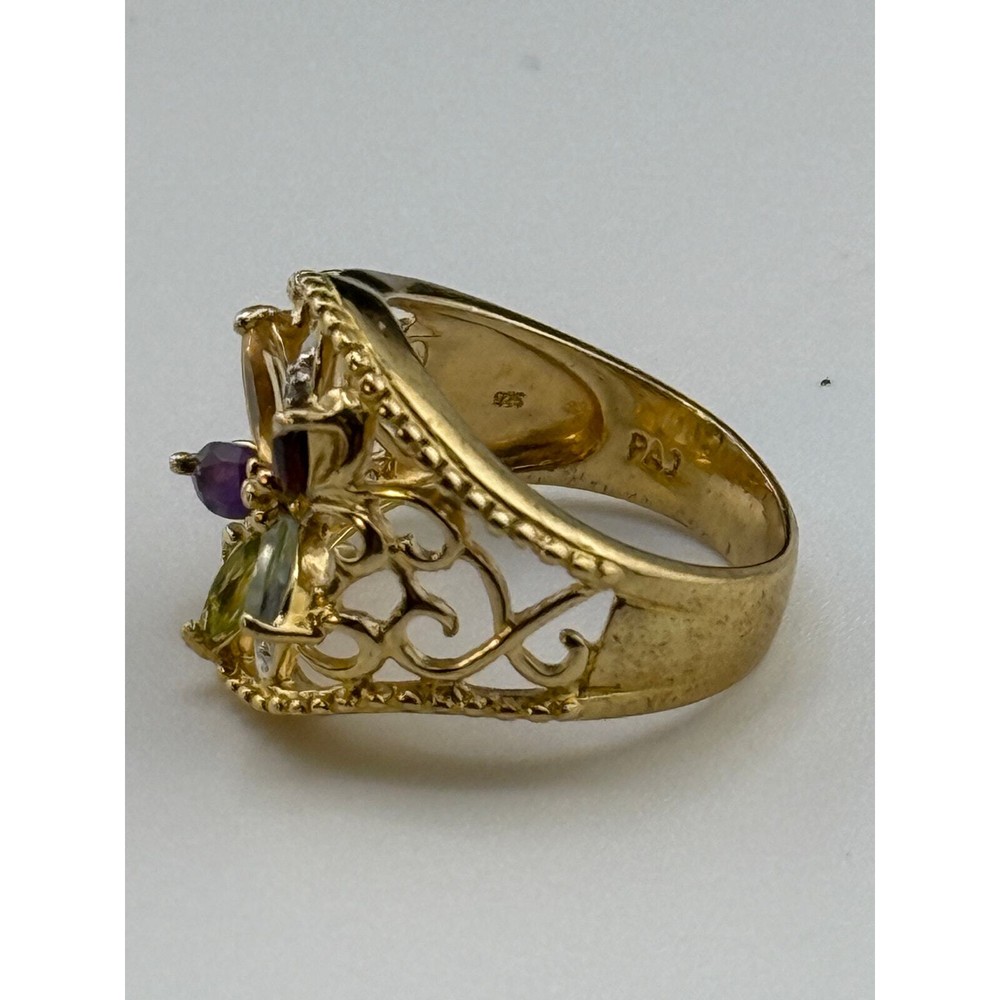 Beautiful ring in gold plated sterling silver with 5 semi-precious stones including Amethysts, Citrine, and more. Size 8 and signed "PAJ" Stamped 925. Setting is approx. 0.75 by 0.6. Gorgeous statement ring.