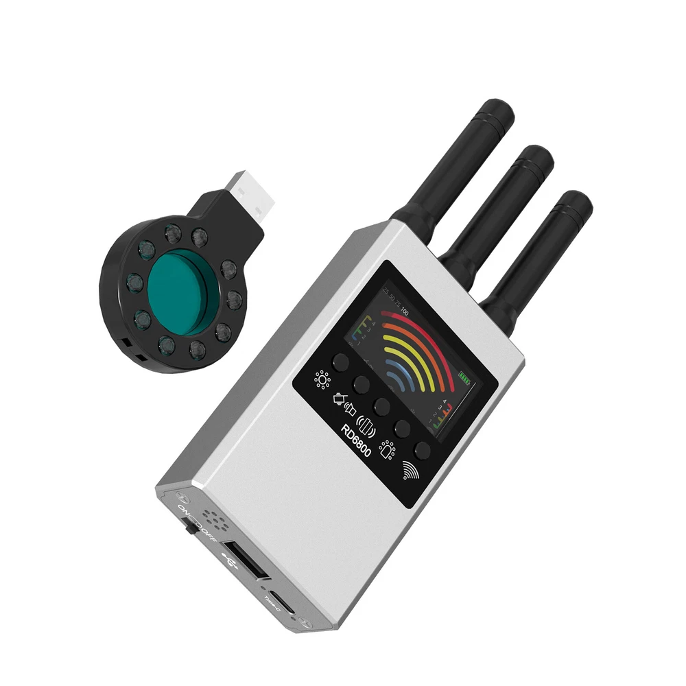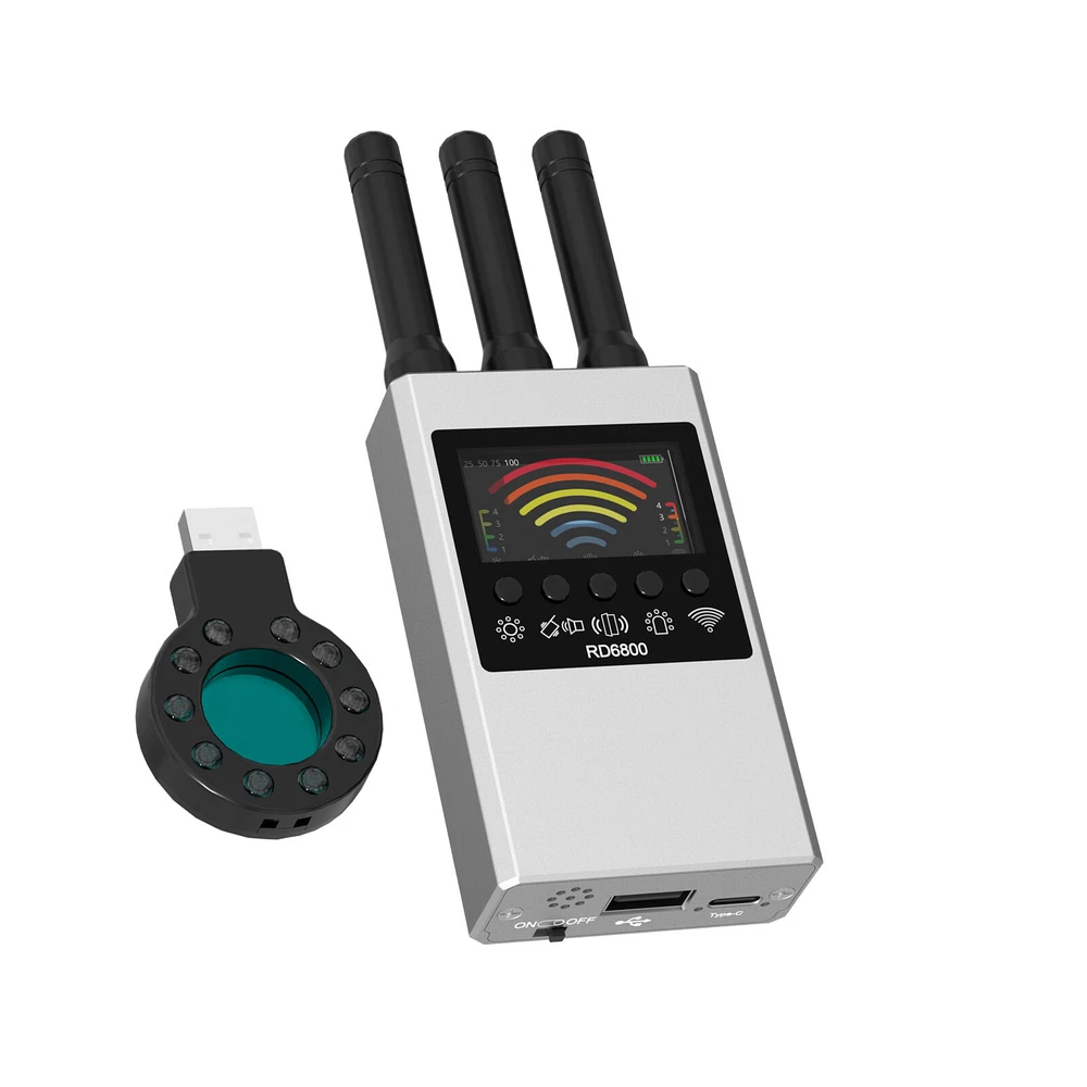 Product Description Features: 1. Digital control high sensitivity professional wireless detection device, used to detect 300-2700MHz. 2. Easy to use, with two alarm methods: sound vibration and LED indicator light, accurate and reliable. 3. This device can detect 2G, 3G, 4G and wireless devices, 1.2G/2.4G&5.8G wireless cameras, and accurately locate GPS. 4. It can detect whether private addresses such as rooms, bedrooms, meeting rooms, fitting rooms, hotels, cars, entertainment venues, etc. have been installed with listening devices or secretly filmed with mini cameras, and whether mobile phone cards are inserted for eavesdropping Micro camera with storage card, mobile undercover software, GPS car tracker. 5. Compact body, easy to carry. 6. In complex environments, it can effectively filter out clutter interference from signals and accurately capture stable signal sources for analysis. By adjusting sensitivity with buttons, the direction and distance of the signal source can be determined. 7. Simple design, full button operation, separate display of signal strength and sensitivity, allowing users to quickly get started. Product details: Frequency range: 300MHz-2700MHz Detecting dynamic range:> 73db Indication method: 10 level LED illuminated indication Variable tone indication Power supply: Built in 3.7V 1000mAh lithium battery Working current: 60mA Continuous work: 8-12 hours Detection sensitivity:< 0.03mw Detection range: 5.8G: 15 square meters (standard 10MW) 2.4G: 10 square meters (standard 10MW) 1.2G: 10 square meters (standard 10MW) Mobile signal 2G/3G/4G: 15 square meters Material: Metal This product supports USB interface camera lens scanning detector, 10 infrared lights super bright detection, covering a long distance, and the lens reflection point is clear and visible, making it easy to see the pinhole lens reflection point 5 meters away The camera lens detector can be plugged into any portable power bank, powered by a USB port on a power bank, plug and play, and quickly used The camera lens scanner supports connecting to our company's detector G338 G368 G638 G738 G768 RD6800 RD6800W RD6800M RD6800MW for plug and play and quick use