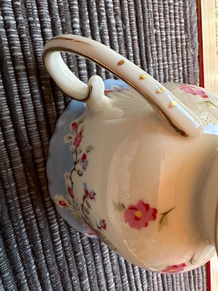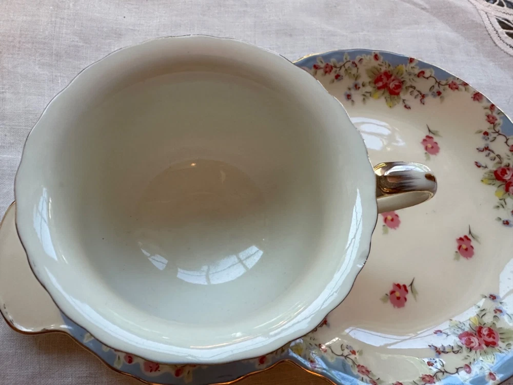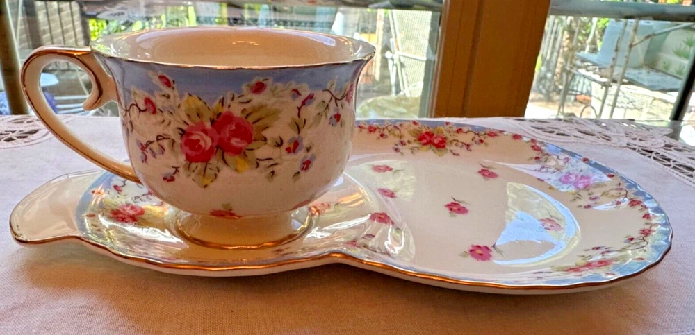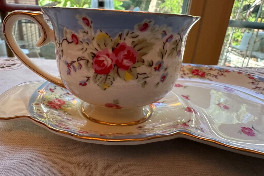 GRACE TEAWARE SNACK PLATE AND CUP SET PORCELAIN BLUE BAND PINK ROSES GOLD RIMS