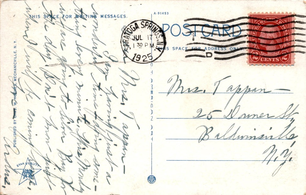 MAKE AN OFFER. THE MORE YOU BUY THE BETTER DEAL I WILL ACCEPT The postcard depicts the Grand Union Hotel in Saratoga Springs, New York, as seen from City Park. The message on the back is addressed to Mrs. Tappen, mentioning a person named Pam Baring having a great time studying something every minute. It also notes plans to visit Silver Bay for the day and asks about the recipient's arrival.