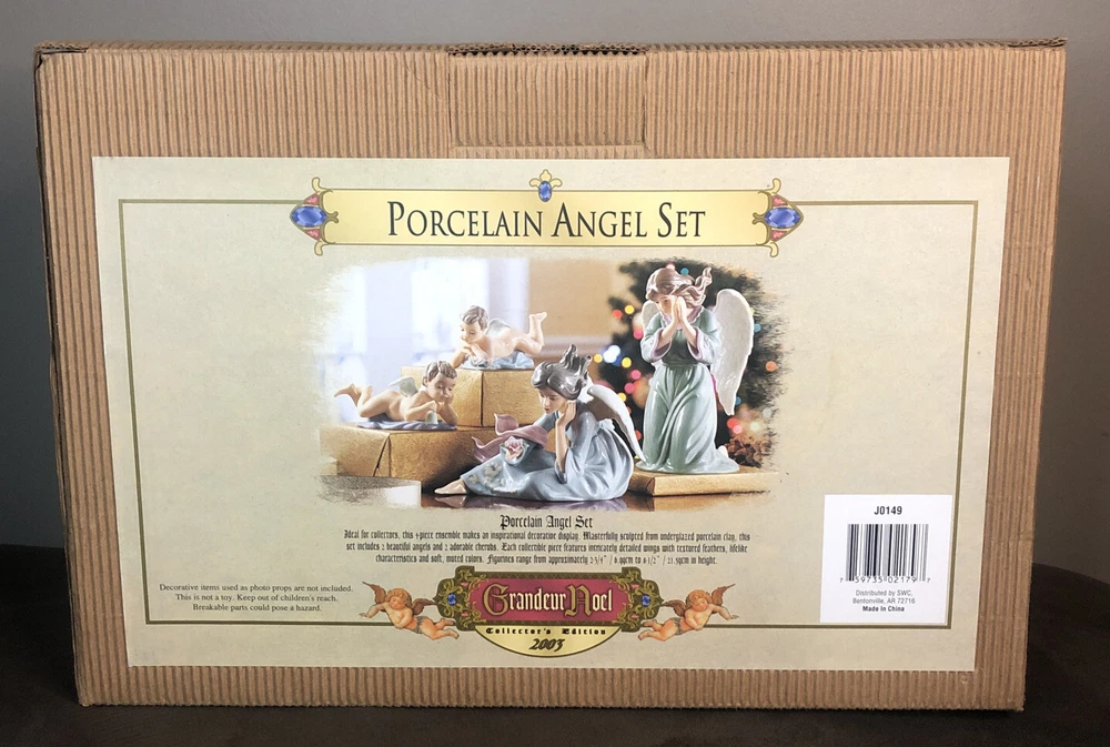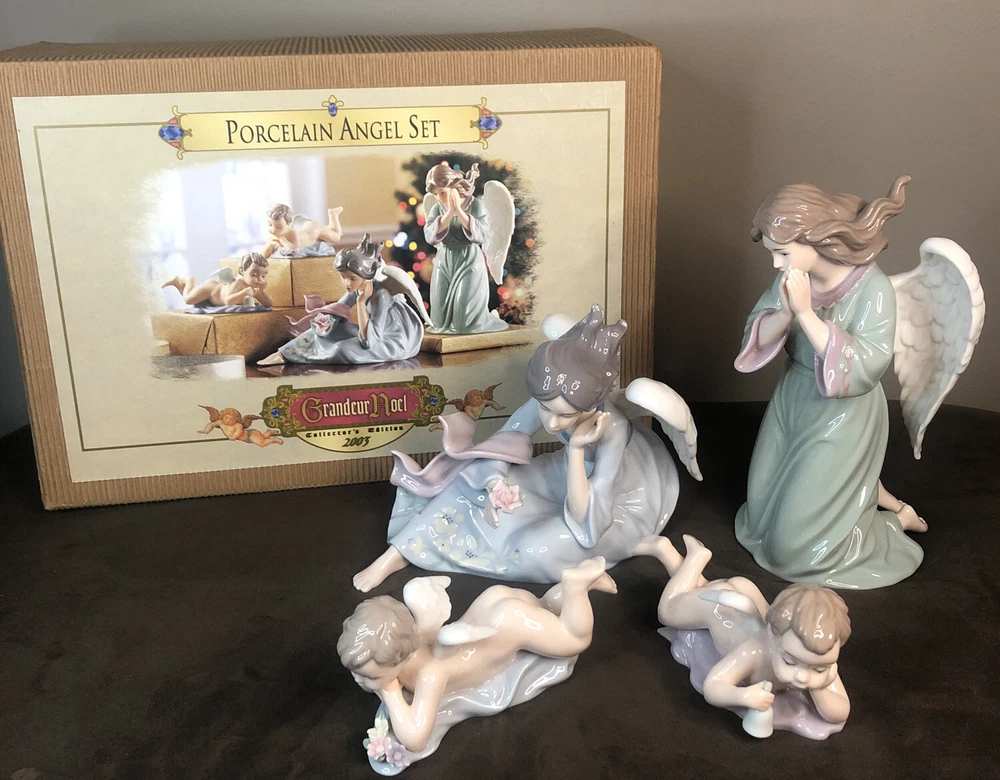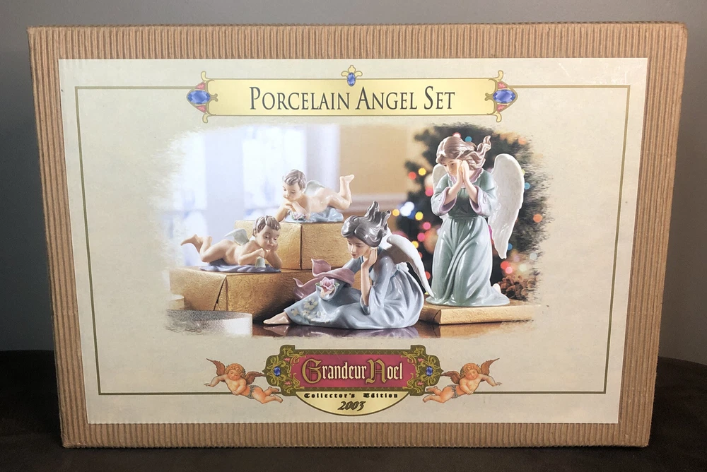 Grandeur Noel ~ Collector's Edition 2003 ~ Porcelain Angel Set ~ 4 pieces NEW, only taken out of the box for the pictures. Sizes approx: Fast shipping from a reliable seller! USPS, UPS, or FedEx at our discretion. Pictures are included in the description, please look them over and ask any questions you may have. Colors may vary in pictures.Preowned items may have some signs of previous wear or usage.