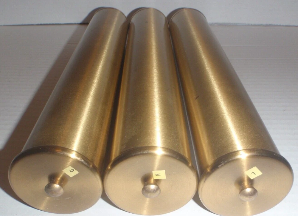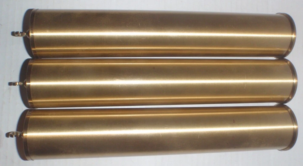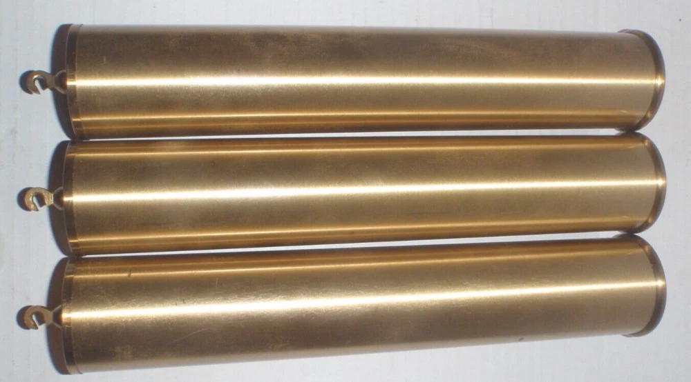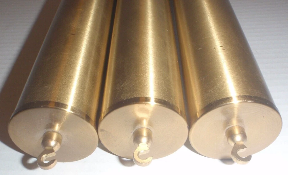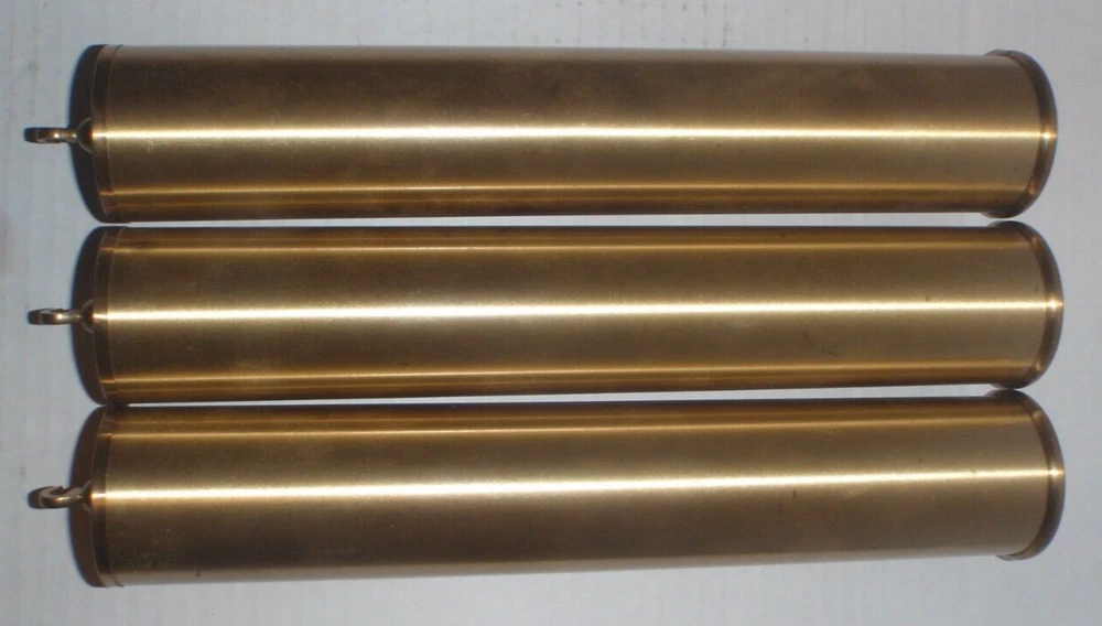 SET OF 3 GRANDFATHER CLOCK WEIGHTS Brass Shells with INSERTS as pictured. Removed from a Grandfather clock. These can be used for many makes/models of grandfather clocks like Howard Miller, Ridgeway, Sligh, Trend, Emperor and others. Have scratches, marks, dents, tarnish and general imperfections as pictured. I'm using a bathroom scale to weigh these so the weight on each one is approximate. Two at 7 Lbs., one at 4 1/2 Lbs. See pictures for measurements. Pictures are part of the condition description. Sold as is as pictured with no returns. See my other listings!