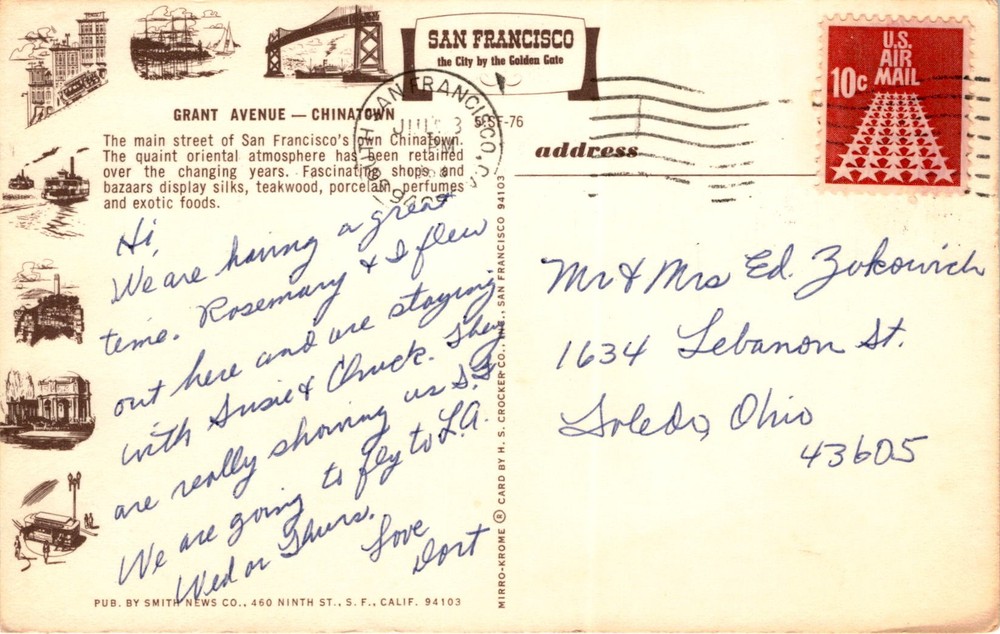 MAKE AN OFFER. THE MORE YOU BUY THE BETTER DEAL I WILL ACCEPT This postcard features a vibrant image of Grant Avenue in Chinatown, San Francisco. Chinatown is a historic neighborhood in the city, known for its rich cultural heritage and bustling streets. The area is famous for its Chinese architecture, shops, and restaurants, all of which contribute to its unique atmosphere.