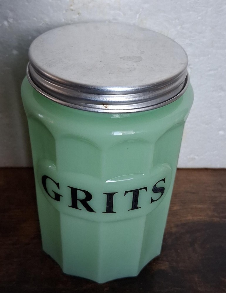 Jade Grits Canister with Screw On Lid. Measures 5 Inches Tall Including Lid. Nice! Upblrm