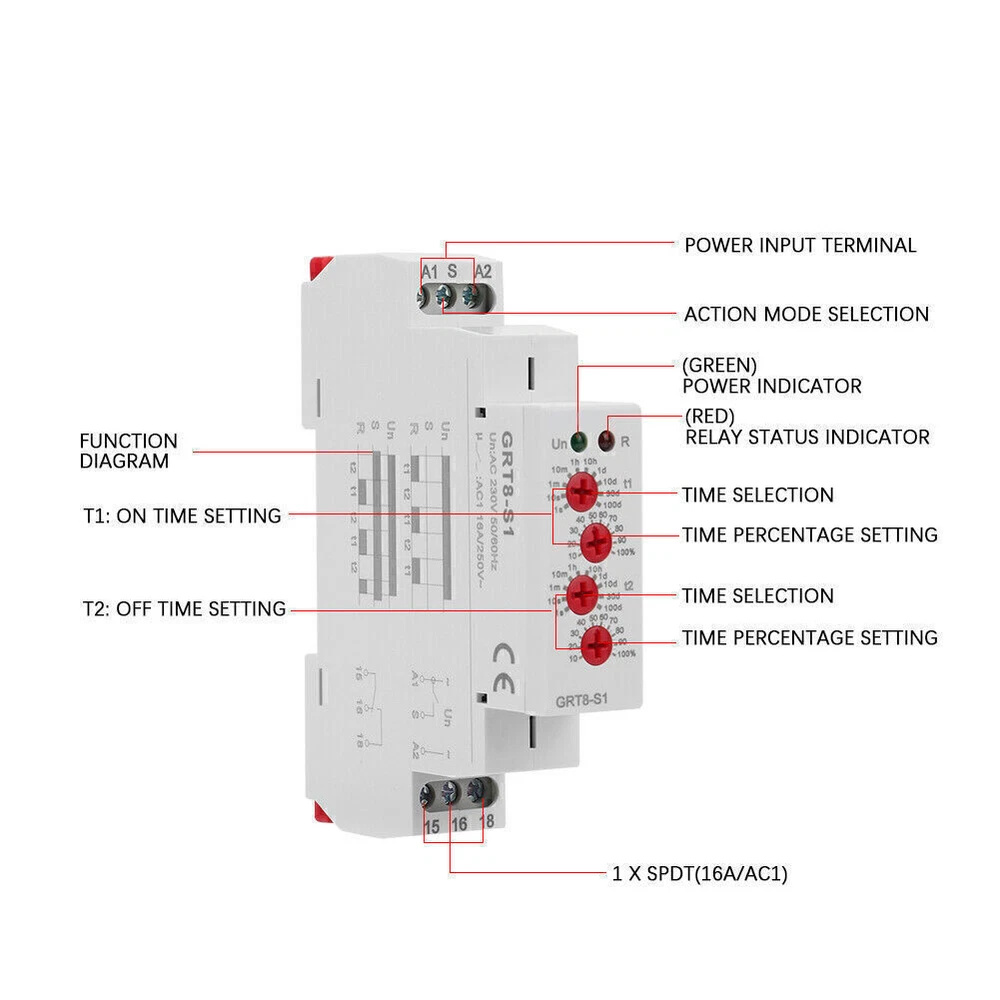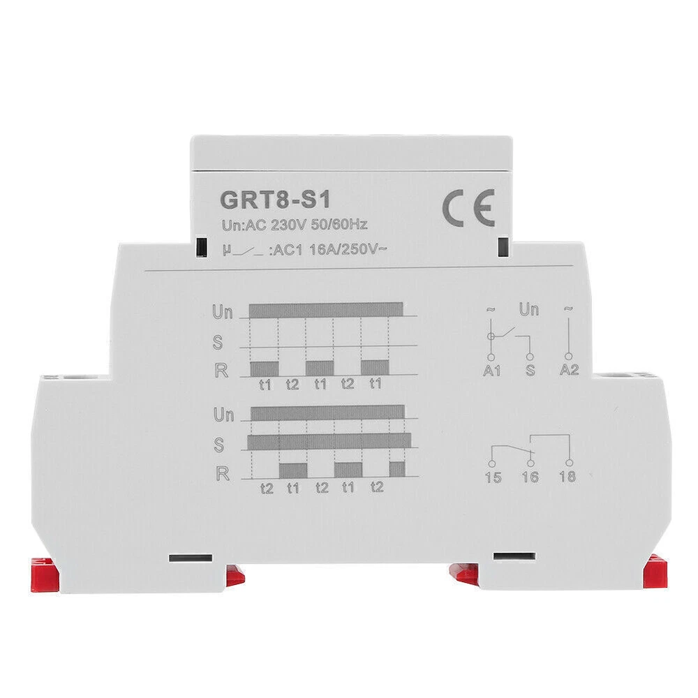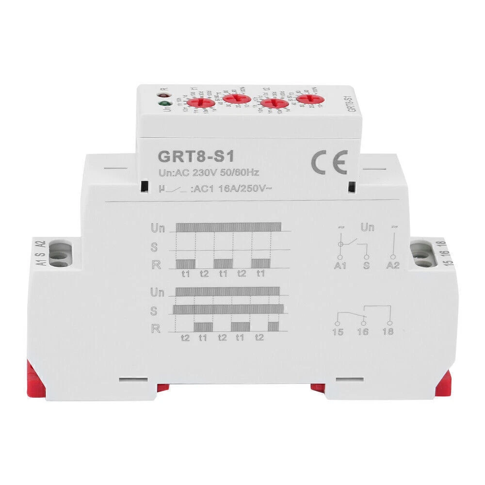 Features: 1. Time setting for delay ON and OFF is separated so you can set different delay time. 2. Super wide delay time range, 0.1 second - 100 days settable (10 selections). 3. Switch different working modes by short-circuiting S-A1. 4. Relay working status is indicated by LED indicators. 5. With small volume, this relay can be mounted on 35mm DIN rail. 6. It is used for cycle delay control, providing periodic energizing, lighting control and heating control for electric circuit. Specification: Model: GRT8-S1 Rated supply voltage: AC 230V(50-60Hz) Power consumption: AC max.6VA/1.3W Delay time range: 0.1s-100days, NO, NC Setting method: knob Setting accuracy: 10% Repeated accuracy: 0.2% Temperature fluctuation error: 0.05%/ ℃ , at = 20 ℃ Output contact: 1 x SPDT, 16A/AC1 Minimum switching power: 500mW Power indicator: Green LED Output relay indication: Red LED Mechanical life: 1x10 7 Electrical life: 1x10 6 Reset time: Max 200ms Working temperature: -20 ℃ ~55 ℃ Storage temperature: -35 ℃ ~75 ℃ Mounting method: 35mm DIN rail Protection grade: IP20 Wiring capability: 1x2.5mm 2 / 2x1.5mm 2 Dimensions: 90*18*64mm / 3.54*0.71*2.52in Package weight: Approx. 75g/2.6oz Package L ist: 1 * Cycle Timer Relay Note : 1. Due to the difference between monitors and light effects, the pictures may not reflect the actual color of the item. 2. Please allow slight error due to manual measurement. Thanks for your understanding. All the items will be dispatched within one business day by Airmail after the payment is clear. Most times you will receive your order within 10-30 business days after we transfer your package to the delivery company. We cannot guarantee the delivery timeframe if the post office has any unexpected delays due to holiday,weather,customs, or other conditions. Some countries like Russia, Brazil, or some European countries may take up to 50 days or longer for delivery. We appreciate your patience if you haven't received items in 30 days(Russian customers may need more patience by reason of the local delivery system and/or customs). If you are concerned in any way, please feel free to contact us via ebay message instead of leaving negative/neutral feedback or opening a dispute . We will do our best to solve any problem(resend or refund any missingitem). Customs duty is obligation and liability of citizens in yourresponsible for any tax and custom duty incurred. Generally, thedelay or failure delivery is sometimes caused by the policy of different customs. Our listing price includes the value of goods,packaging cost,and export taxes,not including international duties. duties,taxes,and charges are not included in the item price or shipping fee. The duties are buyers' responsibility. Please check with your country's customs office determine what these additional costs will be prior to your purchase. All disputes arising from the duties will be submitted to ebay for solution. Any questions, pls. contact us via ebay message or email us. We will reply your message within 48 hours. If you do not receive our reply within 48 hours, pls. post a message again because sometimes our message system may block some emails. If you are satisfied with our service, pls. kindly leave us a positive feedback and give us the Detailed Seller Rating with all " 5 " in very area. Our aim is to provide Level Customer Service, your recognition will encourage us greatly and serve you better. We strive to keep all our customers satisfy. We will do our up most to exceed your expectations in customer service, communication and dispatching of your orders.