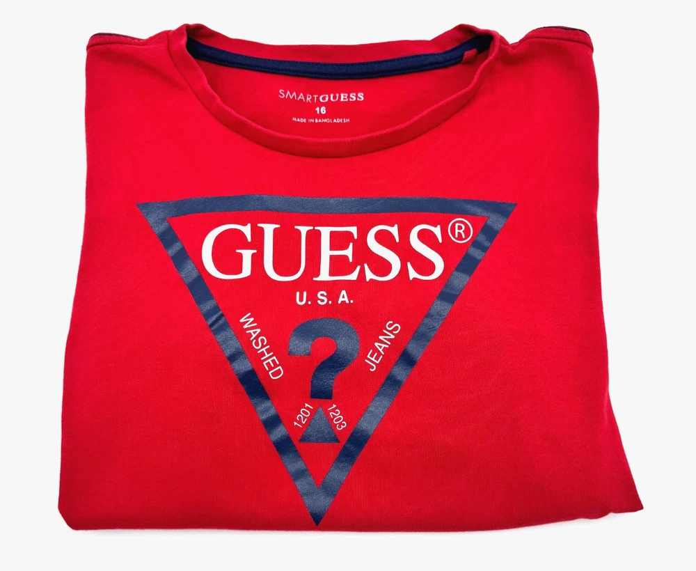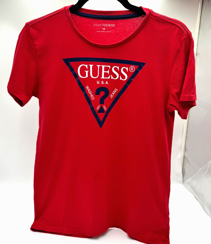 GUESS Unisex Red Triangle Logo T-Shirt Size 16 Youth / Adult Small Pre-Owned Elevate your casual style with this bold and iconic GUESS red triangle logo T-shirt , designed for both youth size 16 and adult small fit. This pre-owned tee brings brand recognition and street-ready appeal to your wardrobe at a great value. Condition: Pre-owned in excellent condition with minimal signs of wear. A subtle shoulder mark is present (visible in close-up photos), though virtually unnoticeable. • Brand: Guess (SmartGuess line) • Size: 16 (Unisex) • Design: Iconic Guess triangle logo in navy and white on bold red fabric • Neckline: Crew Neck • Sleeves: Short Sleeve • Material: 100% cotton jersey for breathable, comfortable wear Perfect for layering under jackets, pairing with jeans or skirts, or adding a pop of retro style to any casual outfit. Care instructions: Machine wash cold inside out. Ships promptly from a smoke-free, pet-free home. Picture in this listing correspond to the product you are getting. We shoot them in our studio, please see the pictures for more details and allow some differences in color because of the light we use in our studio. At Gianna Clare Store we care 100% about your satisfaction. If you encounter any issues or if something doesn't meet your expectations, we kindly ask you to contact us through the " Ebay - Ask Seller A Question " before leaving negative feedback. We are committed to resolving any problems as quickly as possible and ensuring you have a positive experience with us. Your feedback is very important to us, and we will do everything we can to assist you. Shipping: We ship Monday to Friday. Returns: Please read the item description before buying. We only accept returns if the product doesn't correspond to the description. If yours, is a special case please contact us beforehand so we can give you an appropriate solution. Thank you for shopping and trusting us!