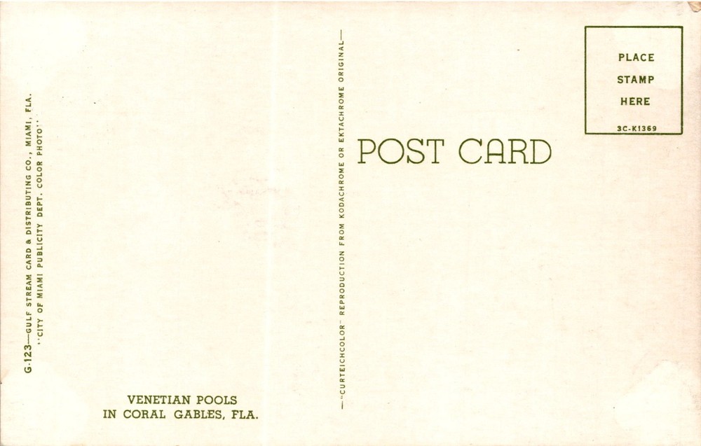This postcard features a color photo from the City of Miami Publicity Department, showcasing the Venetian Pools in Coral Gables, Florida. The image is a Curteichcolor reproduction from an original Kodachrome or Ektachrome photograph. The postcard is produced by G.123-Gulf Stream Card & Distributing Co.